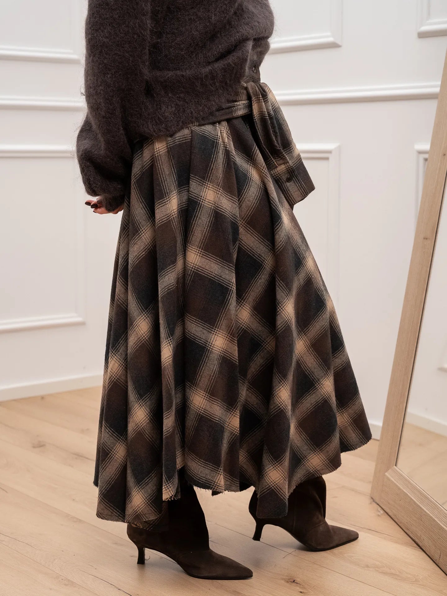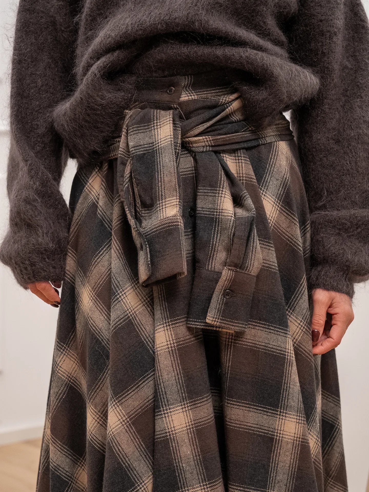 Gonna fantasia sui toni del moro Dixie. Modello a ruota fit morbido svasato sul fondo a vita alta, dettaglio camicia frontale. Chiusura con bottoni frontali su tutta la lunghezza.