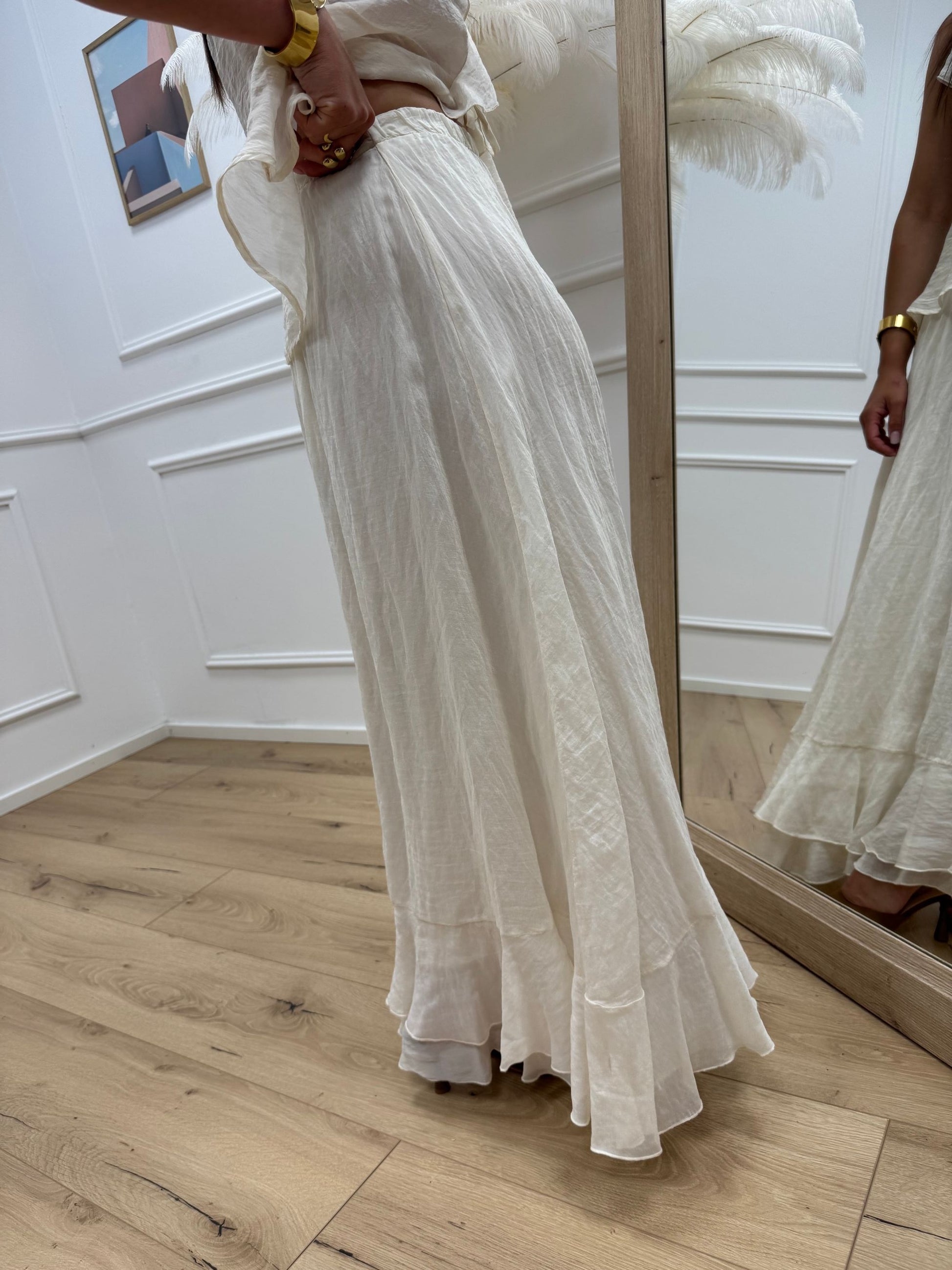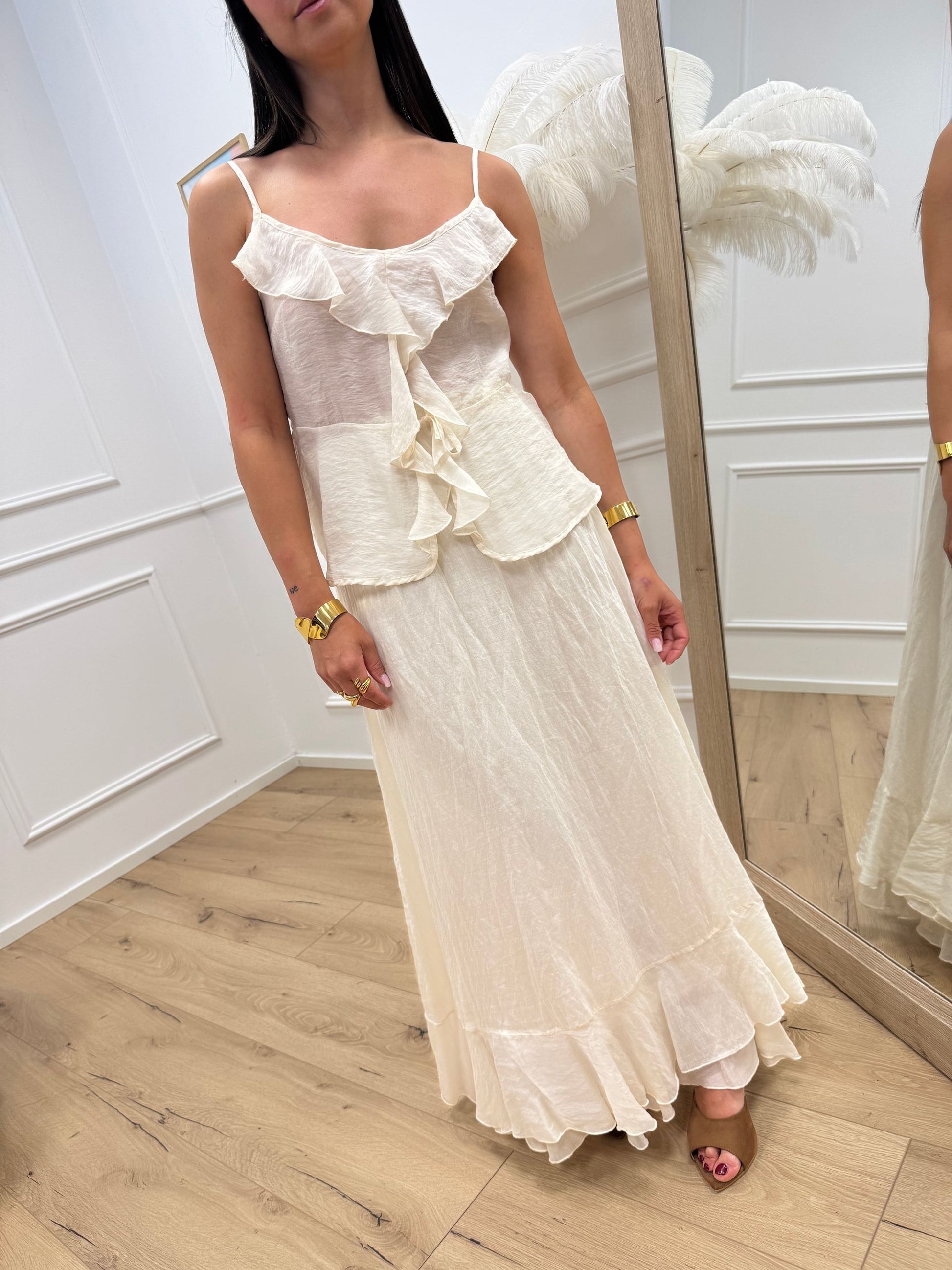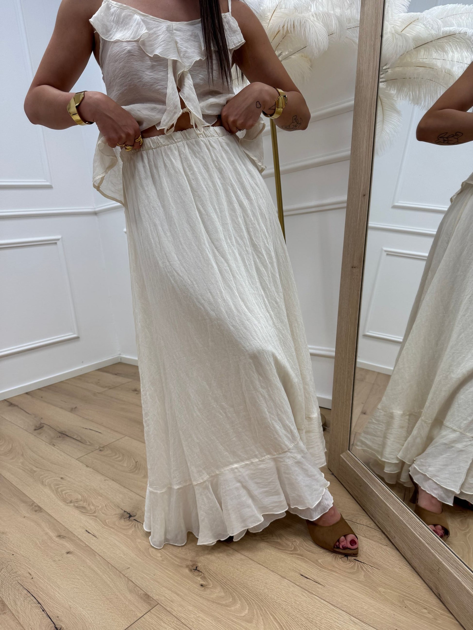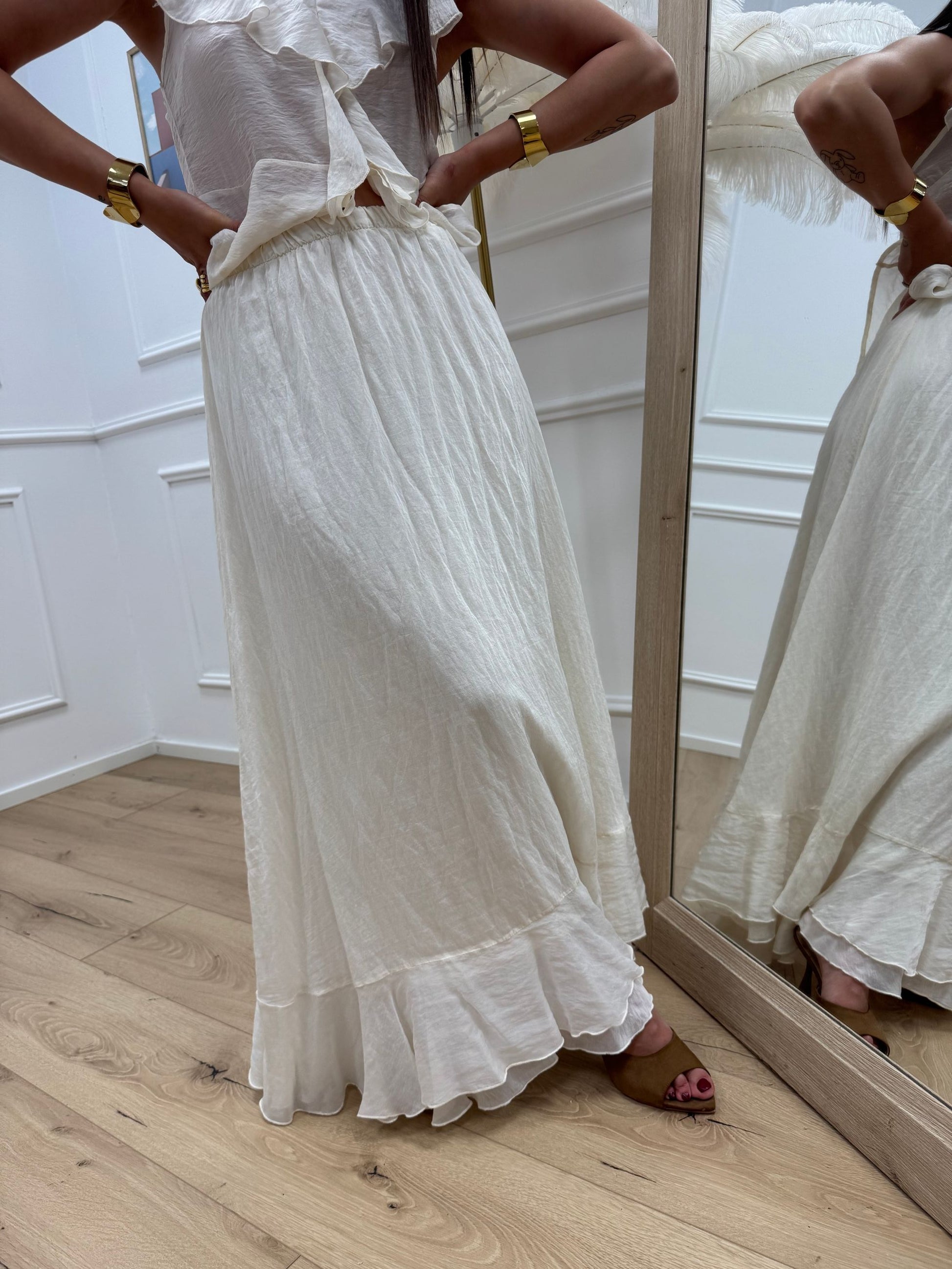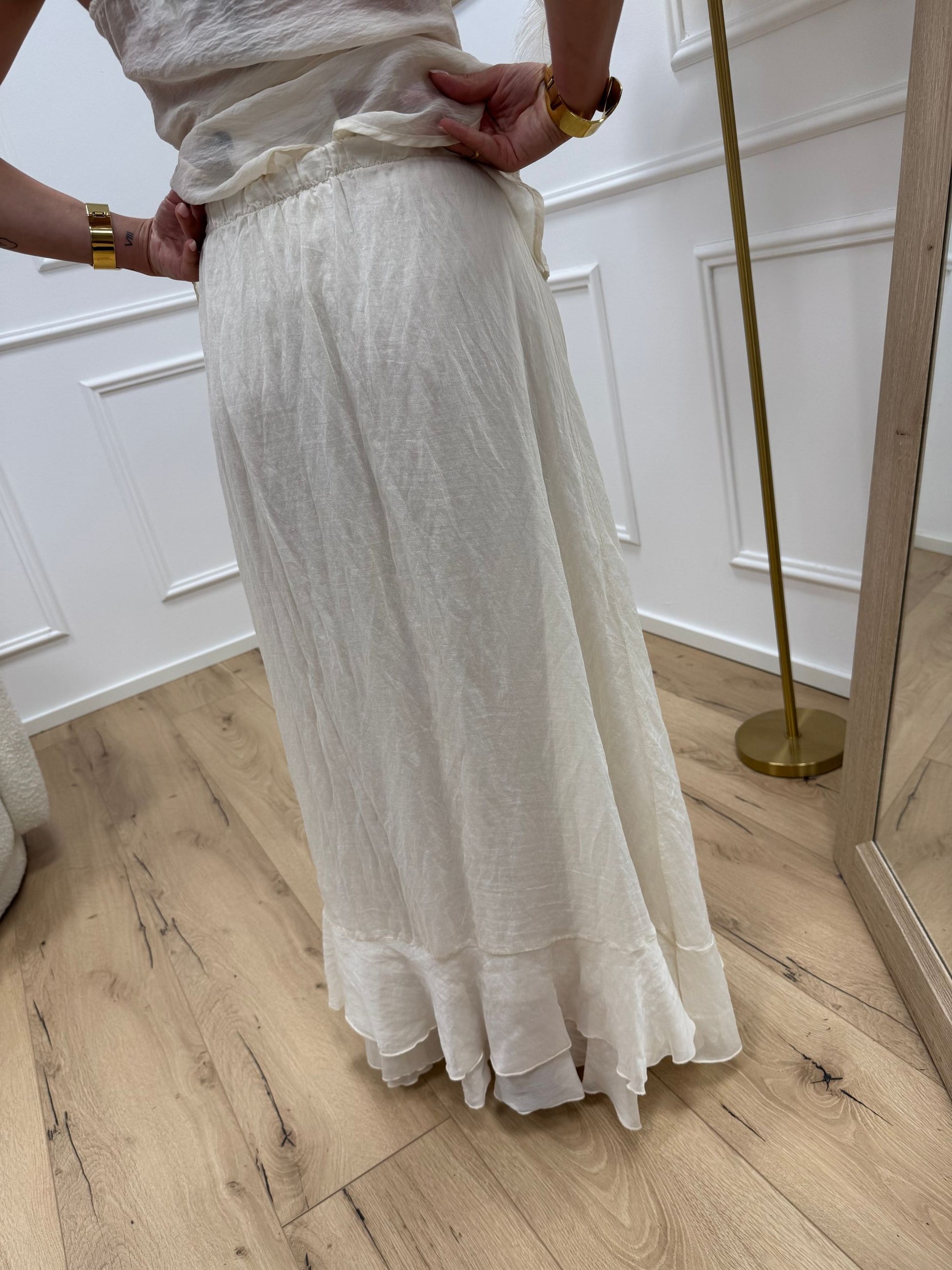Gonna color burro in lyocell HaveOne. Modello lunga con vita alta elasticizzata e balze sul fondo.