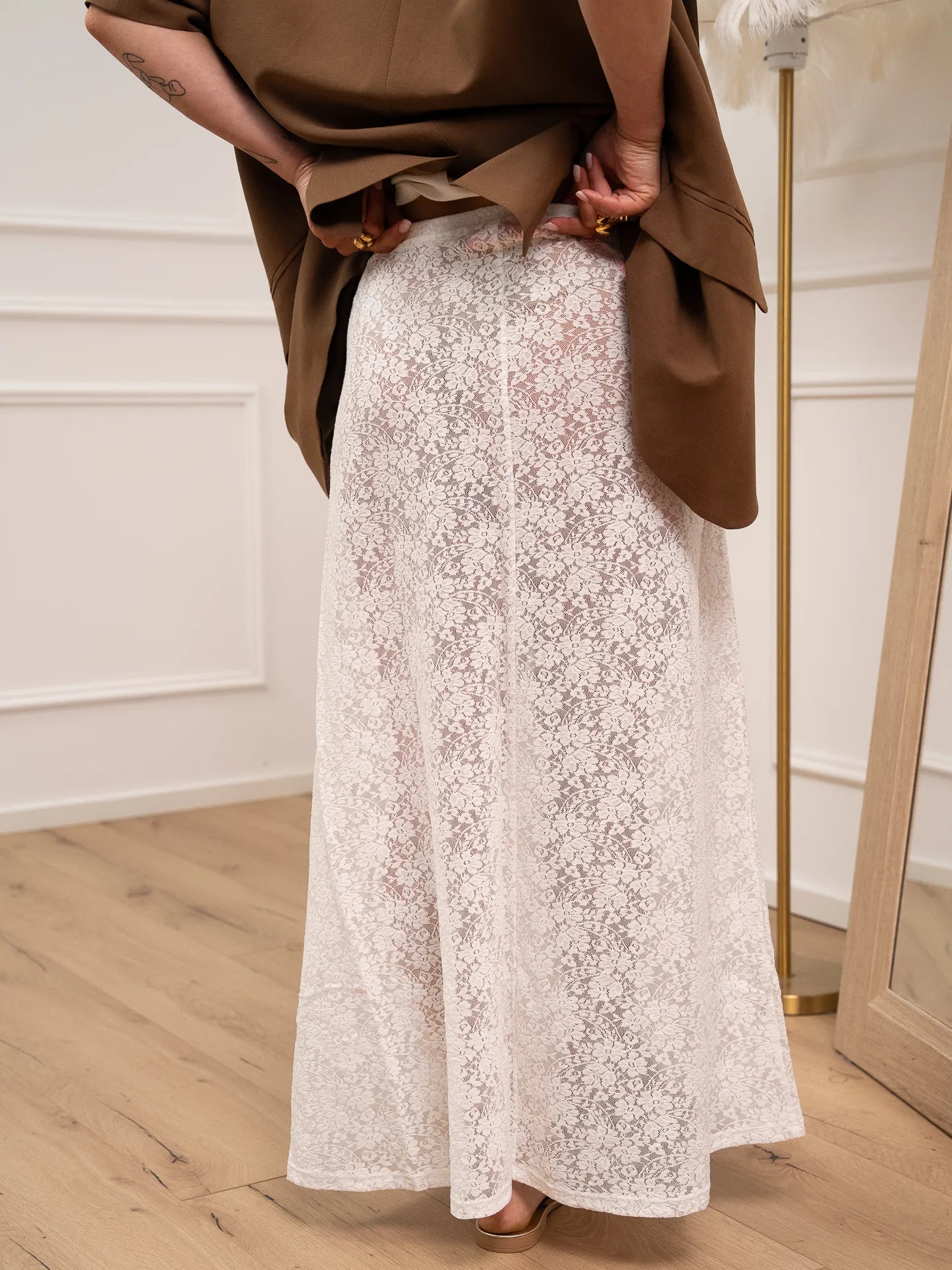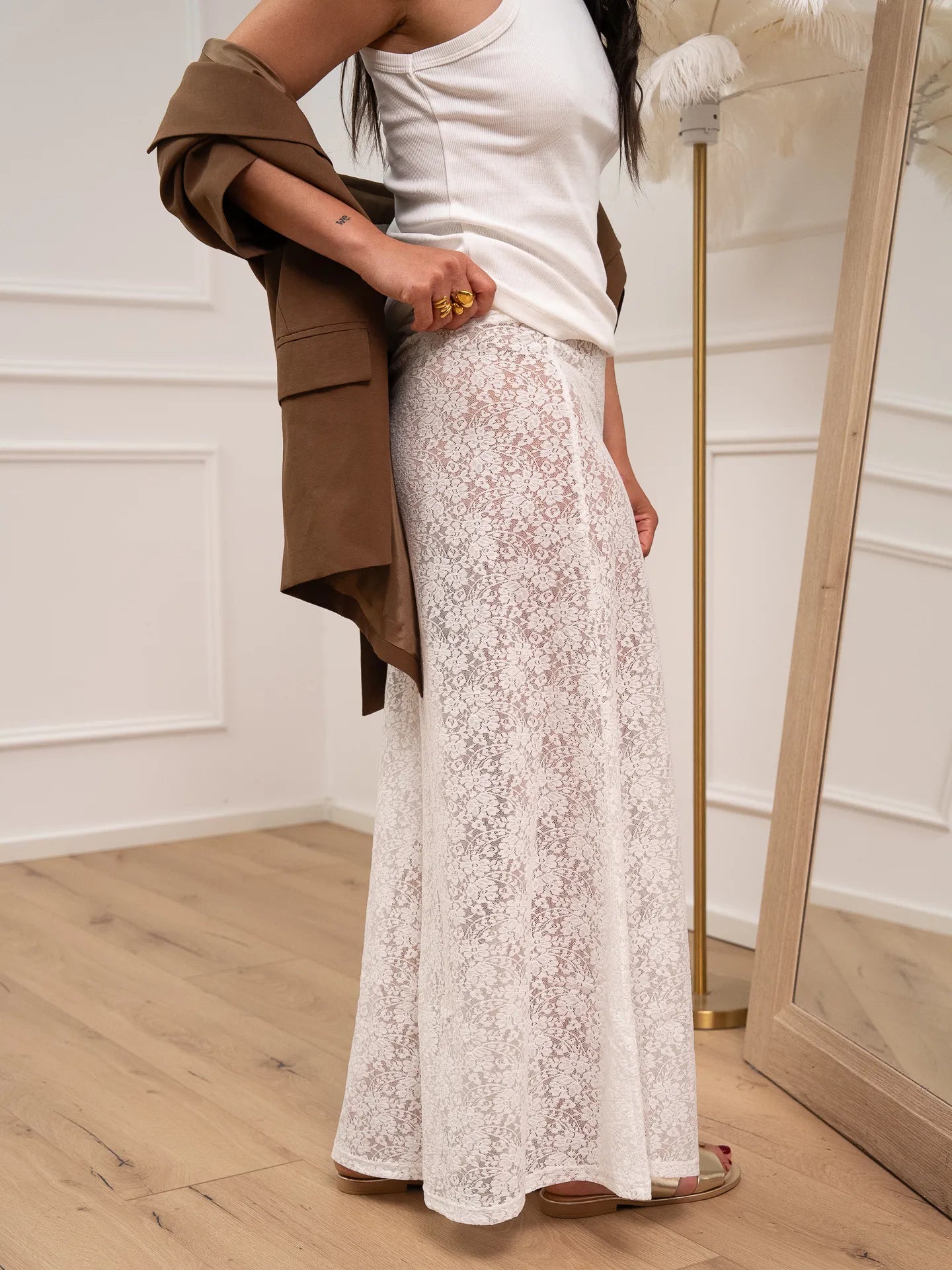 Gonna bianca in pizzo JJXX. Modello lungo fit morbido leggermente svasato sul fondo. Vita media con elastico.