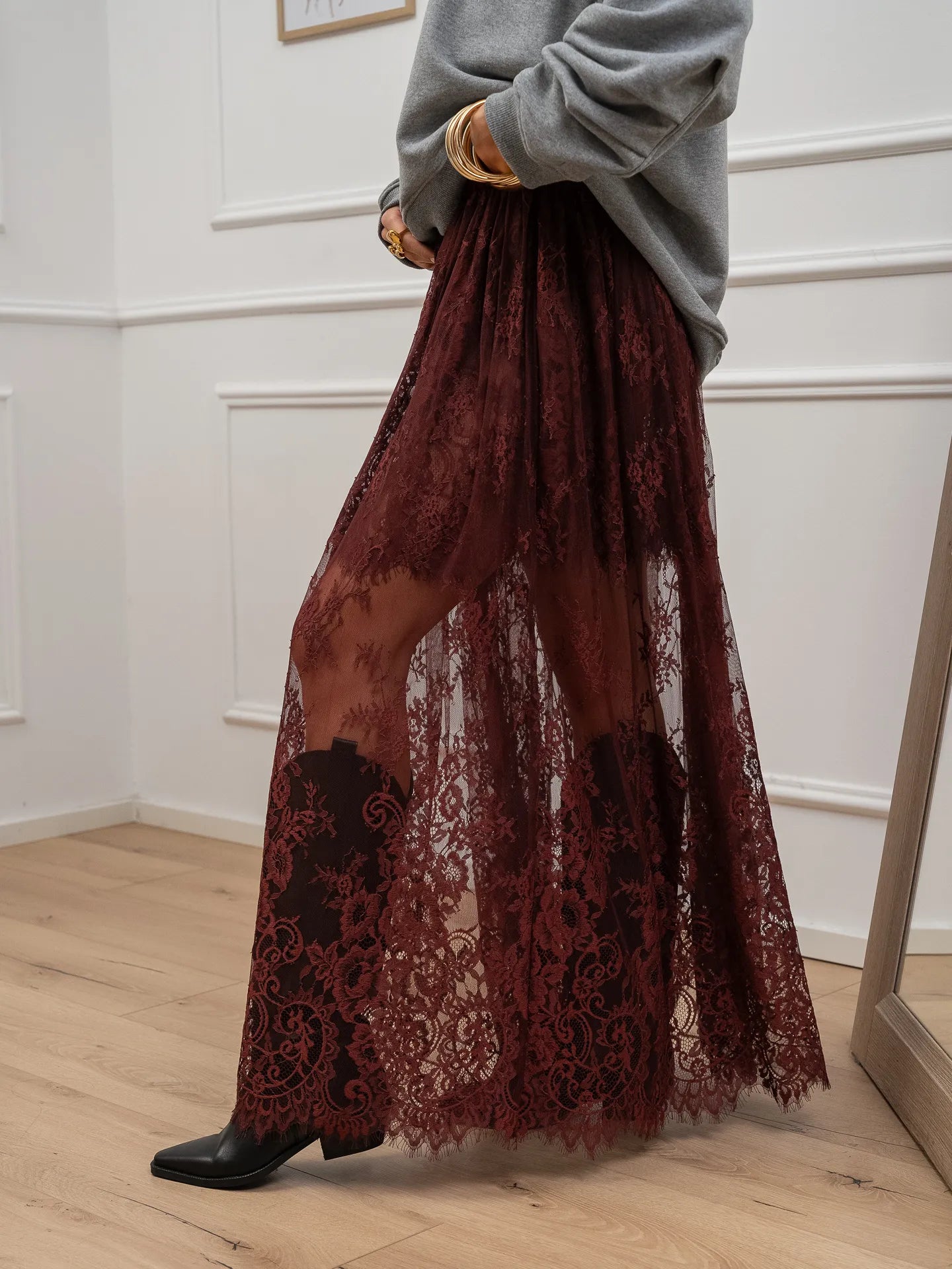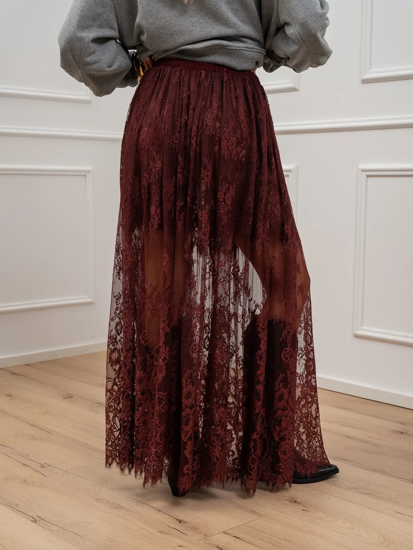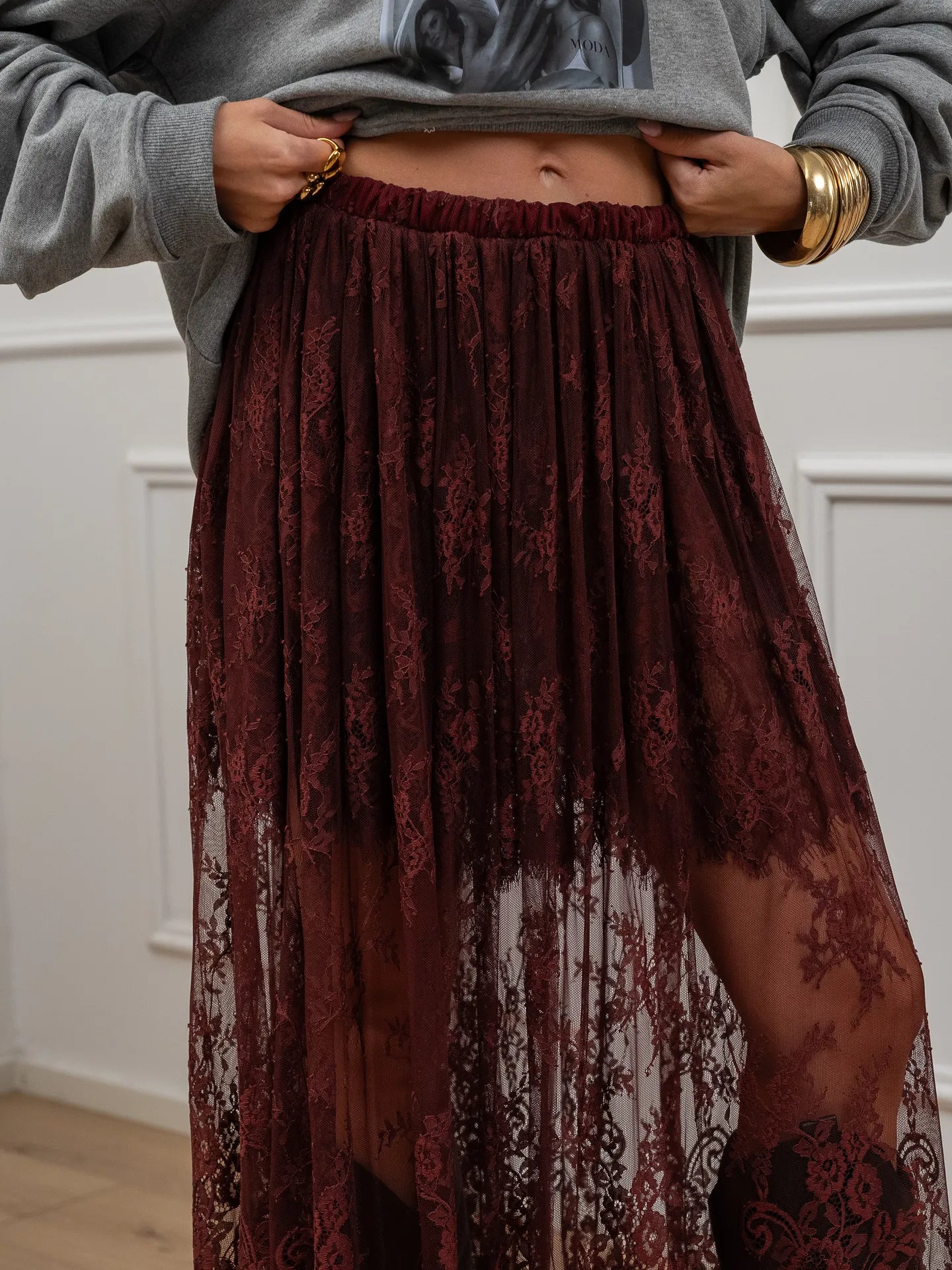 Gonna in pizzo color bordeaux Vicolo. Modello lungo con vita elasticizzata. Doppia gonna mini.