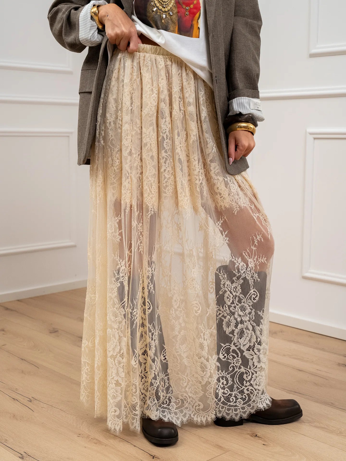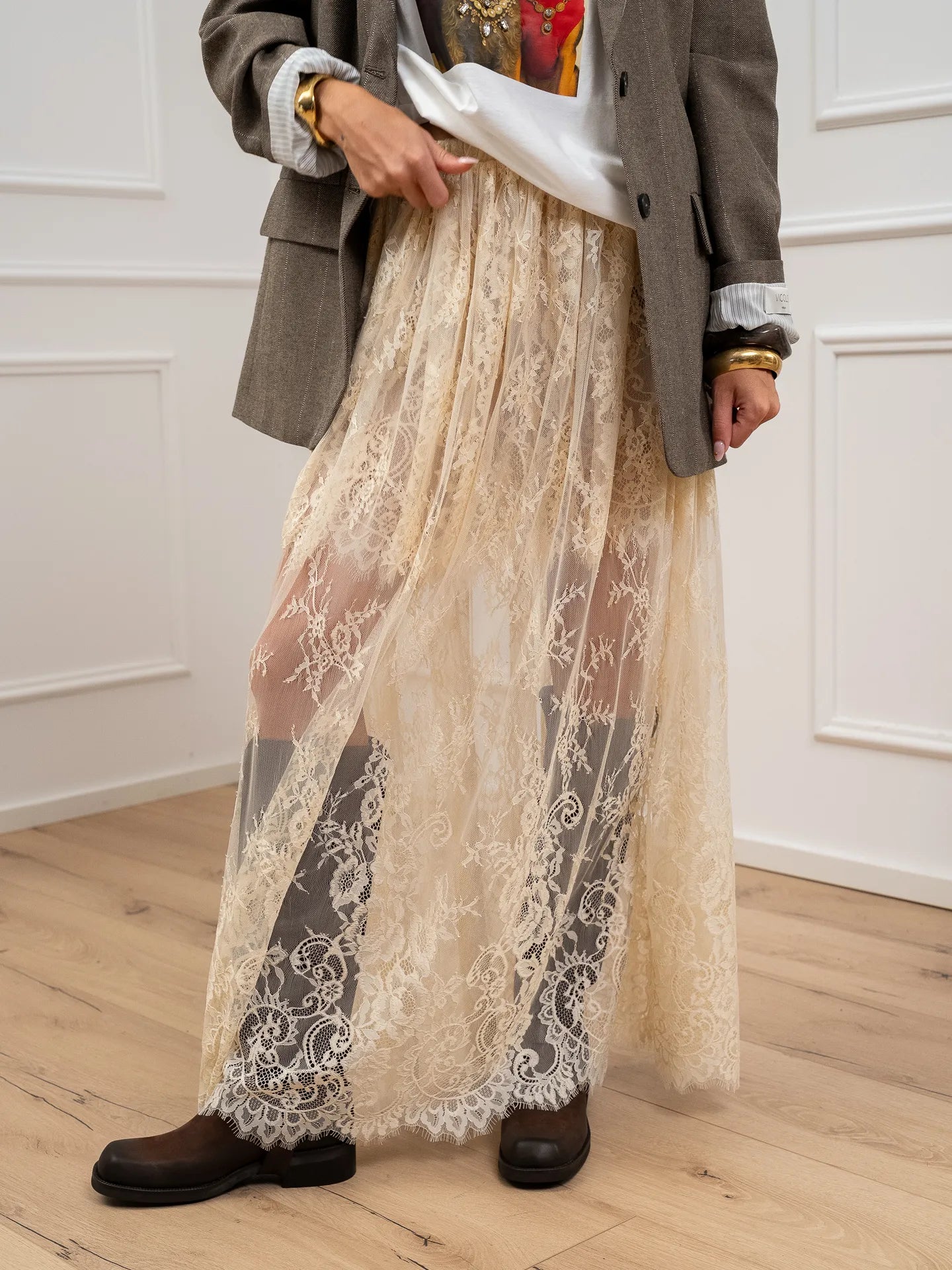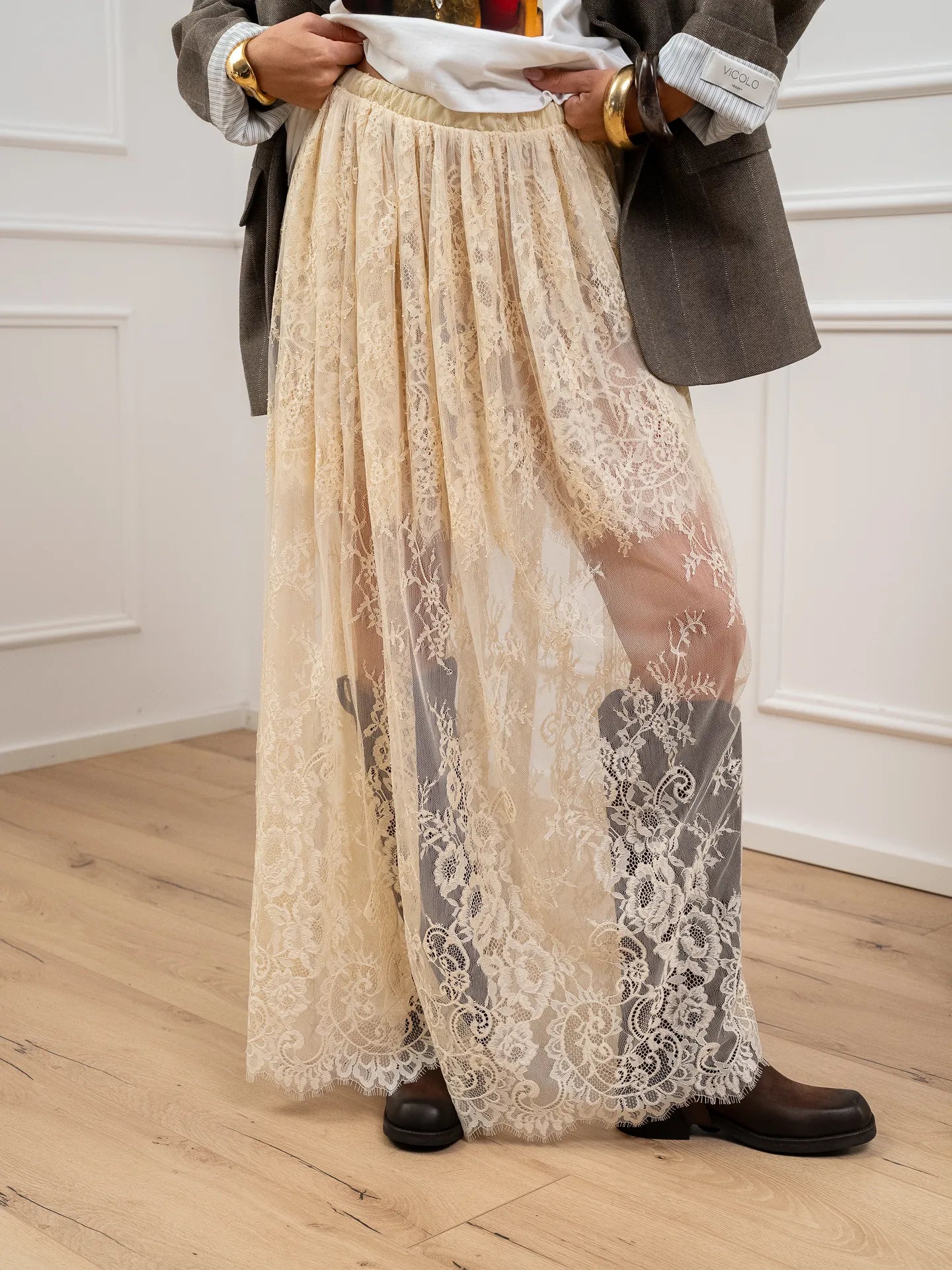 Gonna in pizzo color burro Vicolo. Modello lungo con vita elasticizzata. Doppia gonna mini.