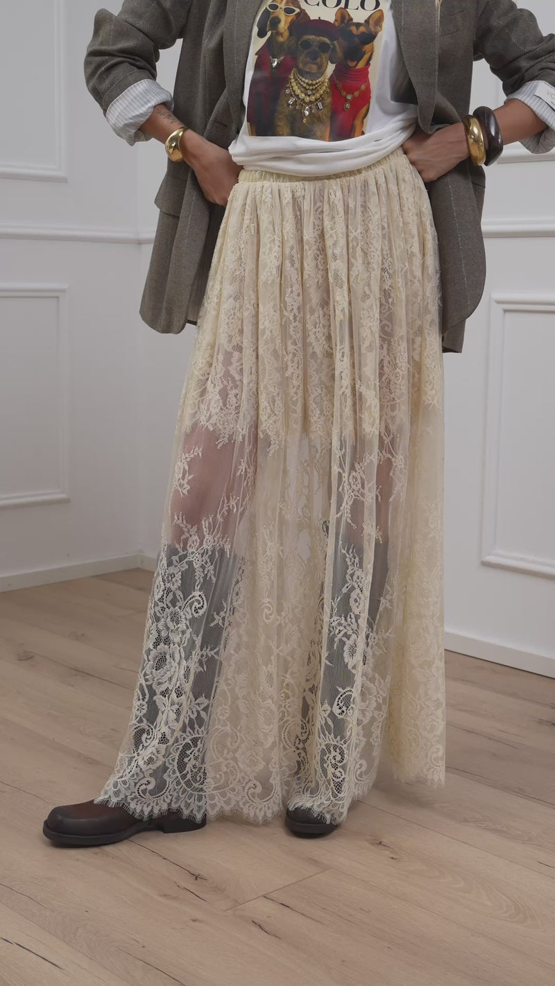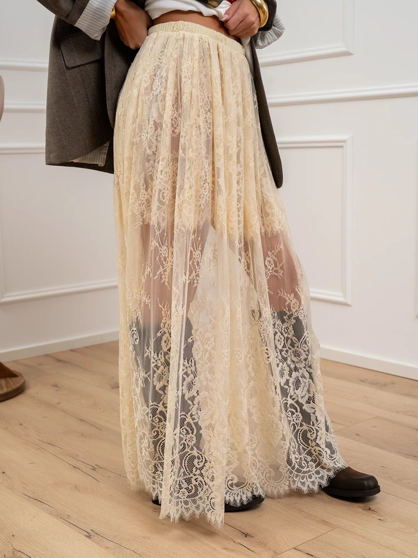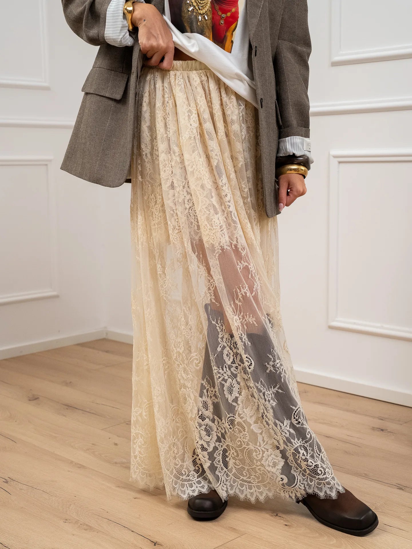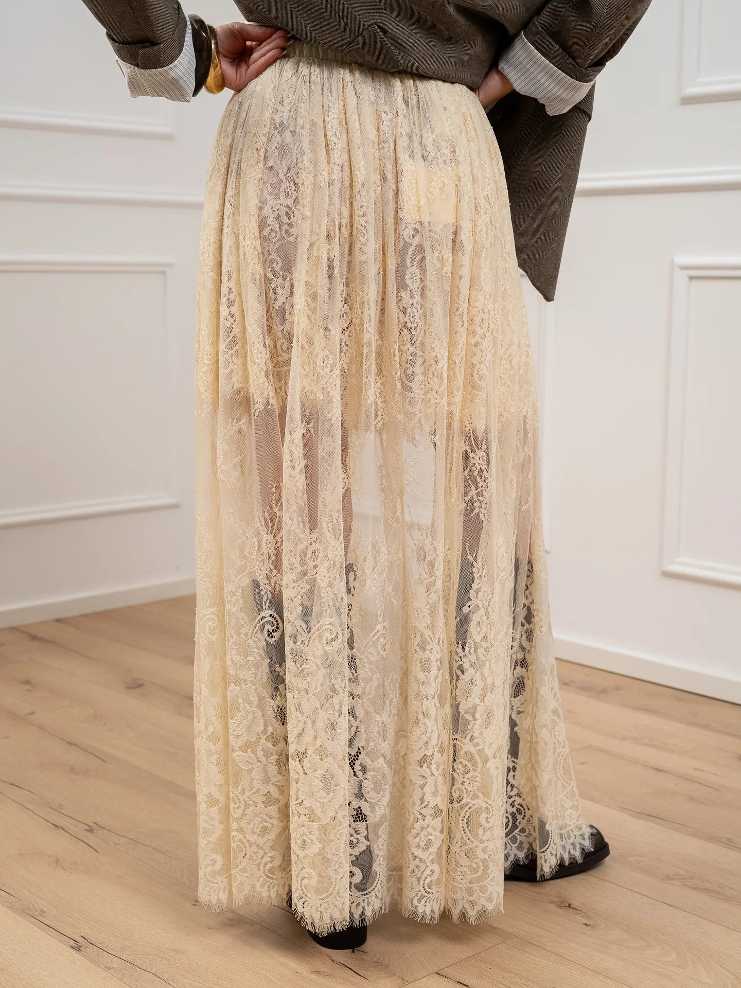 Gonna in pizzo color burro Vicolo. Modello lungo con vita elasticizzata. Doppia gonna mini.