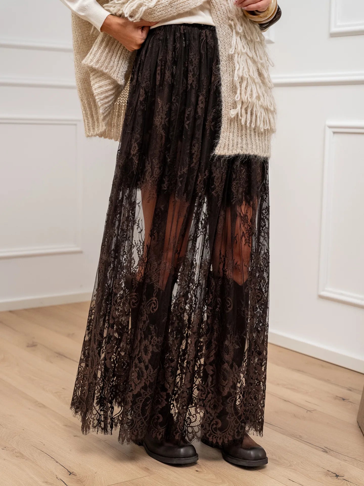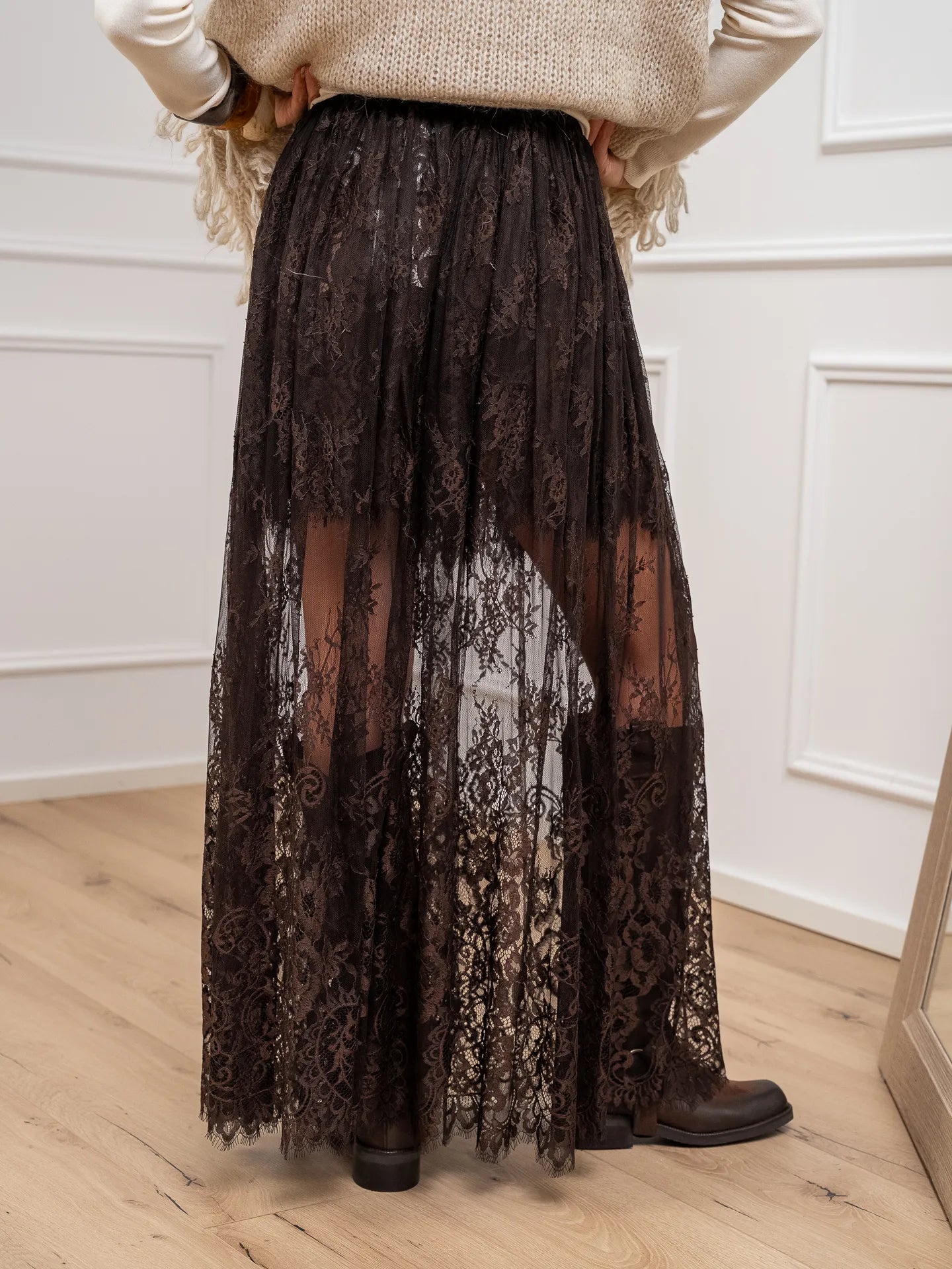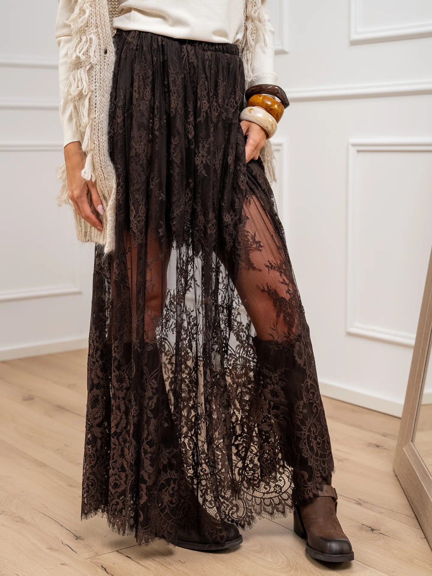 Gonna in pizzo color moro Vicolo. Modello lungo con vita elasticizzata. Doppia gonna mini.
