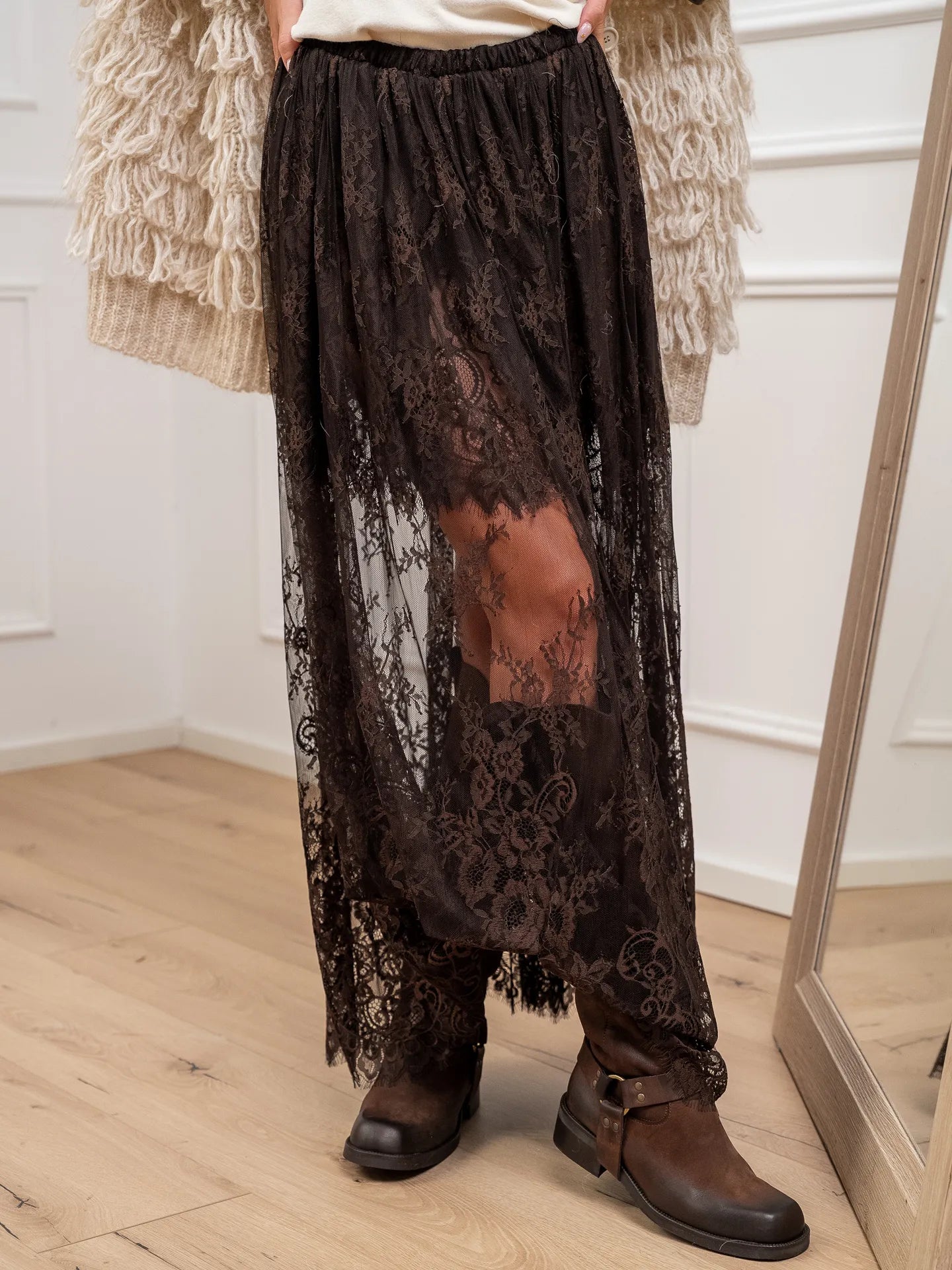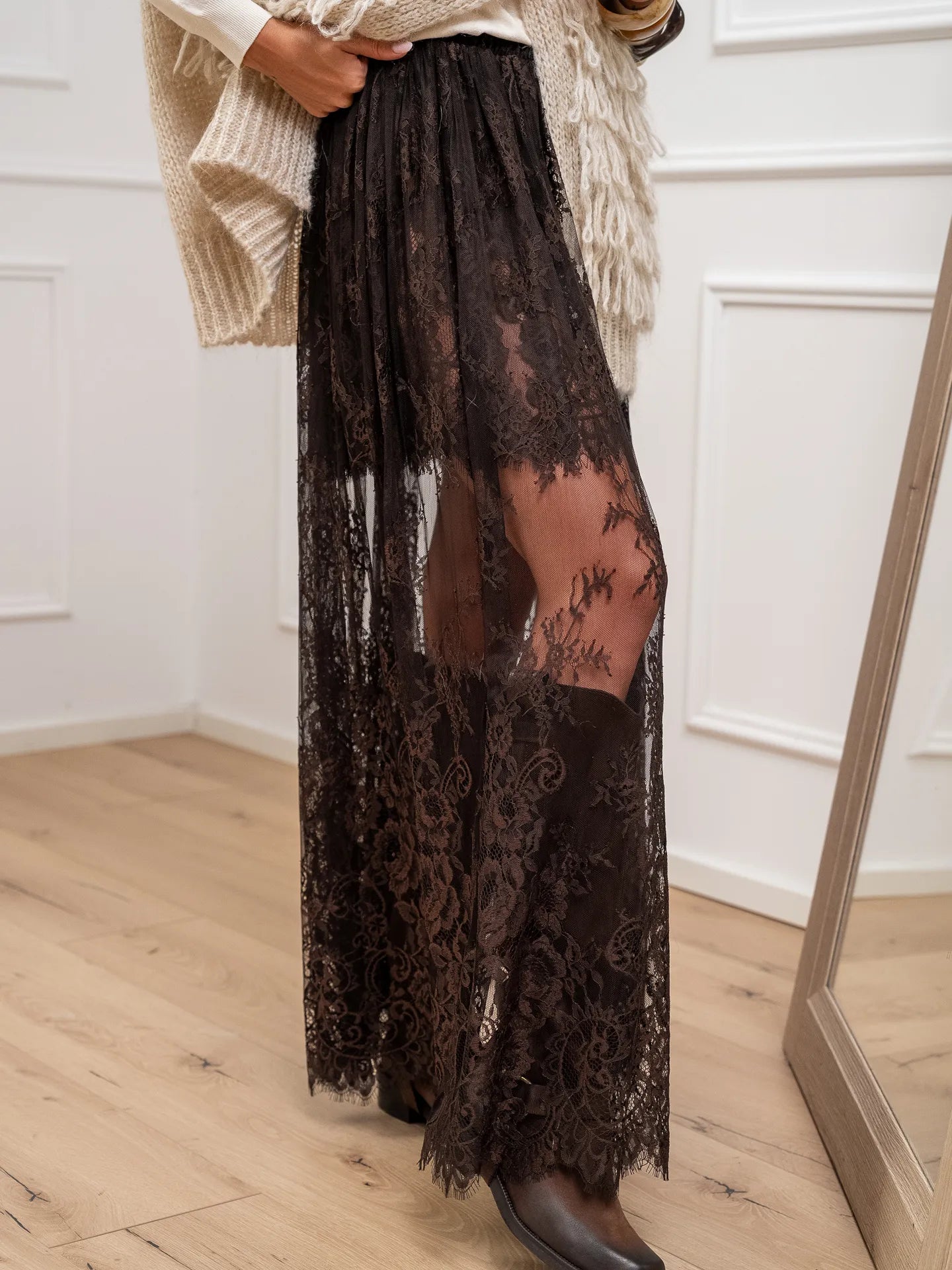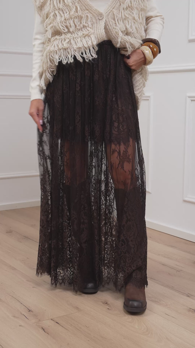 Gonna in pizzo color moro Vicolo. Modello lungo con vita elasticizzata. Doppia gonna mini.