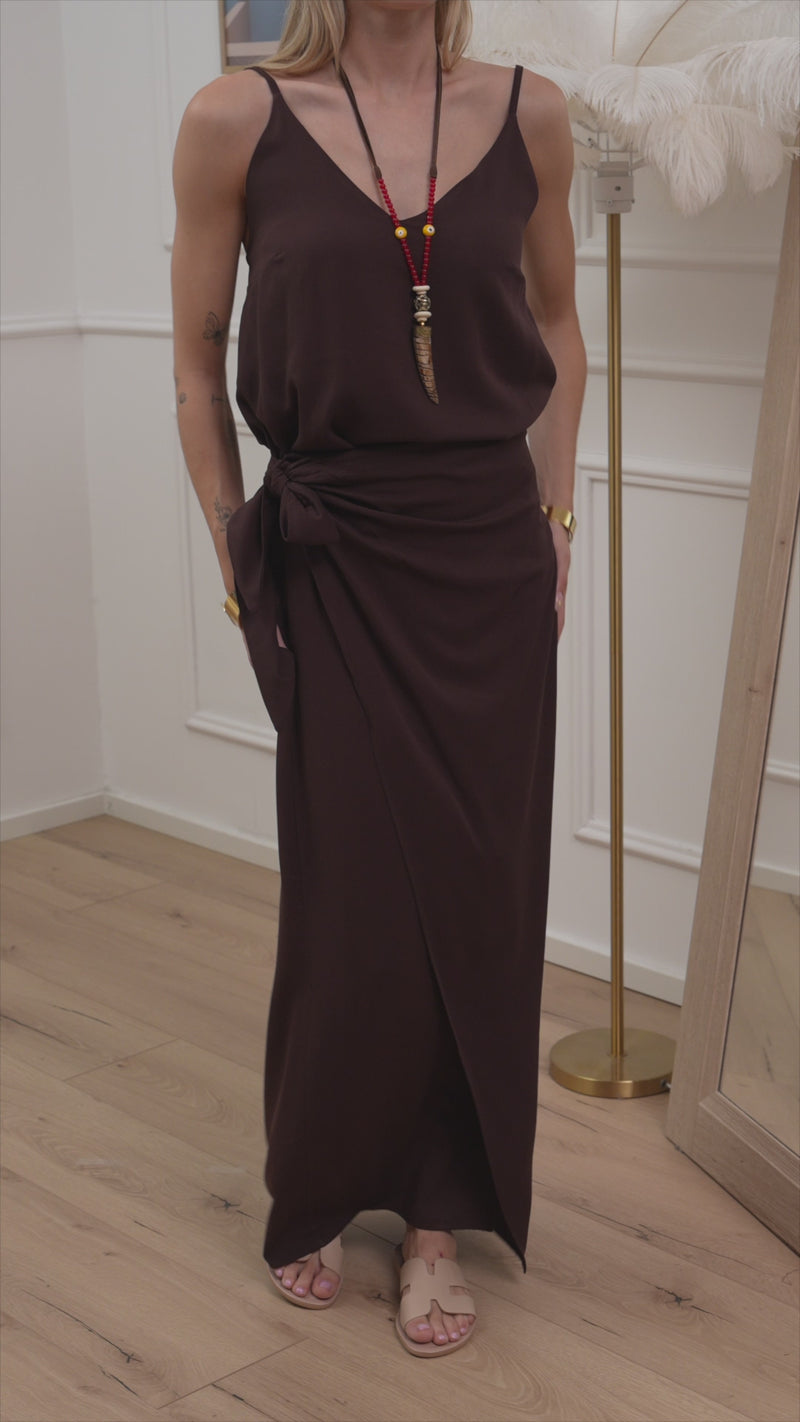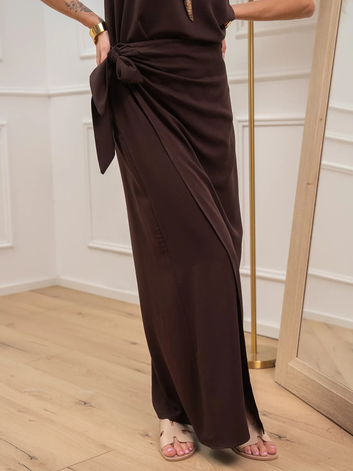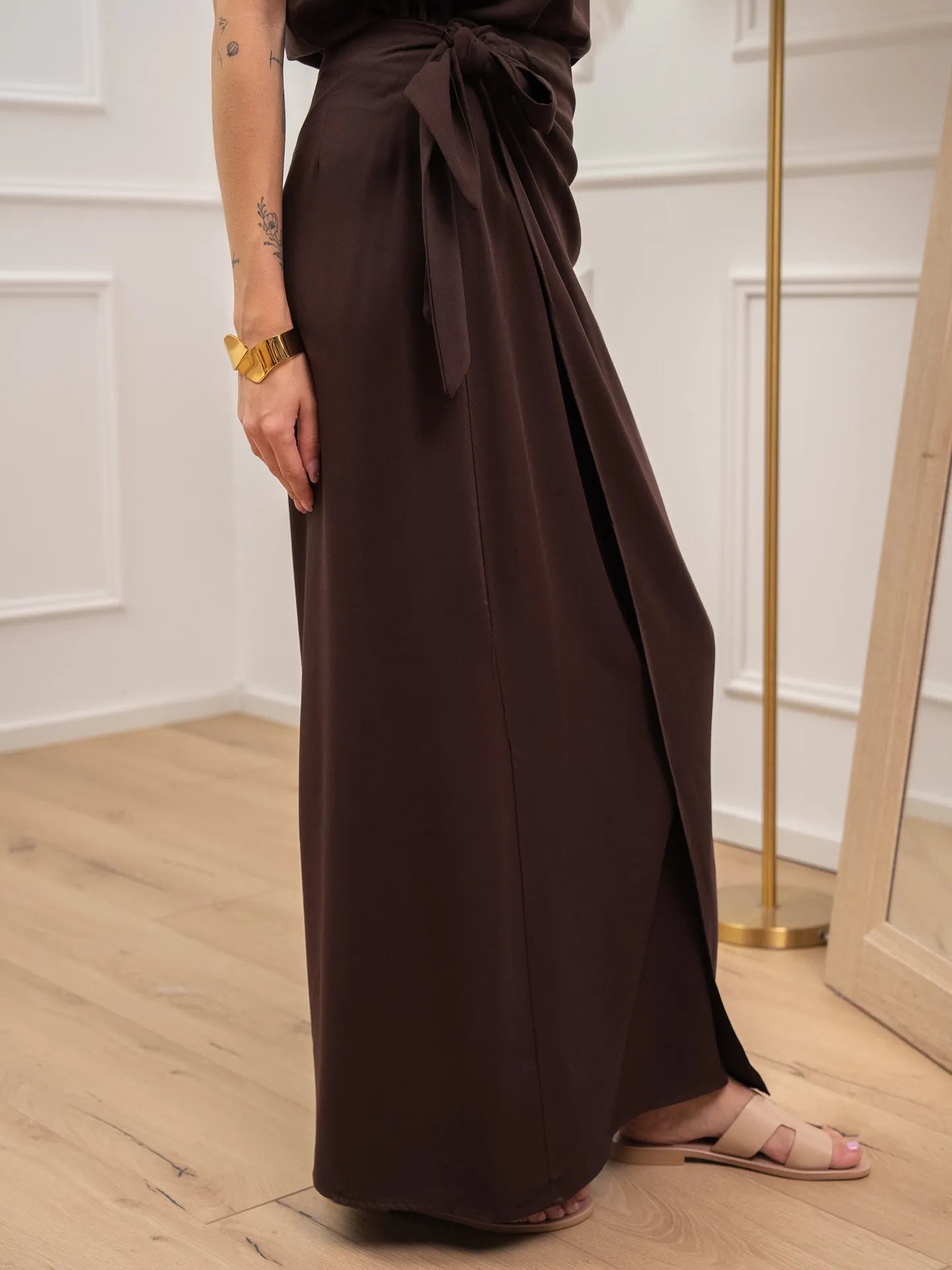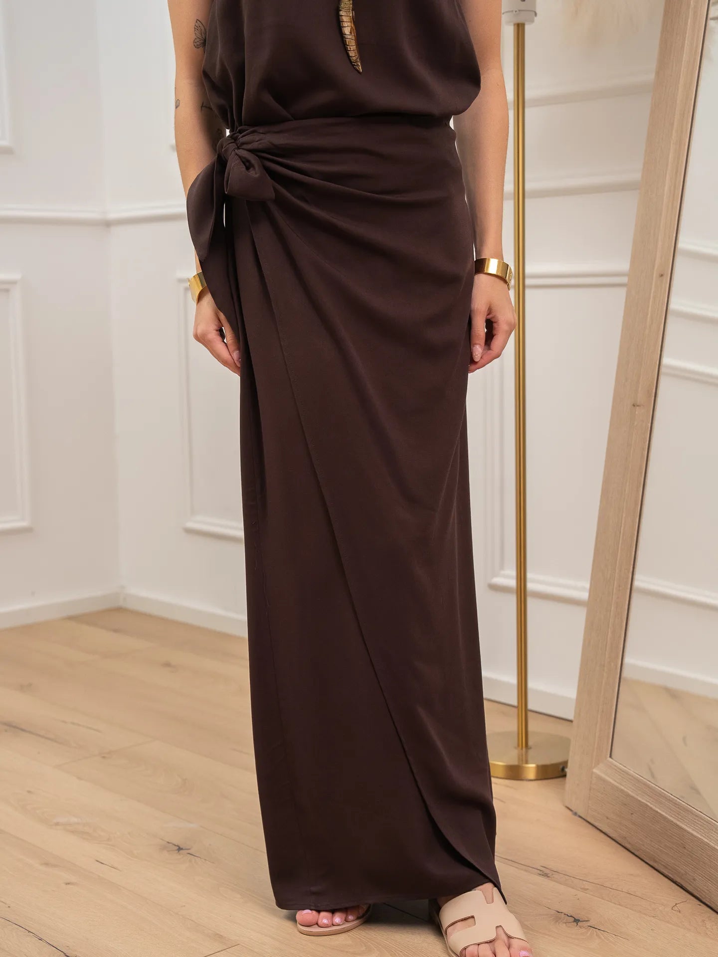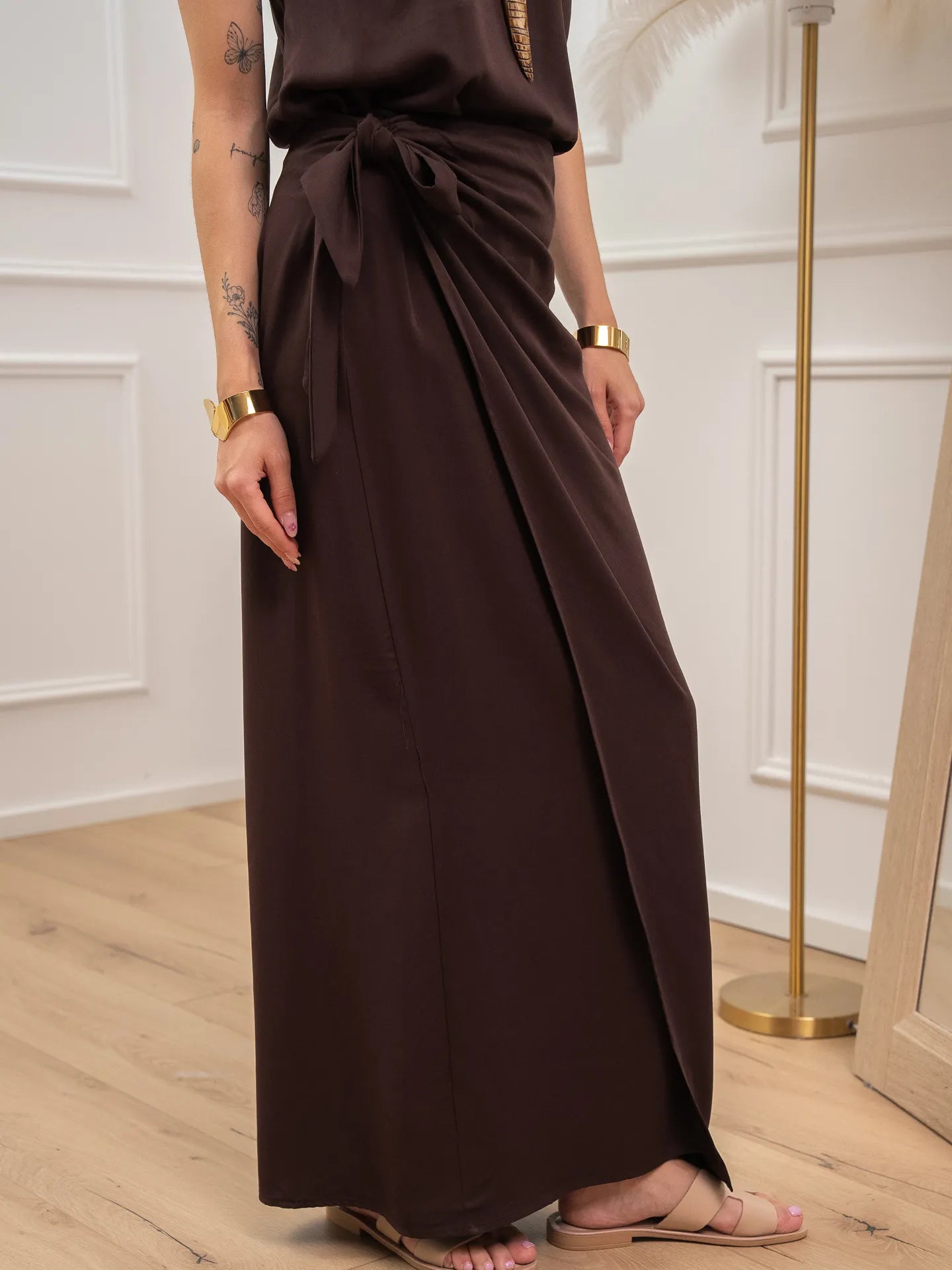 Gonna in viscosa color cioccolato HaveOne. Modello lungo a pareo con doppia chiusura interna ed esterna con laccetti.