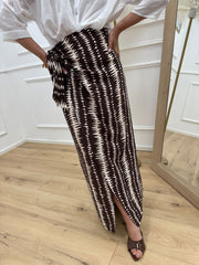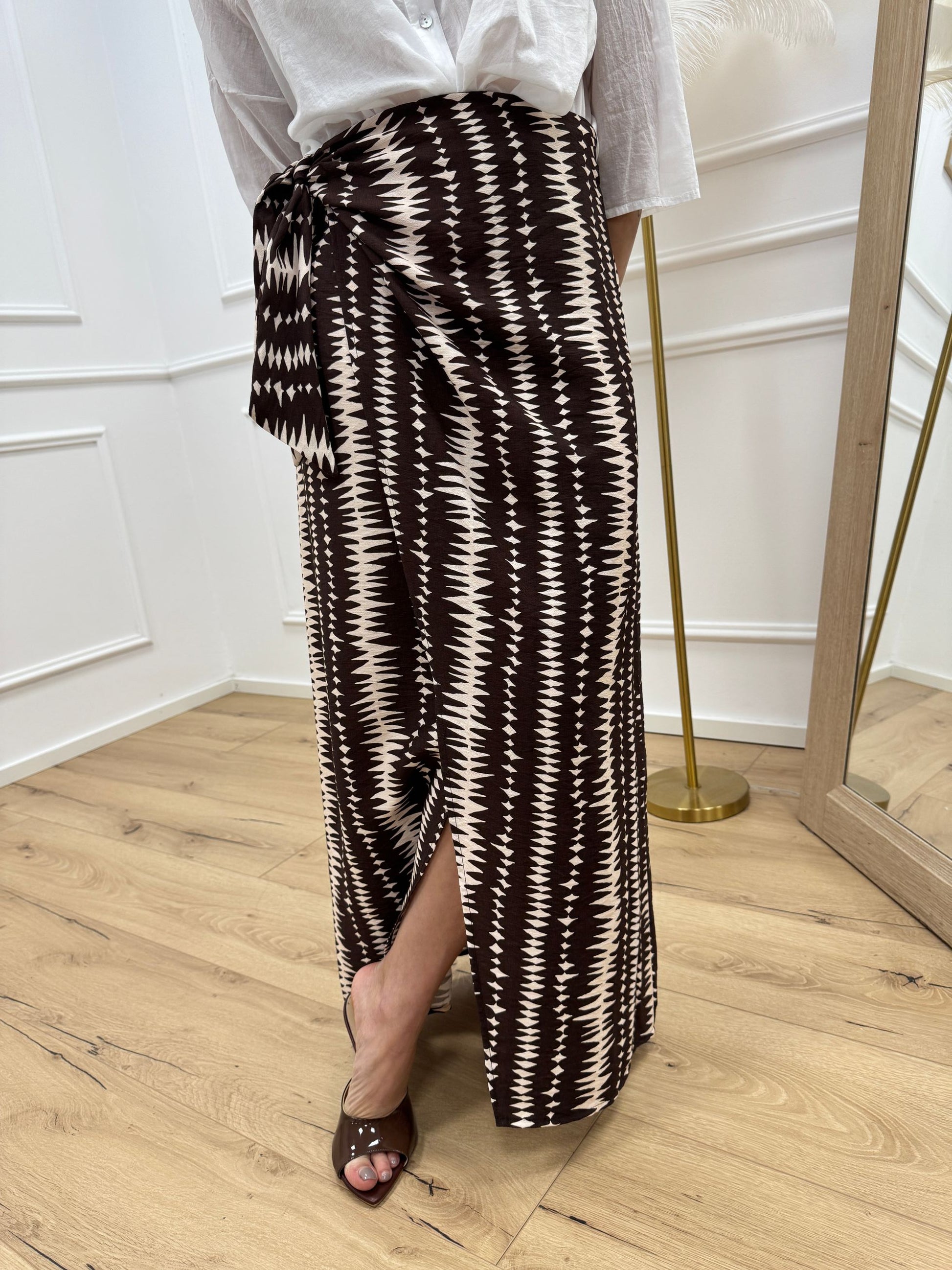 Gonna Tribale choco e panna in viscosa HaveOne. Modello basic lungo fit dritto a vita alta con chiusura doppia a portafoglio.