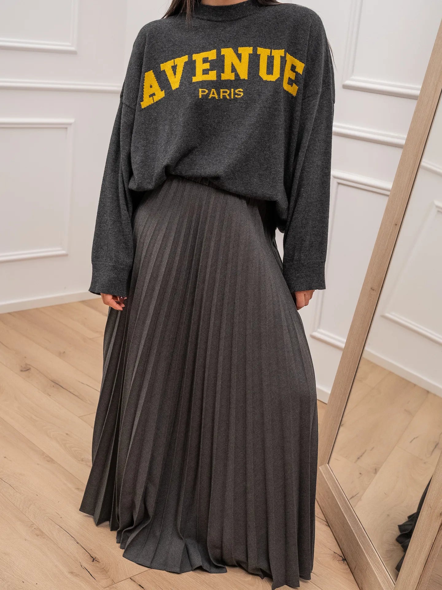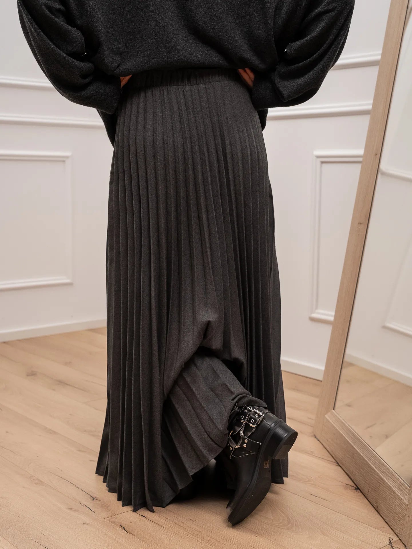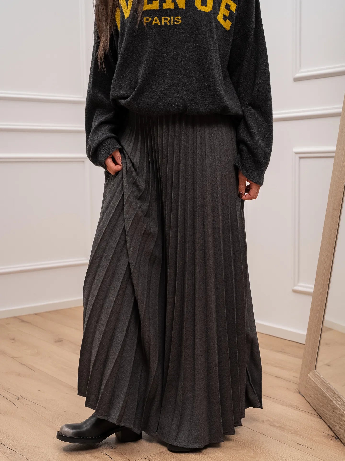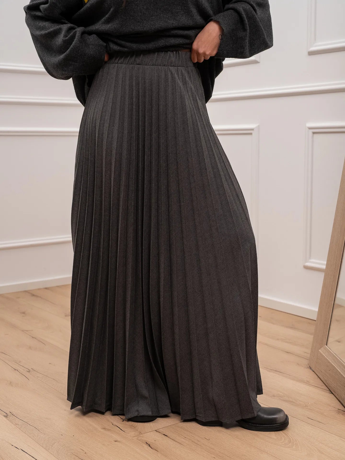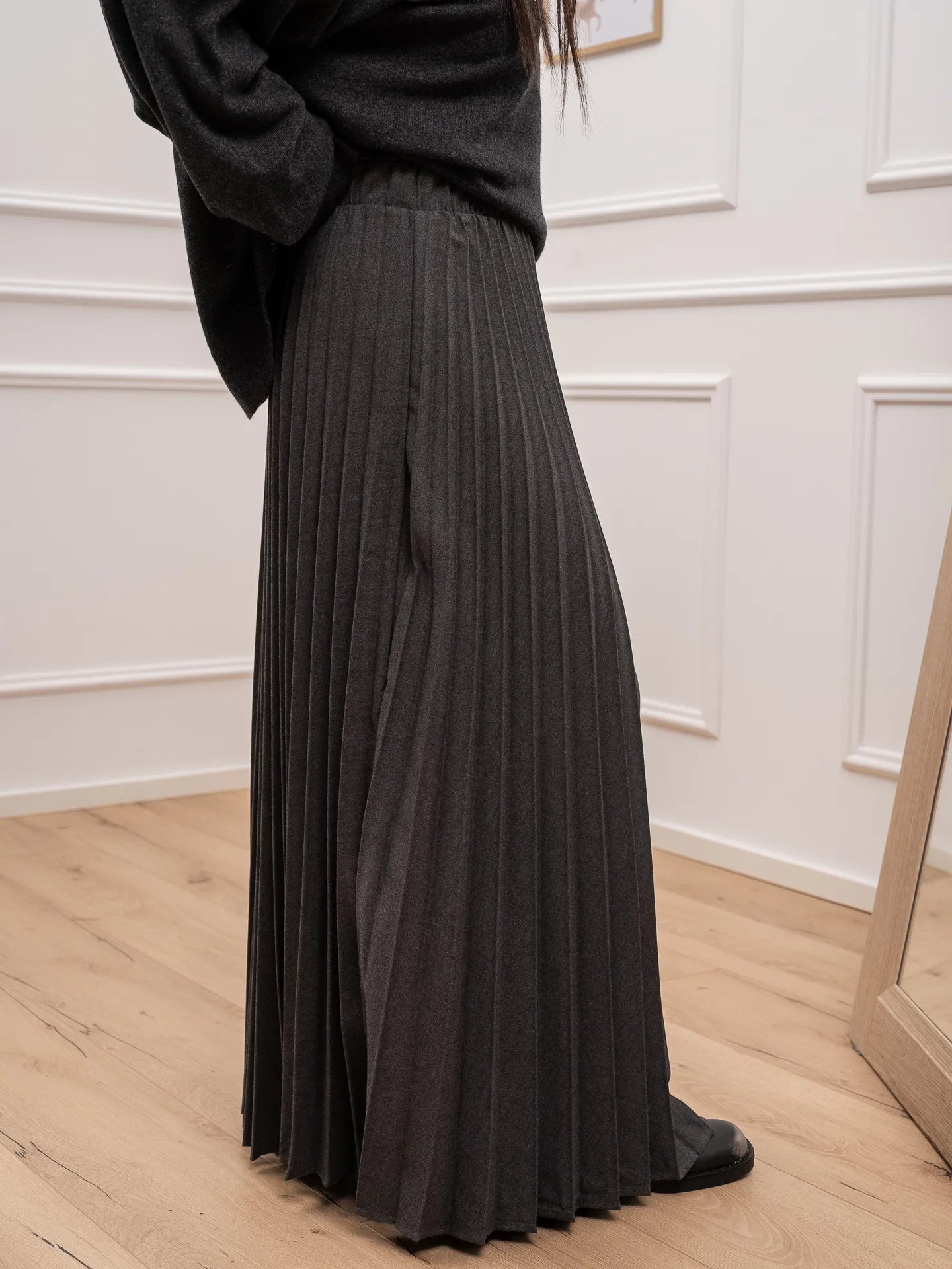Gonna Penelope plisset color grigio Vicolo. Modello fit morbido a ruota con vita alta elasticizzata.