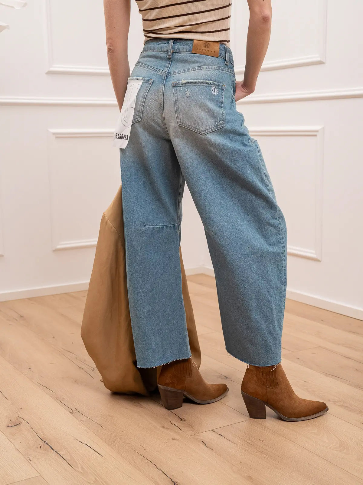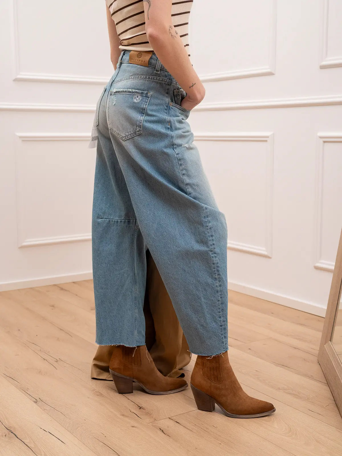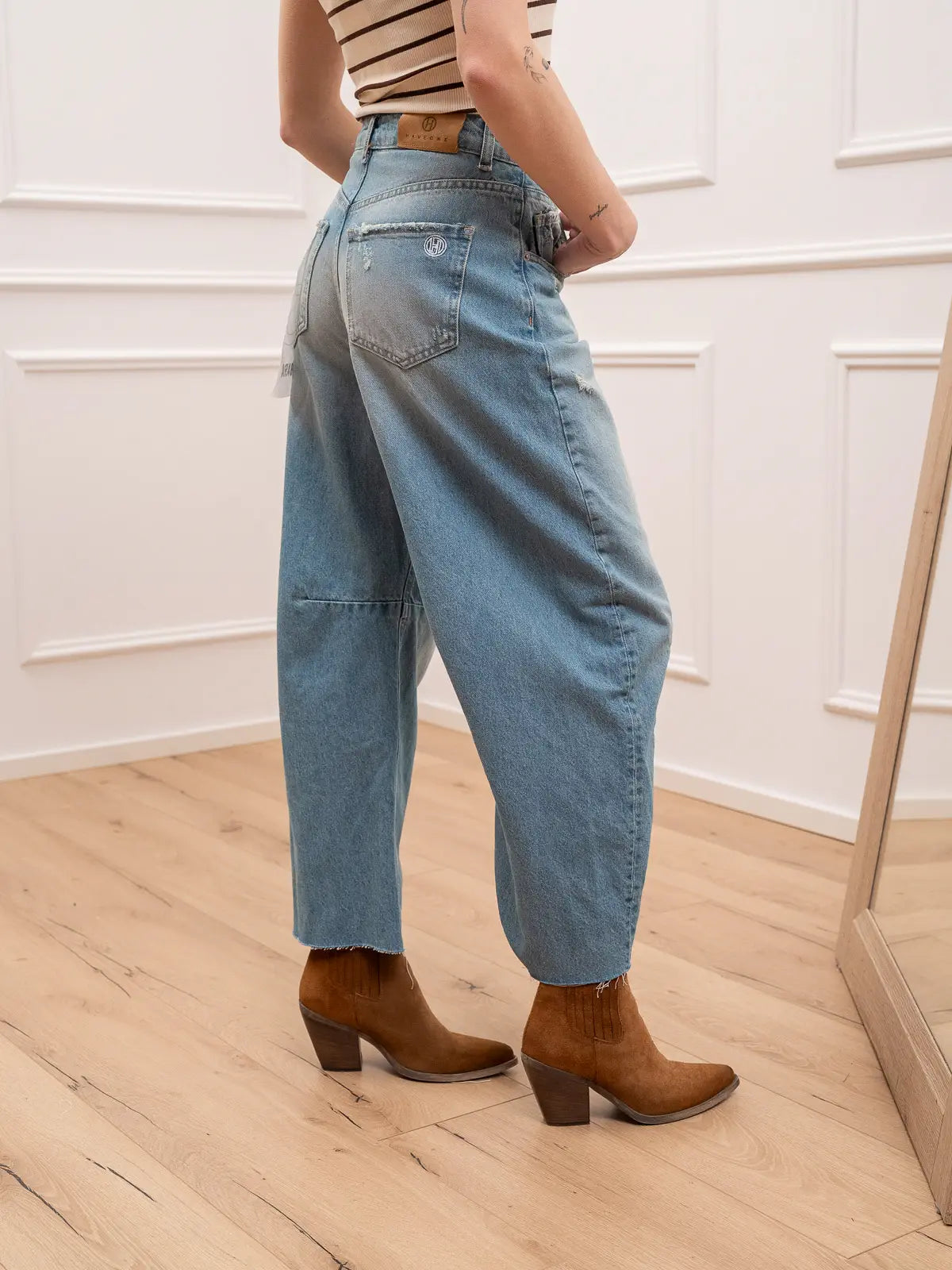 Jeans Barbara denim effetto vintage HaveOne. Modello a ferro di cavallo con pinces sul ginocchio e taglio vivo sul fondo. Dettaglio di piccole rotture.