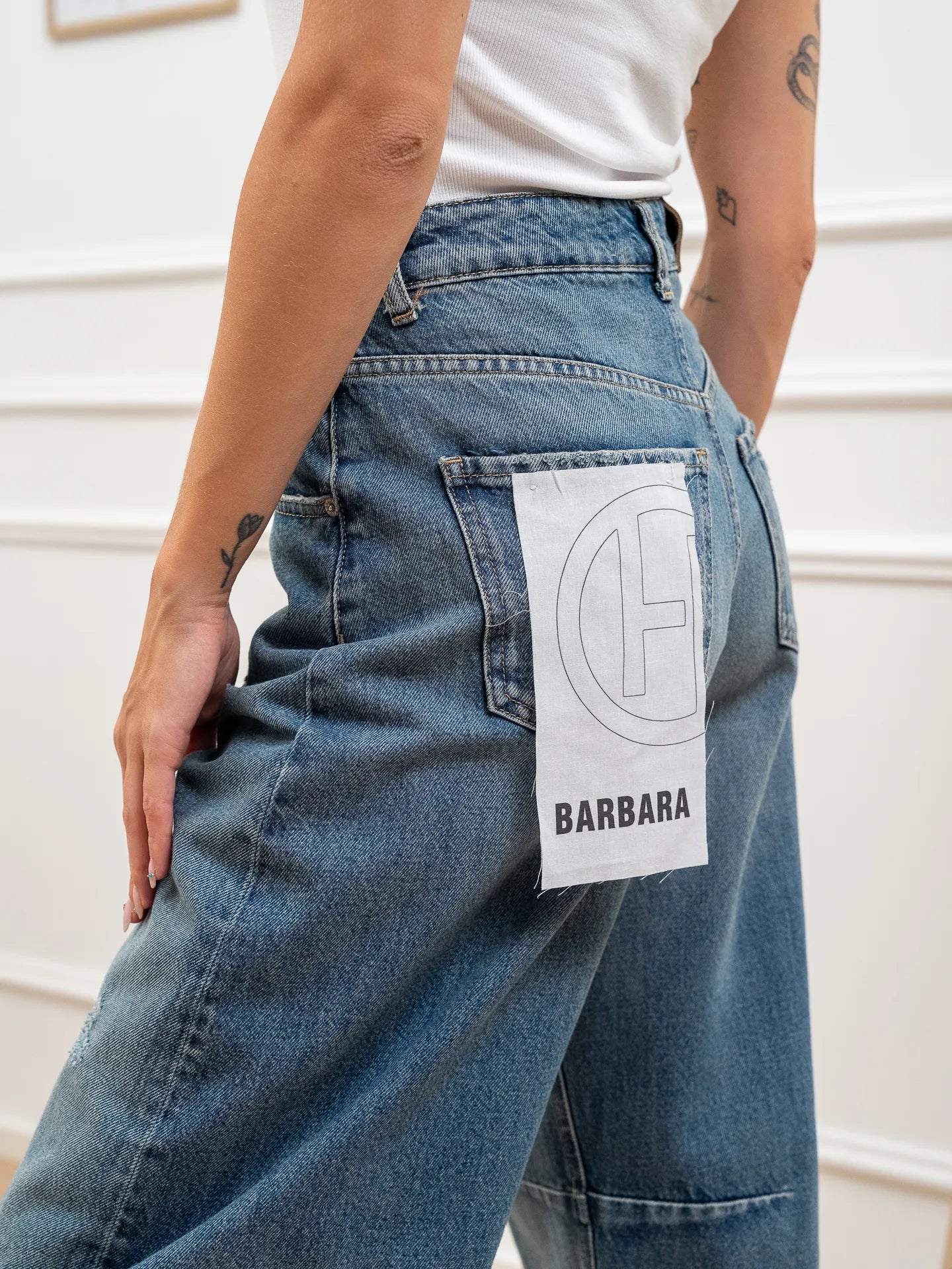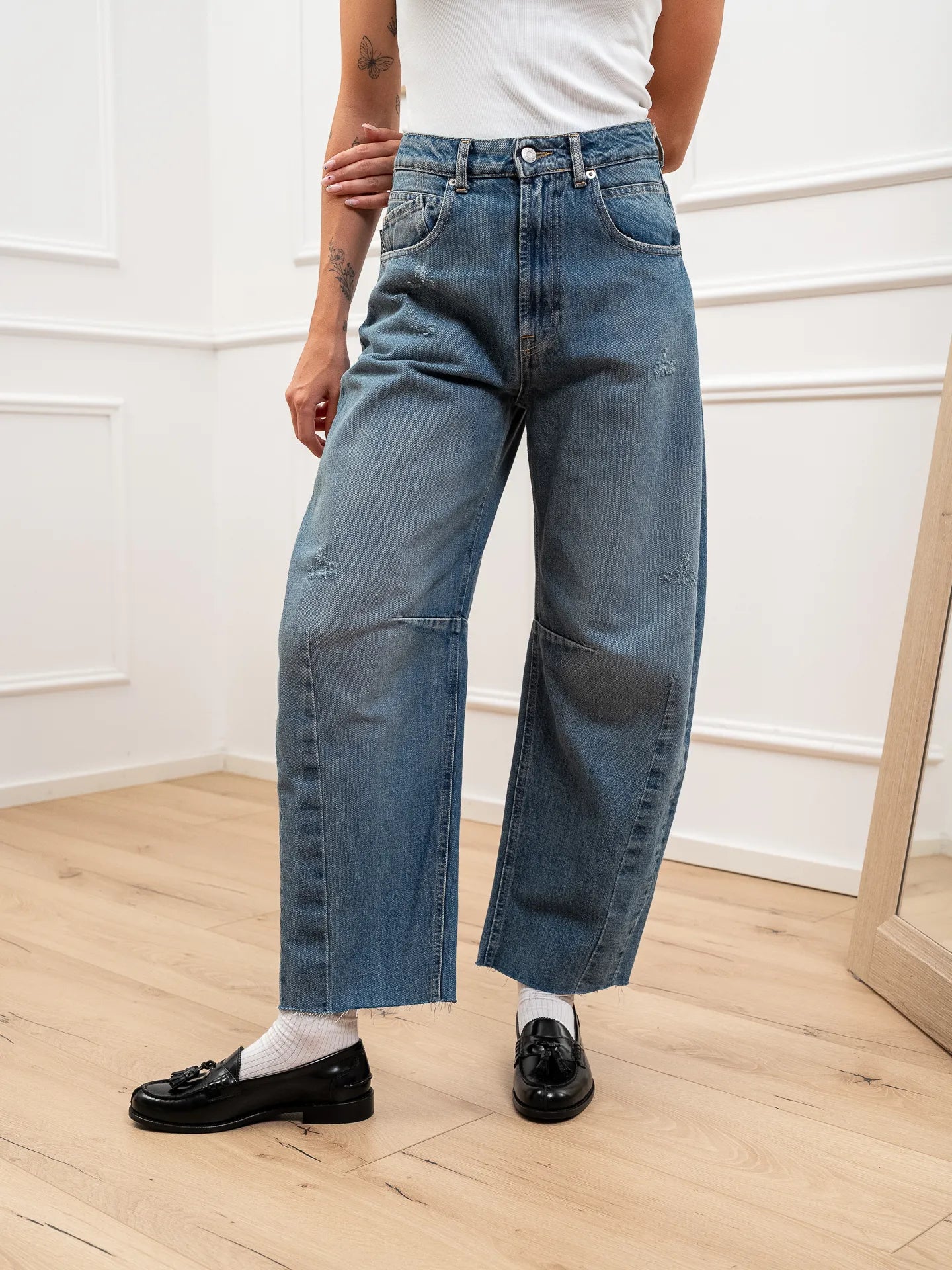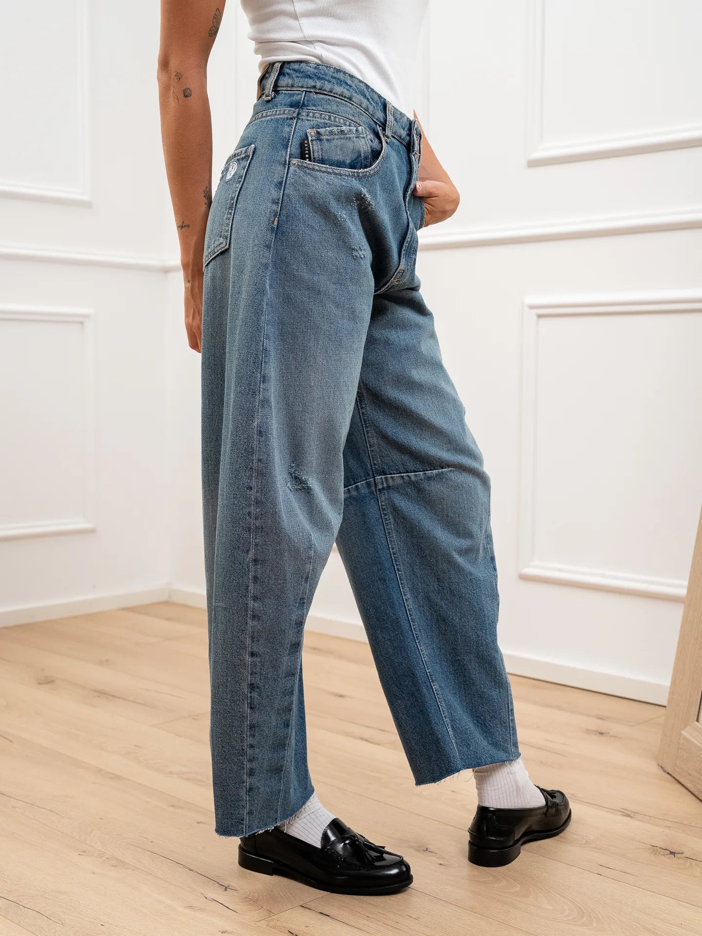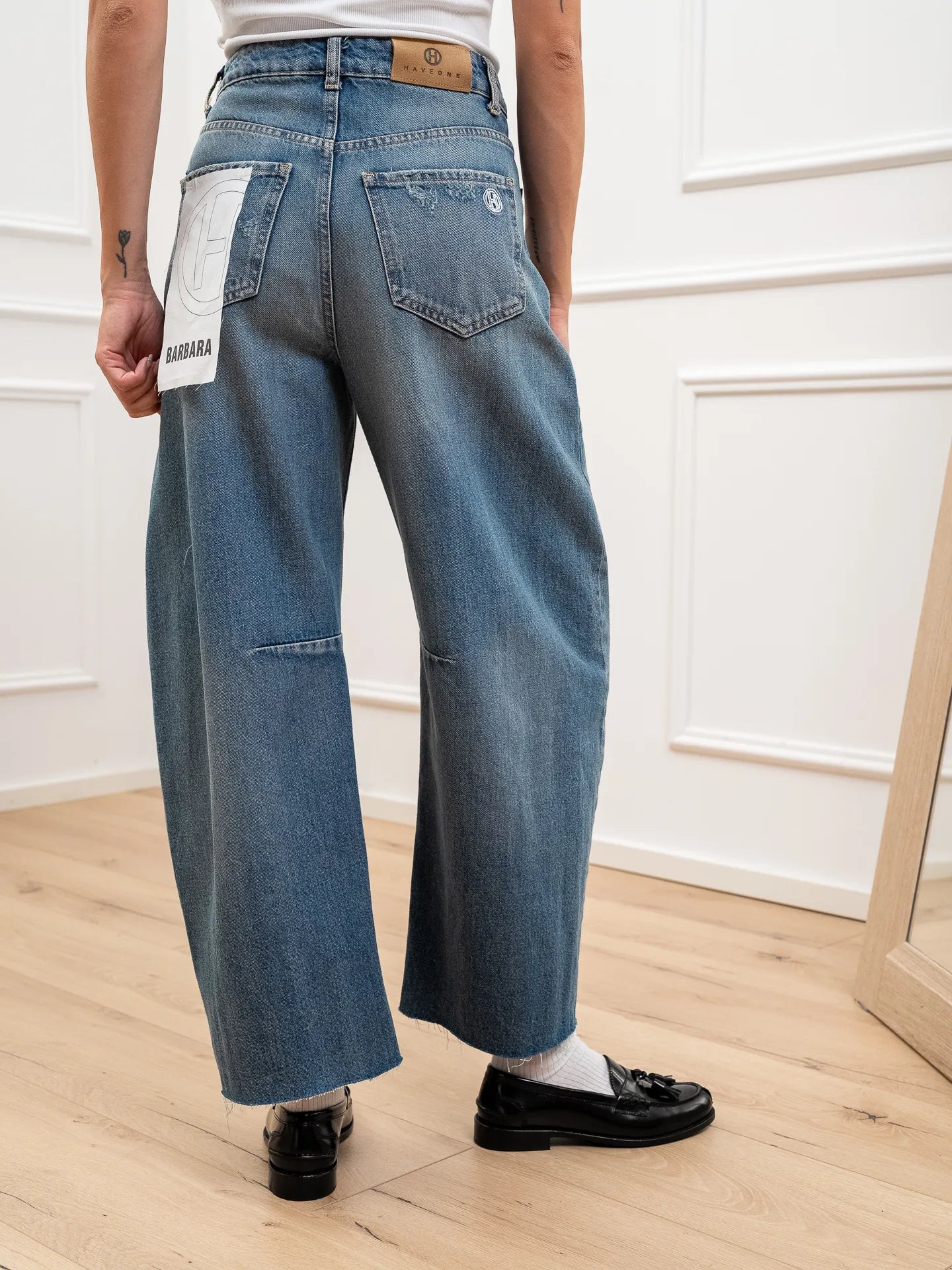 Jeans Barbara lavaggio medio HaveOne. Modello a ferro di cavallo con pinces sul ginocchio e taglio vivo sul fondo. Dettaglio di piccole rotture.