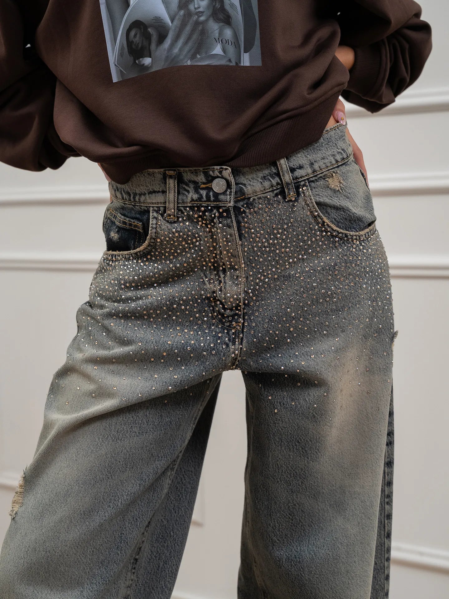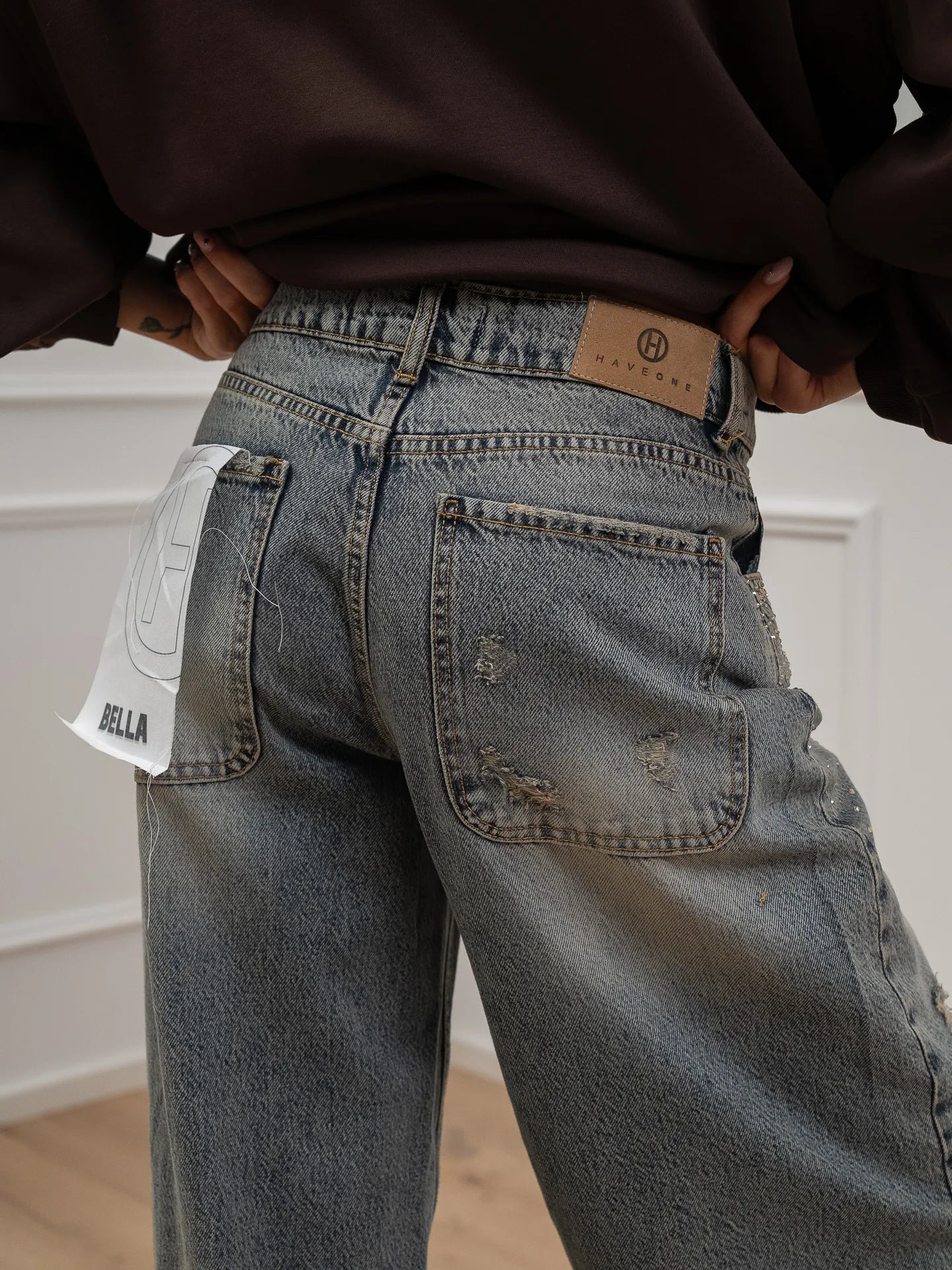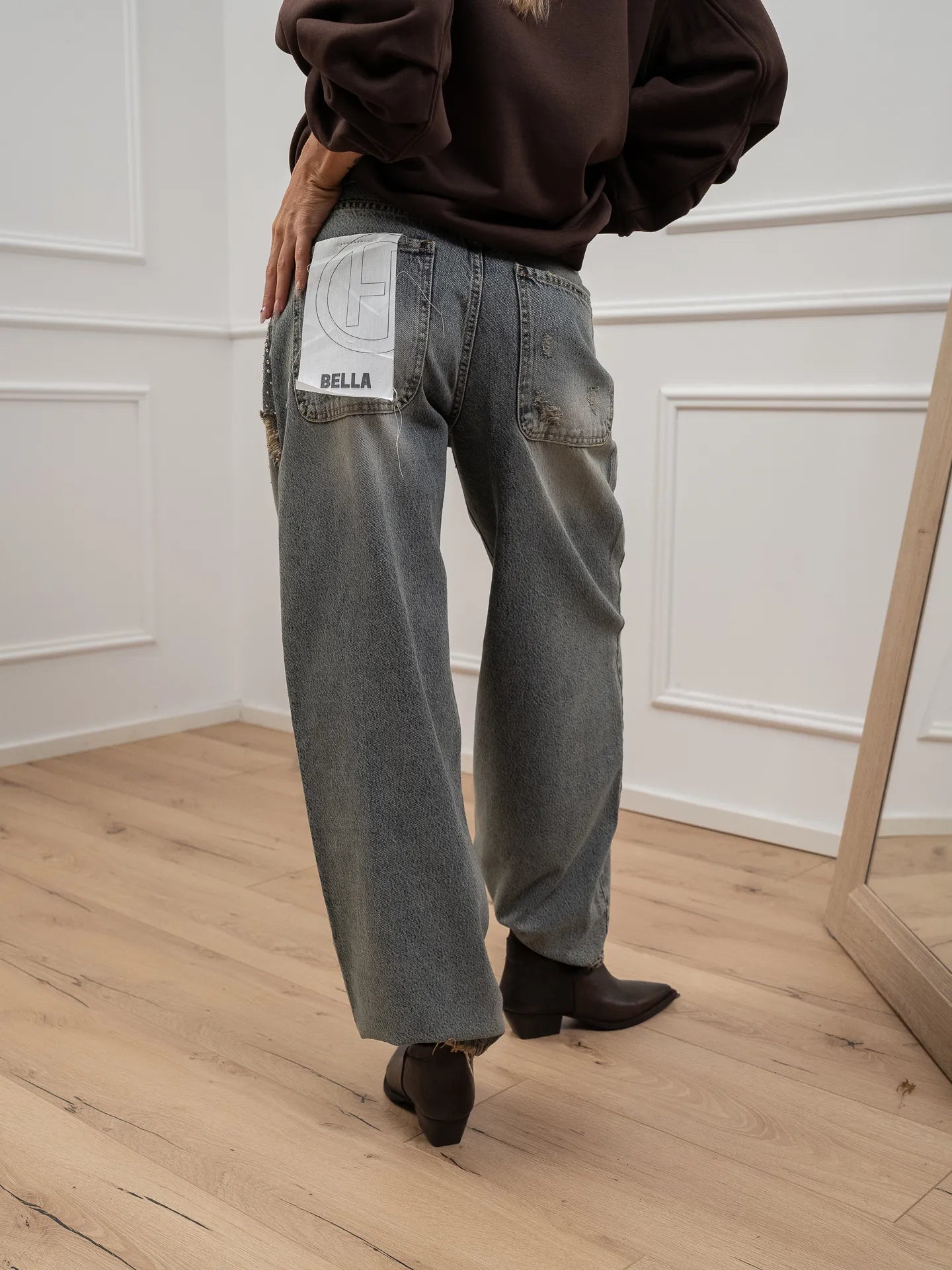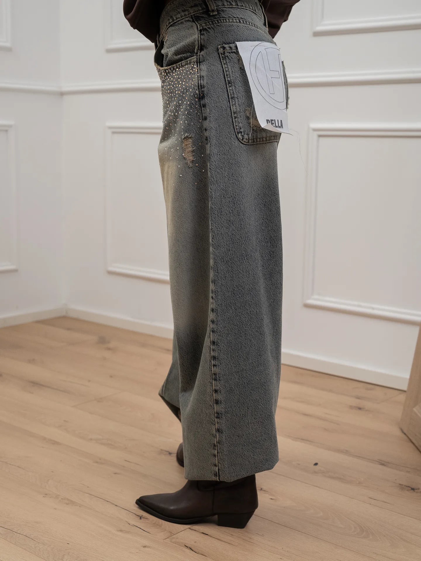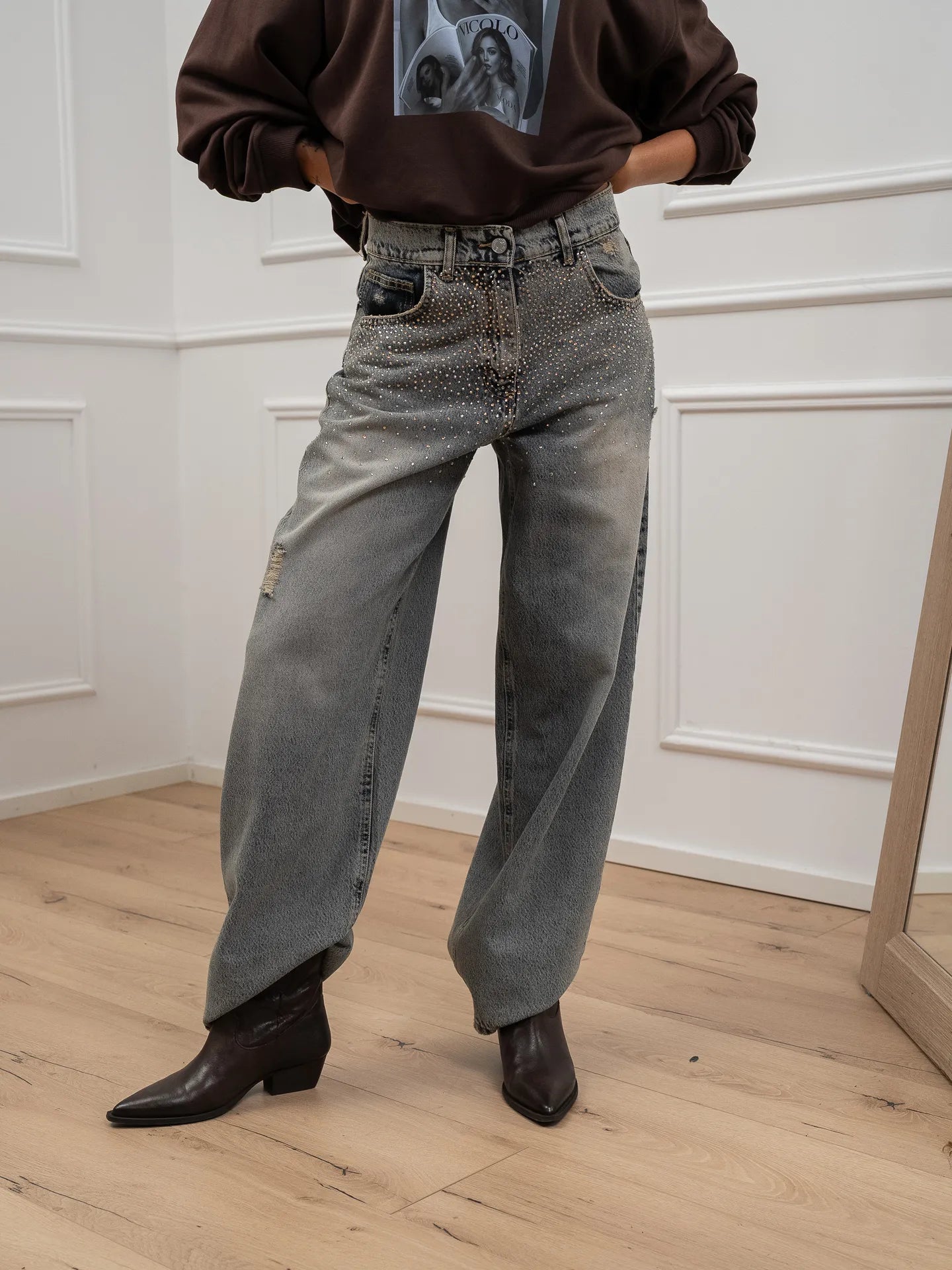 Jeans Bella denim sabbiato HaveOne. Modello barrel fit a vita alta con gamba ampia, dettaglio di piccole rotture e strass.