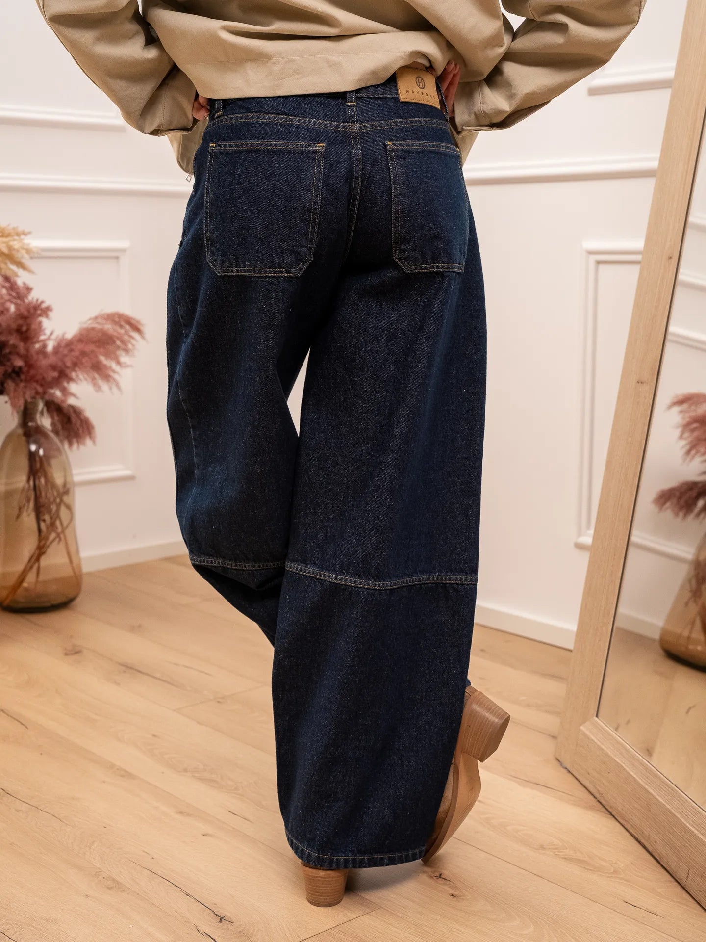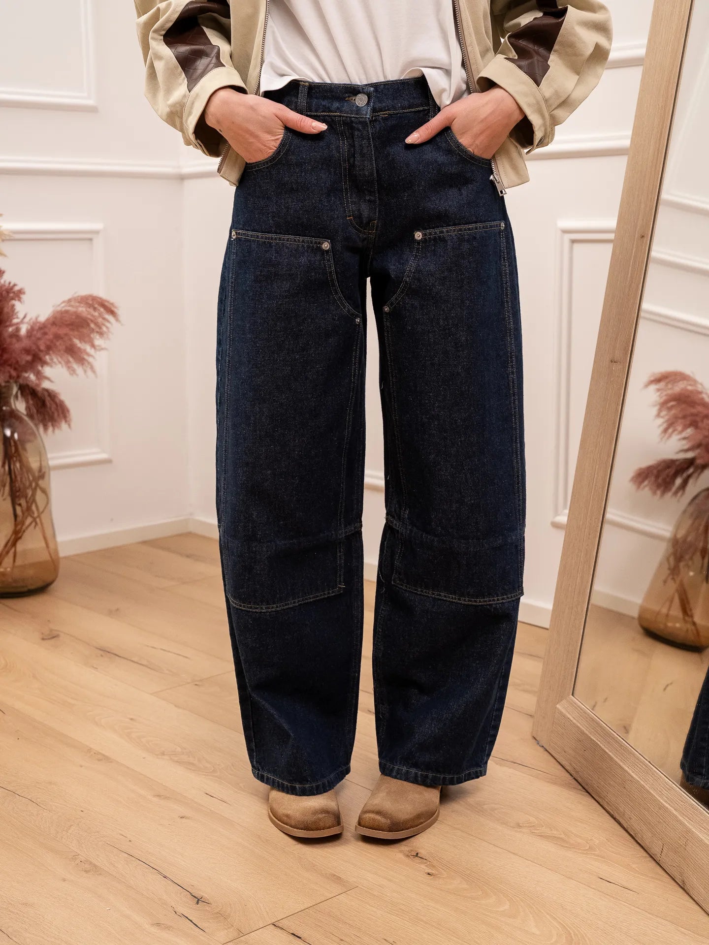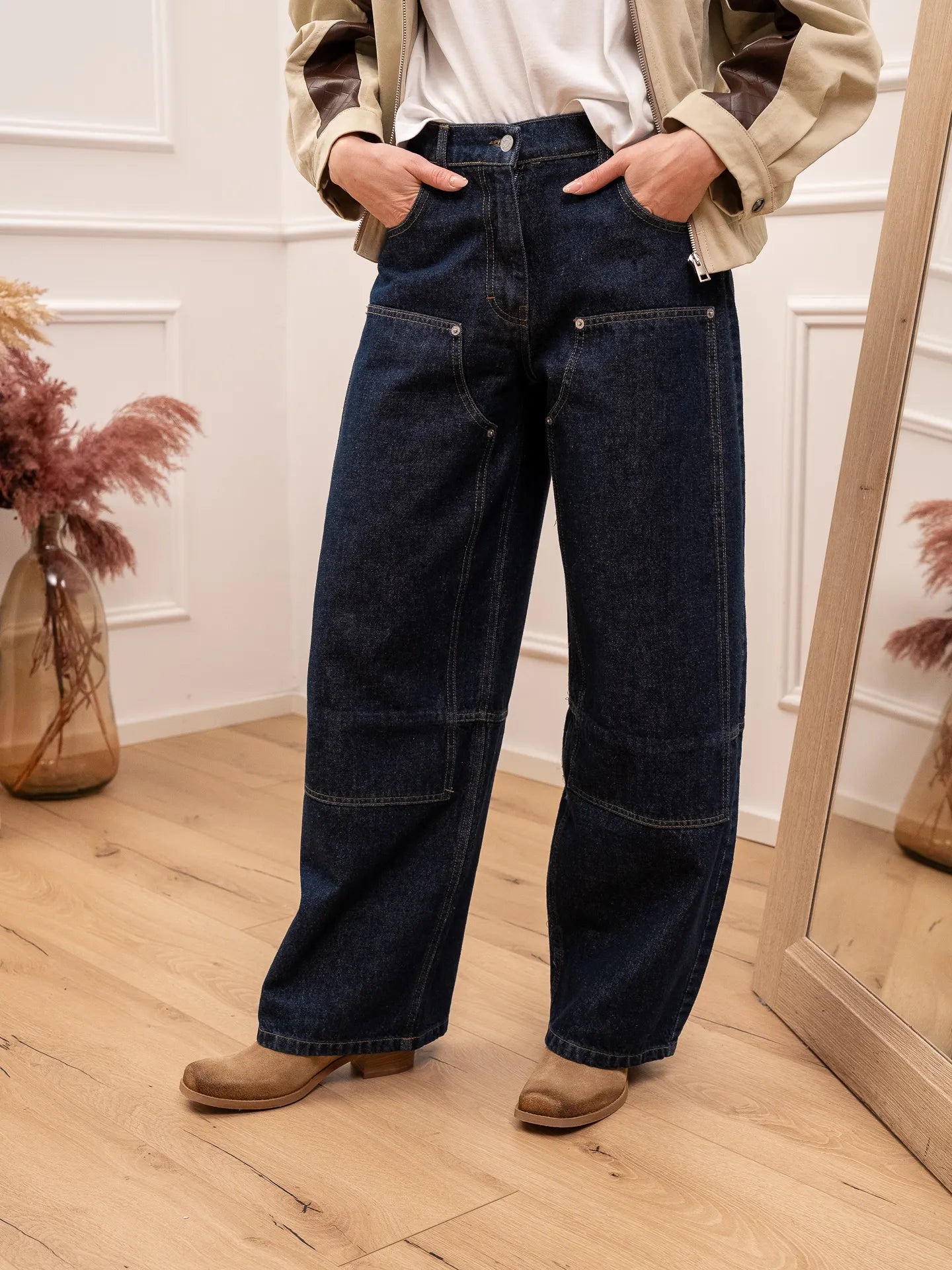 Jeans blu scuro HaveOne. Modello fit gamba ampia a vita medio bassa. Dettaglio di impunture frontali e cuciture camel a contrasto.