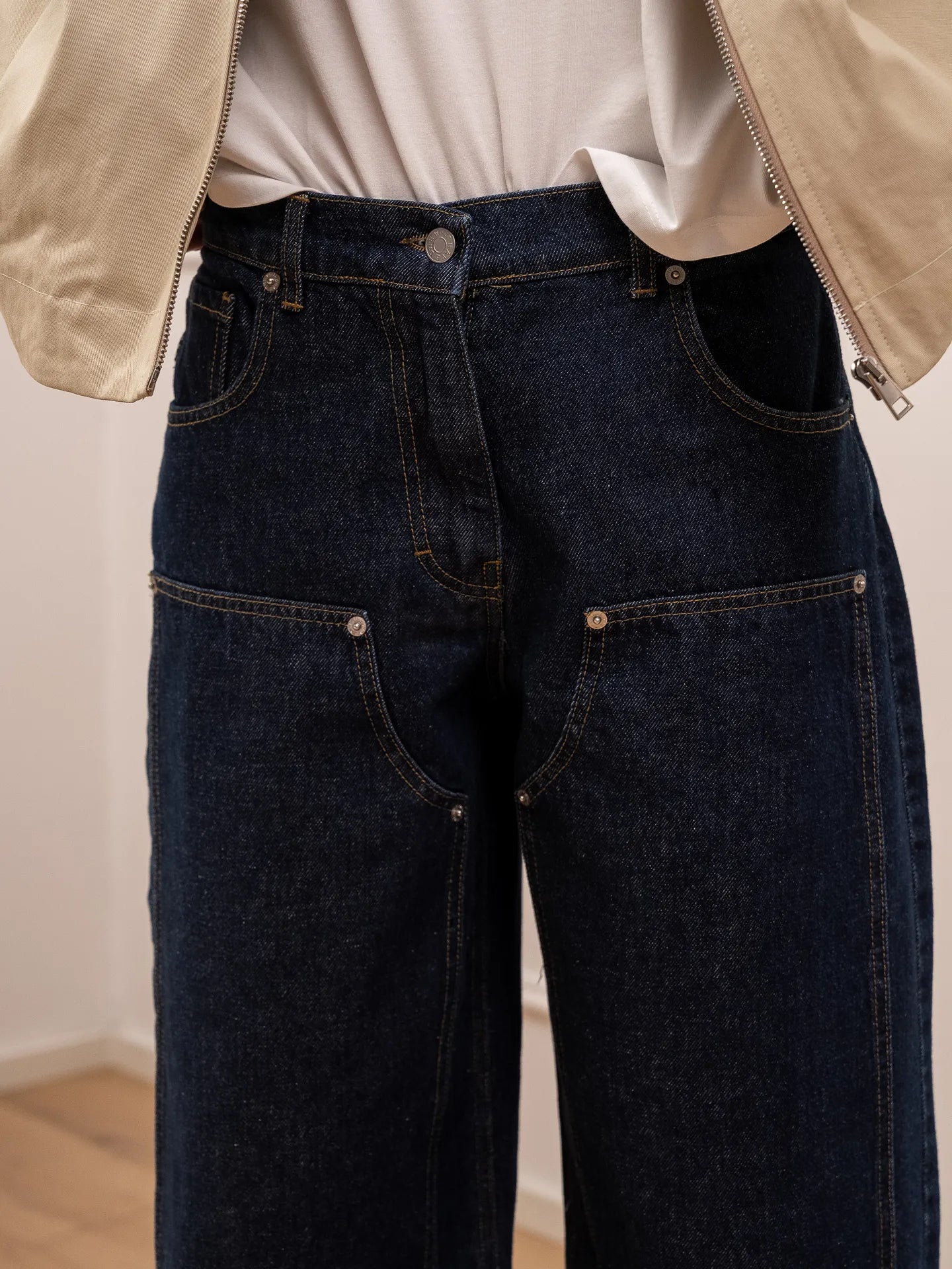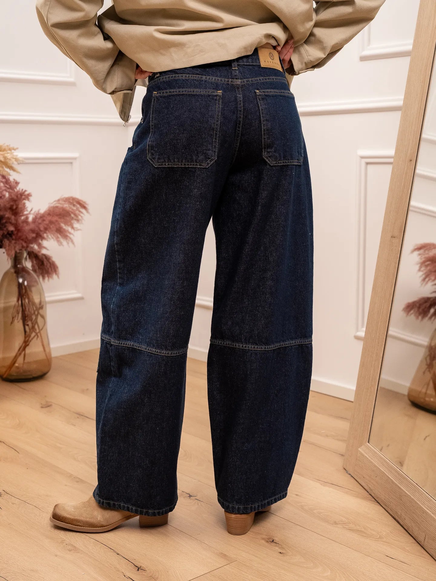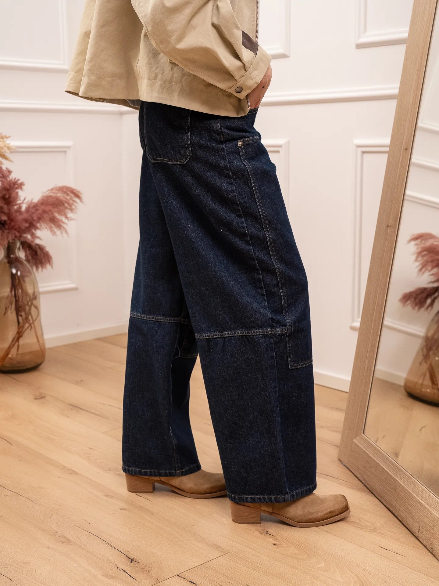 Jeans blu scuro HaveOne. Modello fit gamba ampia a vita medio bassa. Dettaglio di impunture frontali e cuciture camel a contrasto.