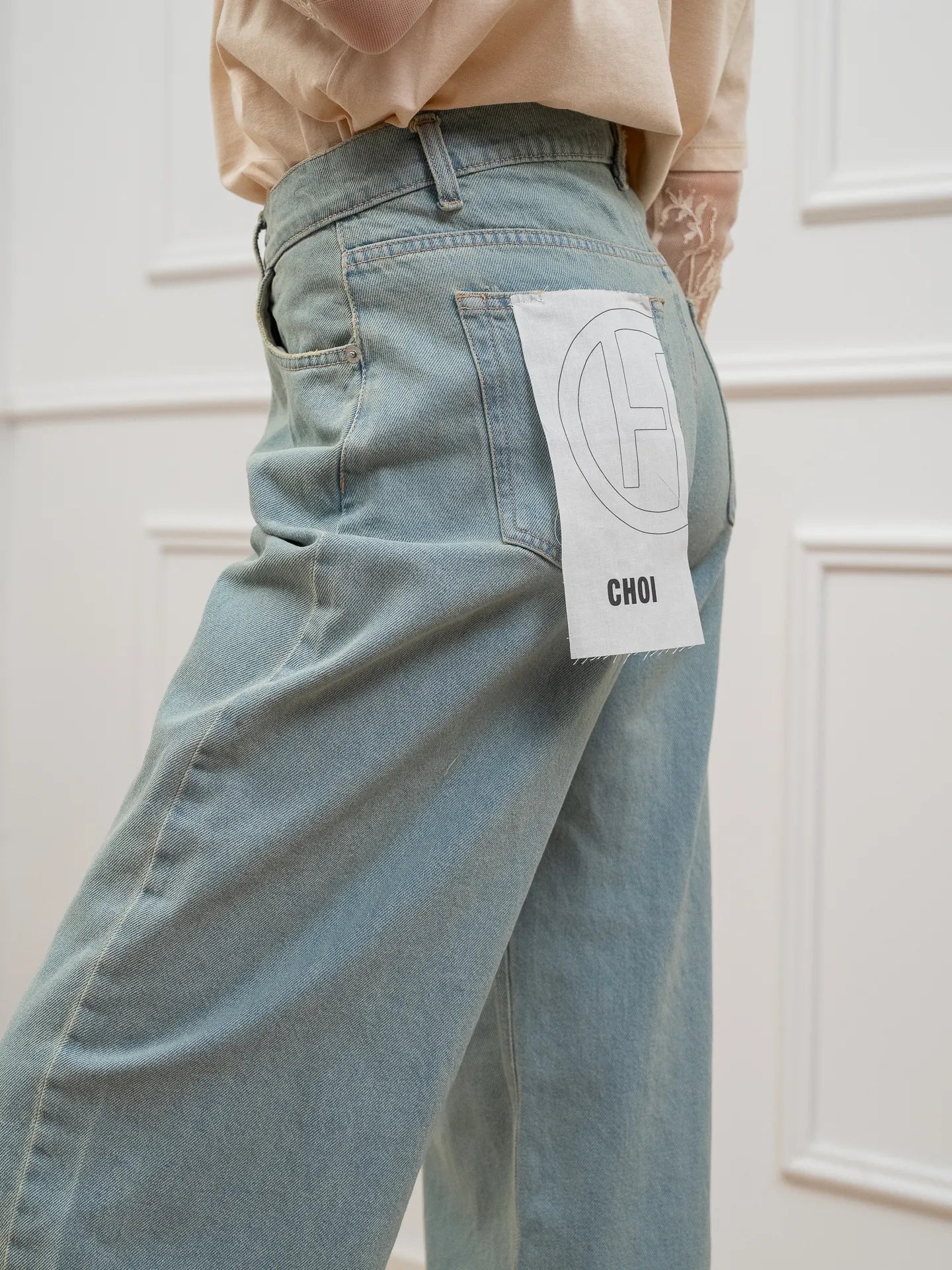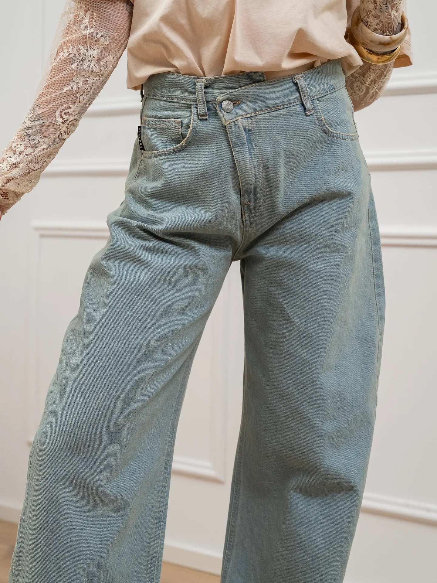 Jeans Choi denim sabbiato HaveOne. Modello wide leg fit, vita obliqua con bottone irregolare.