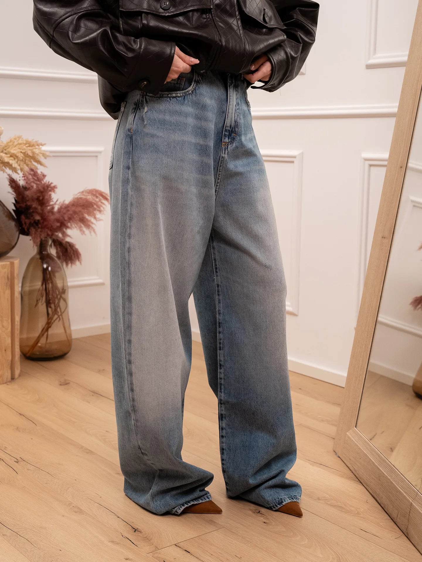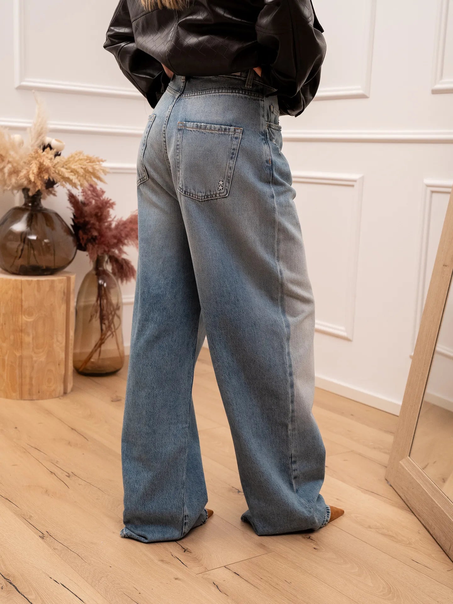 Jeans Coco in denim lavaggio medio in tela ferma Icon Denim. Modello wide leg fit a gamba ampia. Vita media e cavallo sceso e chiusura bottone e zip.