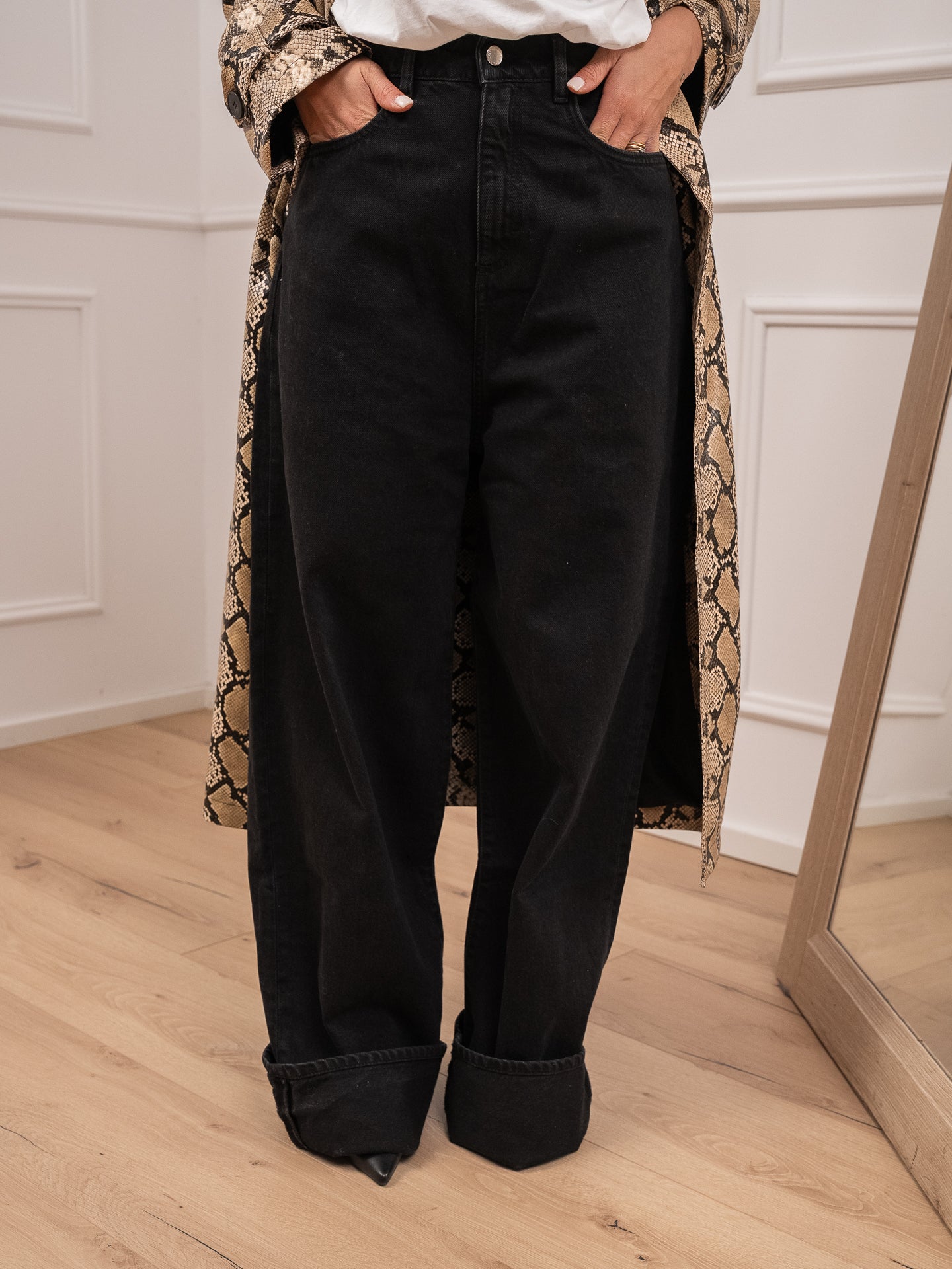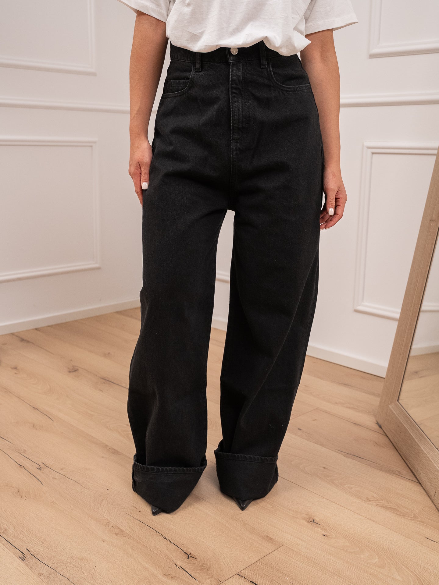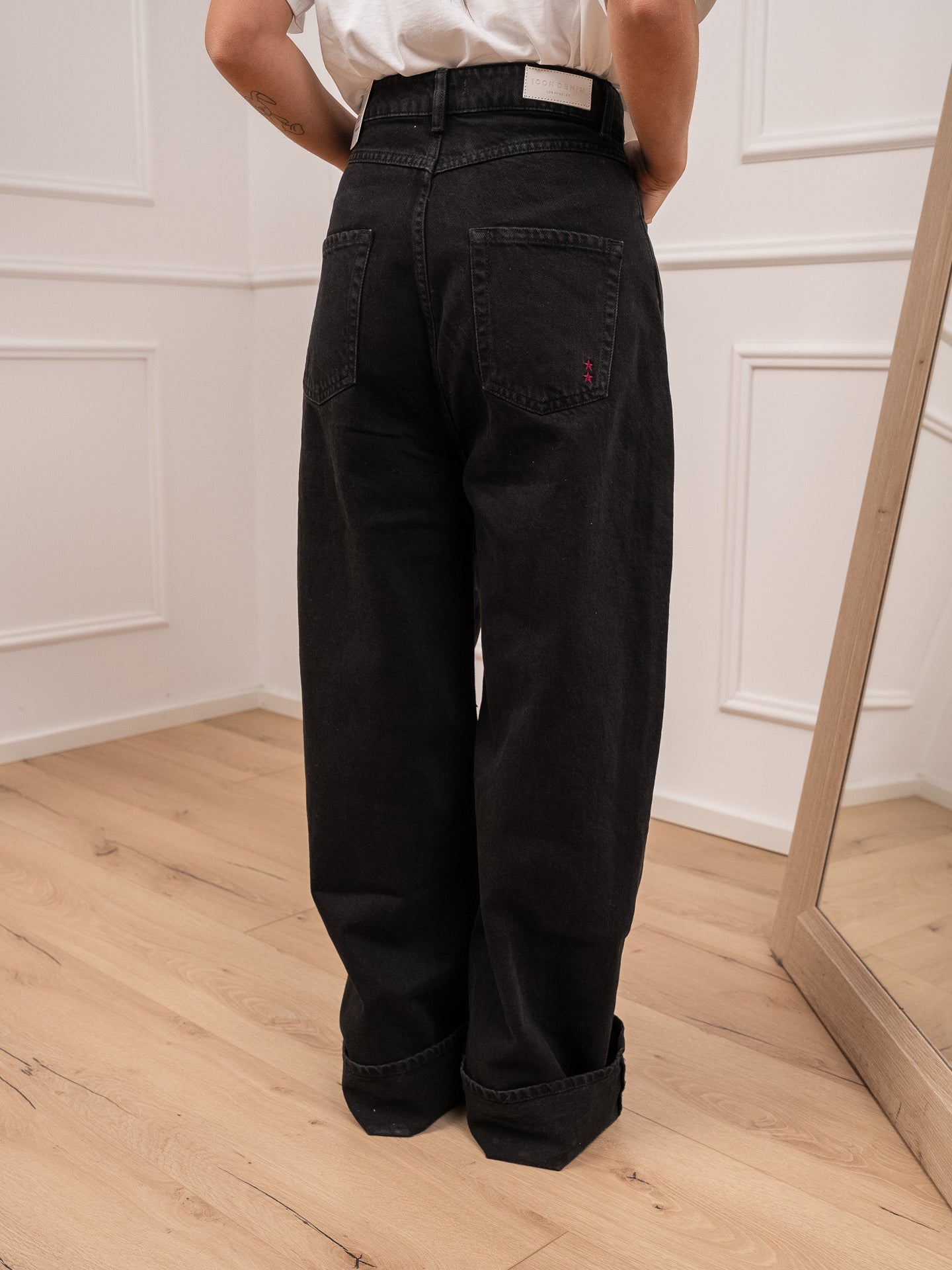 Jeans Coco in denim nero in tela ferma Icon Denim. Modello wide leg fit a gamba ampia. Vita alta, cavallo sceso e chiusura bottone e zip.