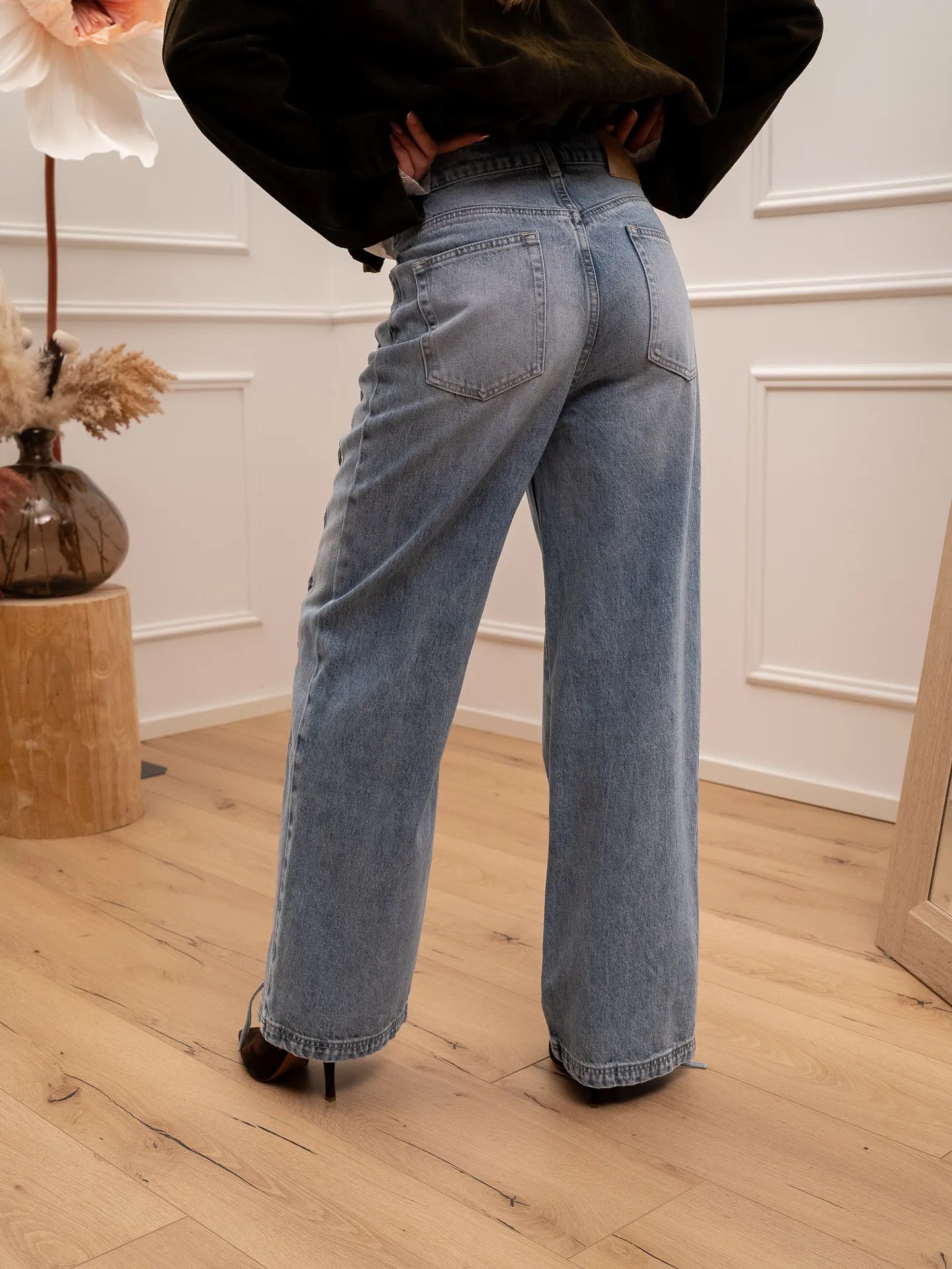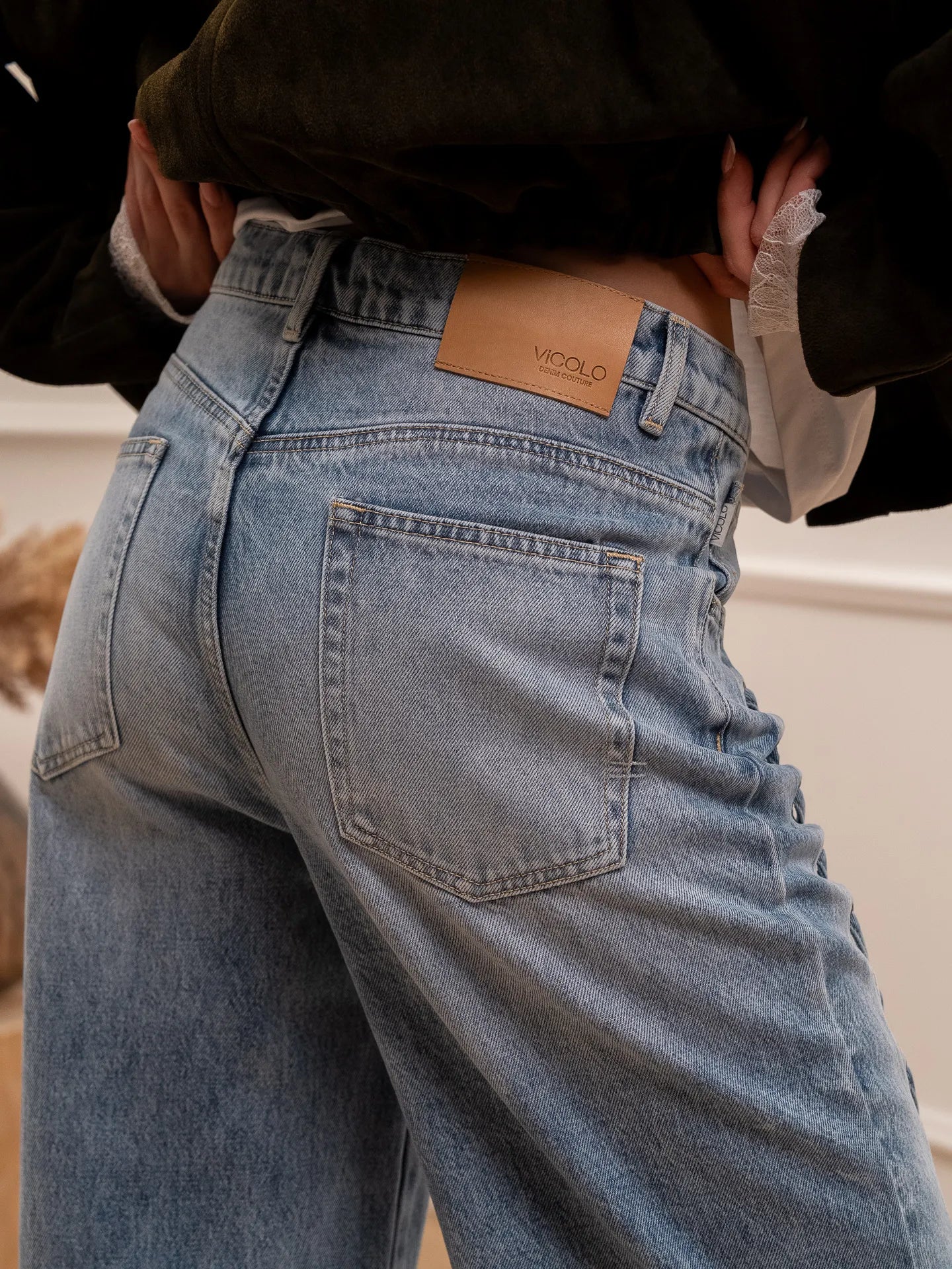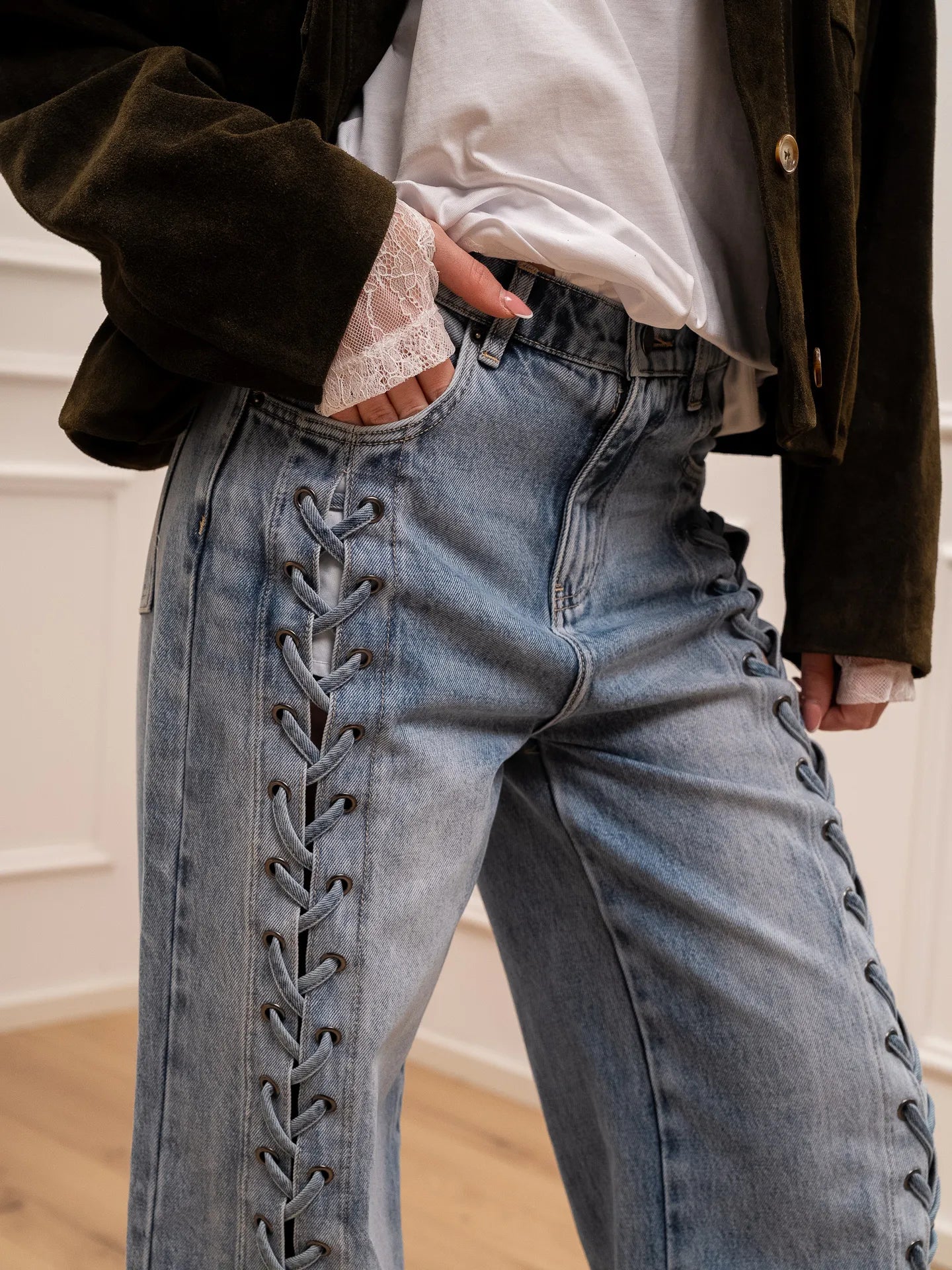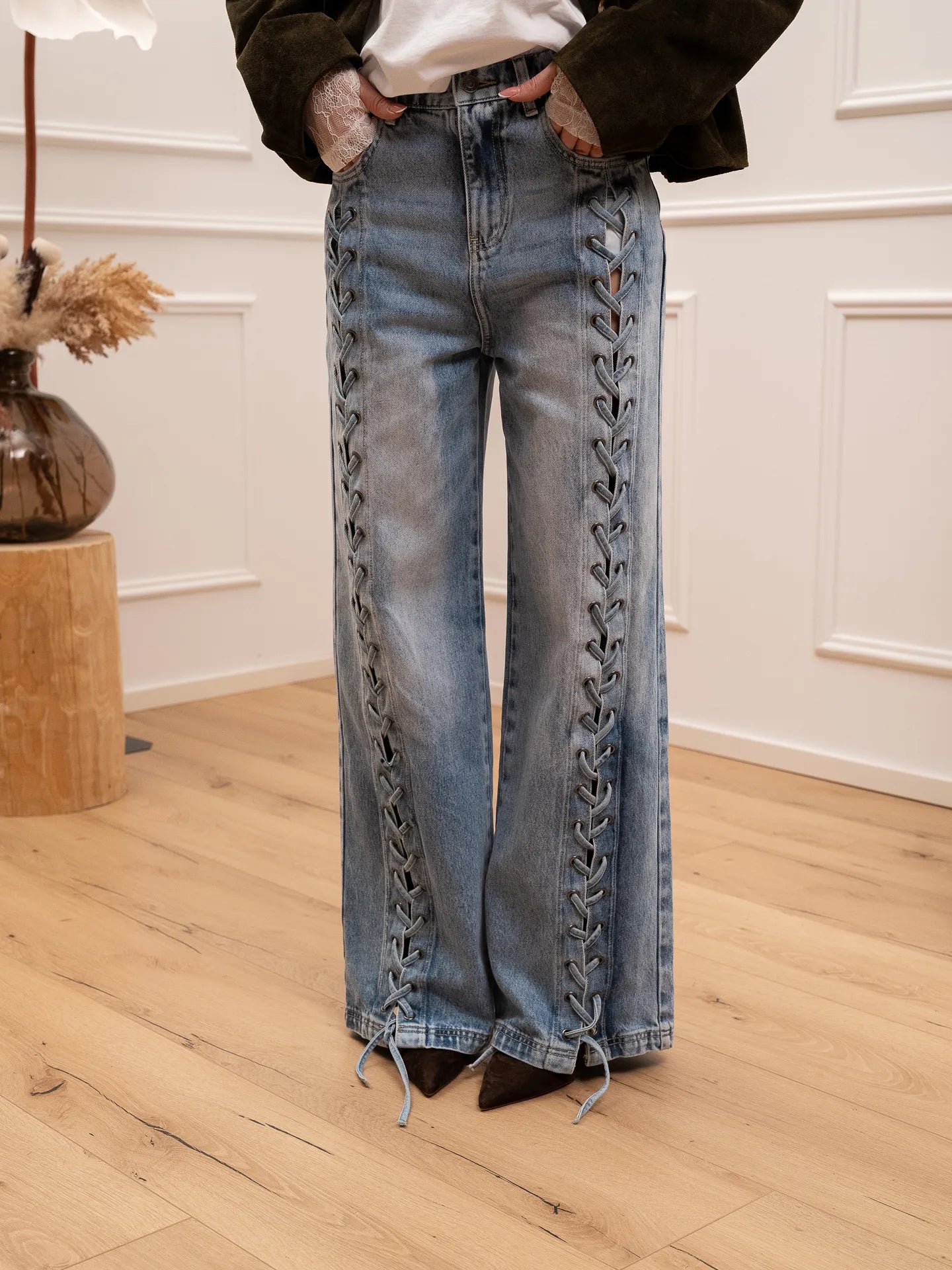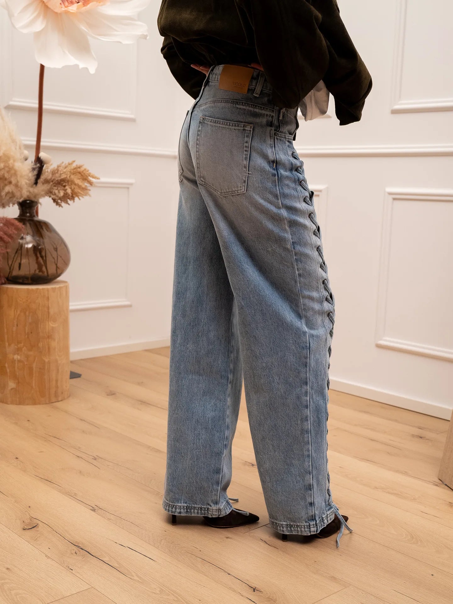Jeans Cora denim lavaggio medio Vicolo. Modello a palazzo con vita alta e cavallo sceso. Dettaglio di lacci intrecciati.