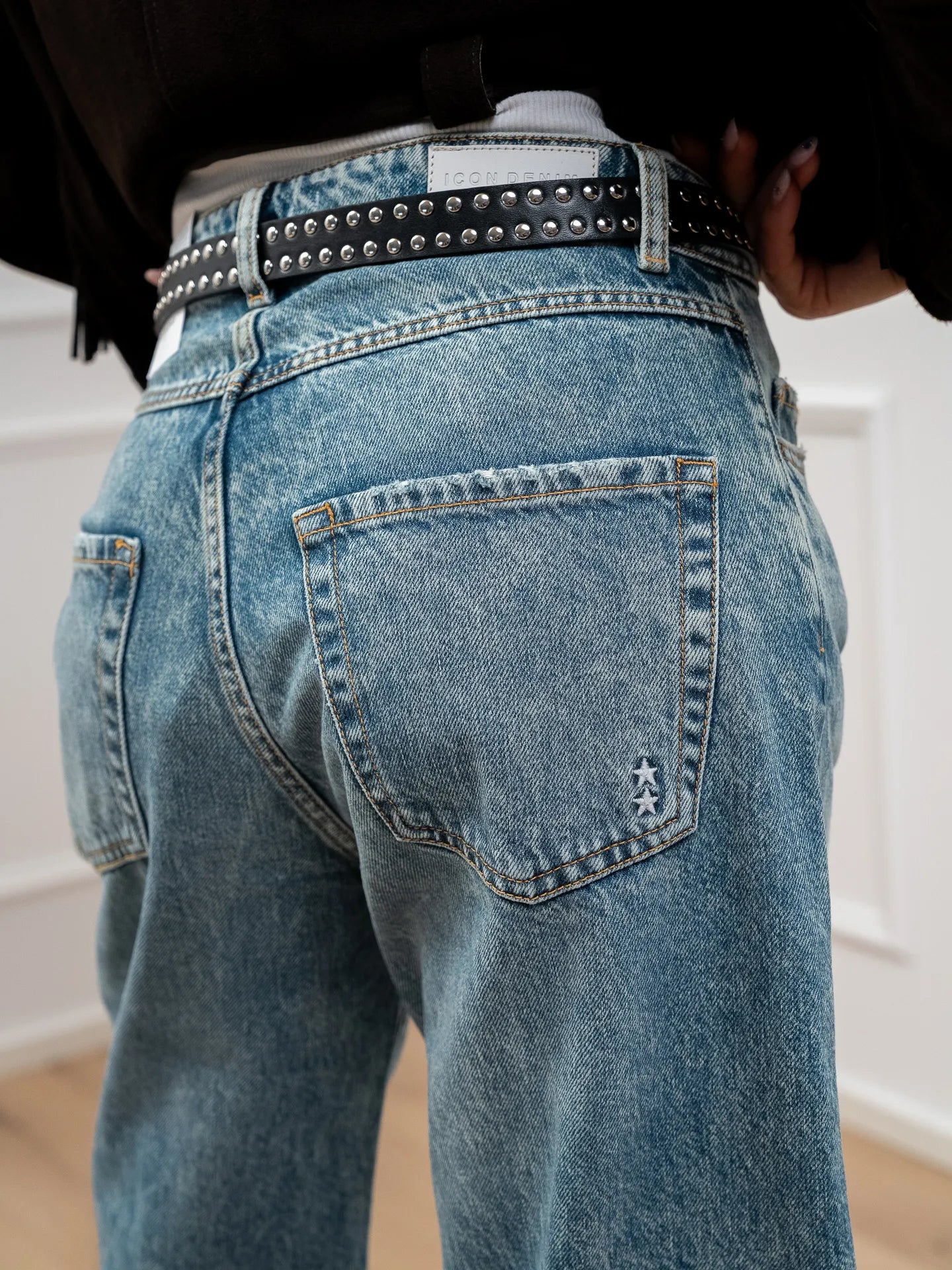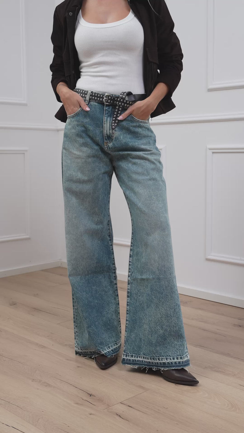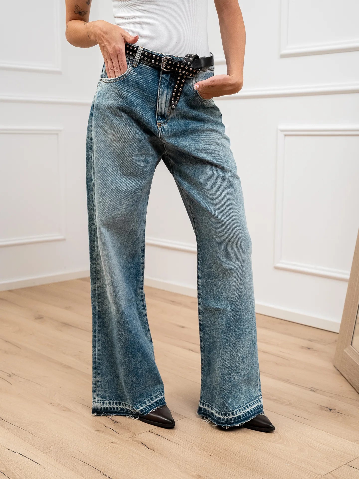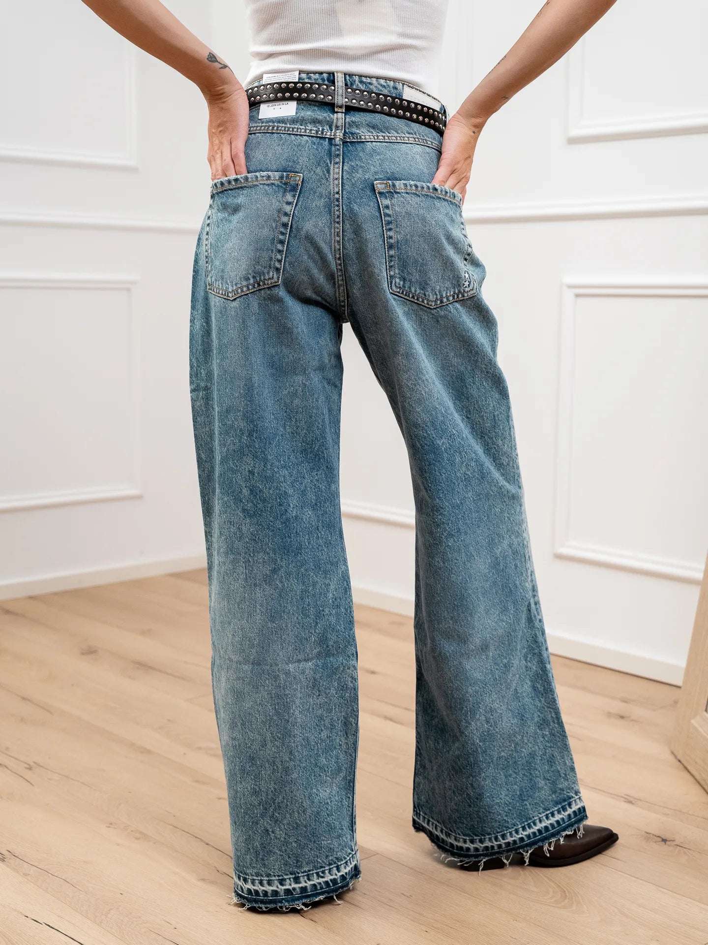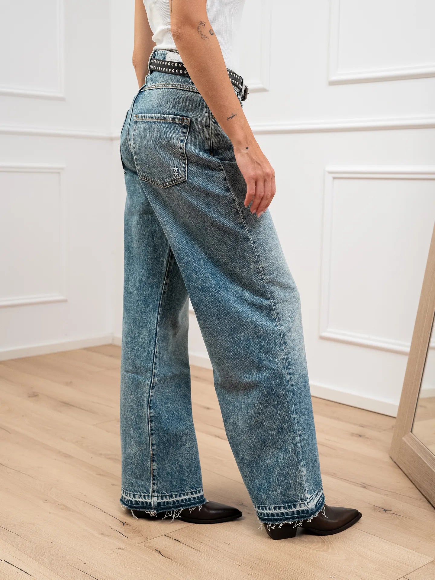 Jeans Debby lavaggio sabbiato tela ferma Icon Denim. Modello a gamba larga con vita alta. Chiusura con zip e bottone. Taglio vivo sul fondo sfrangiato.