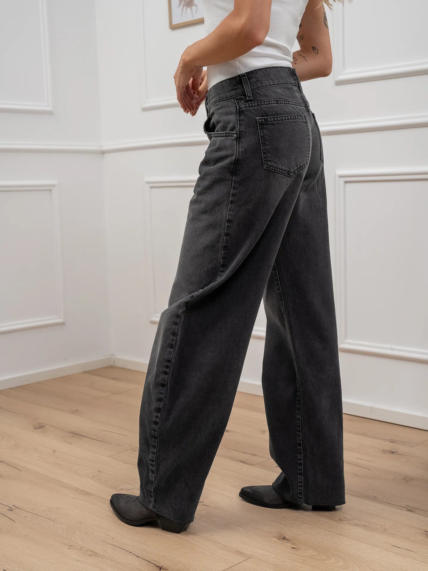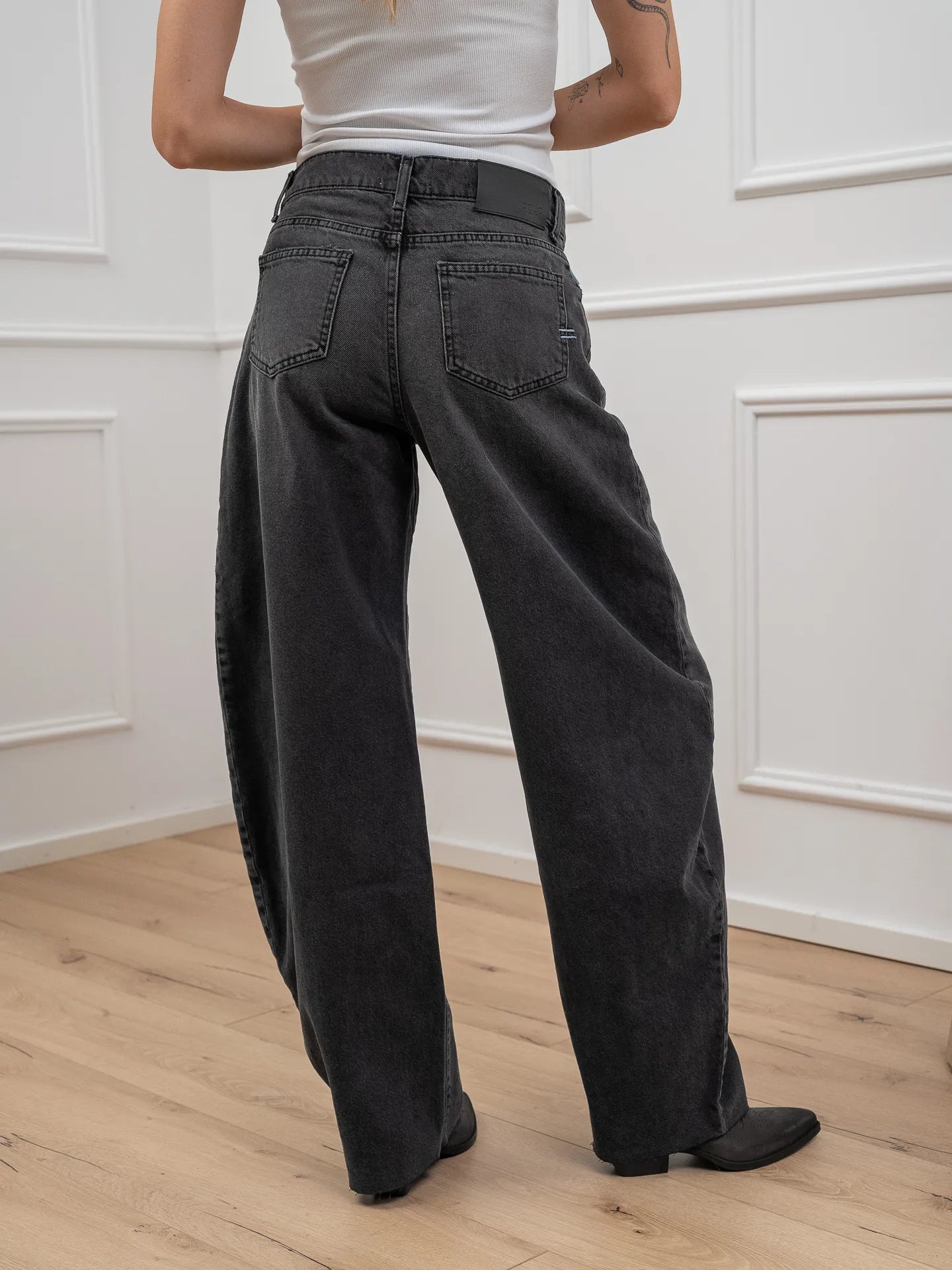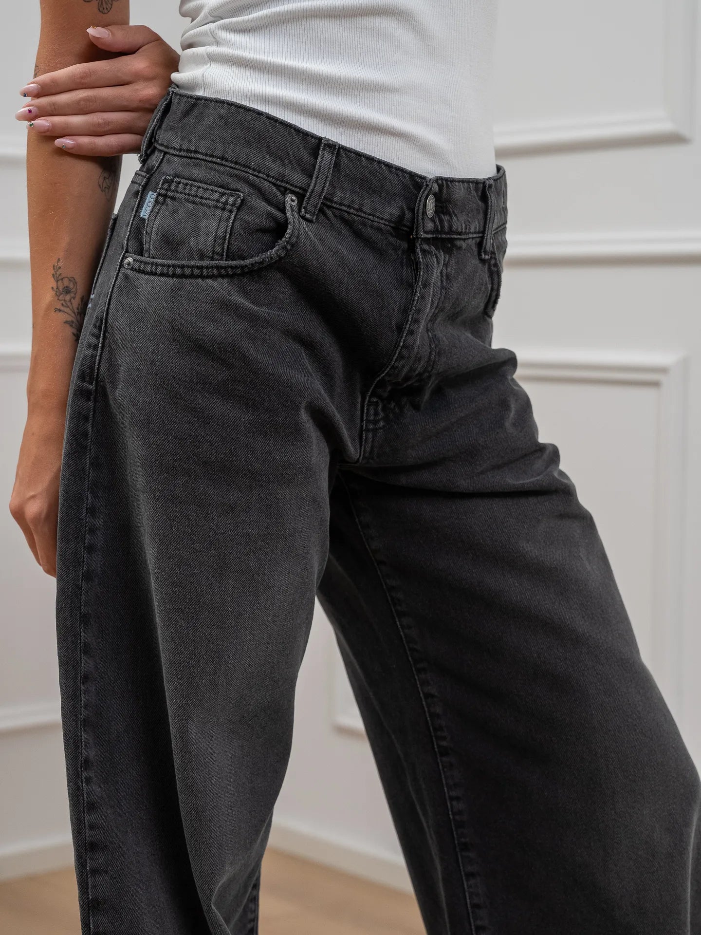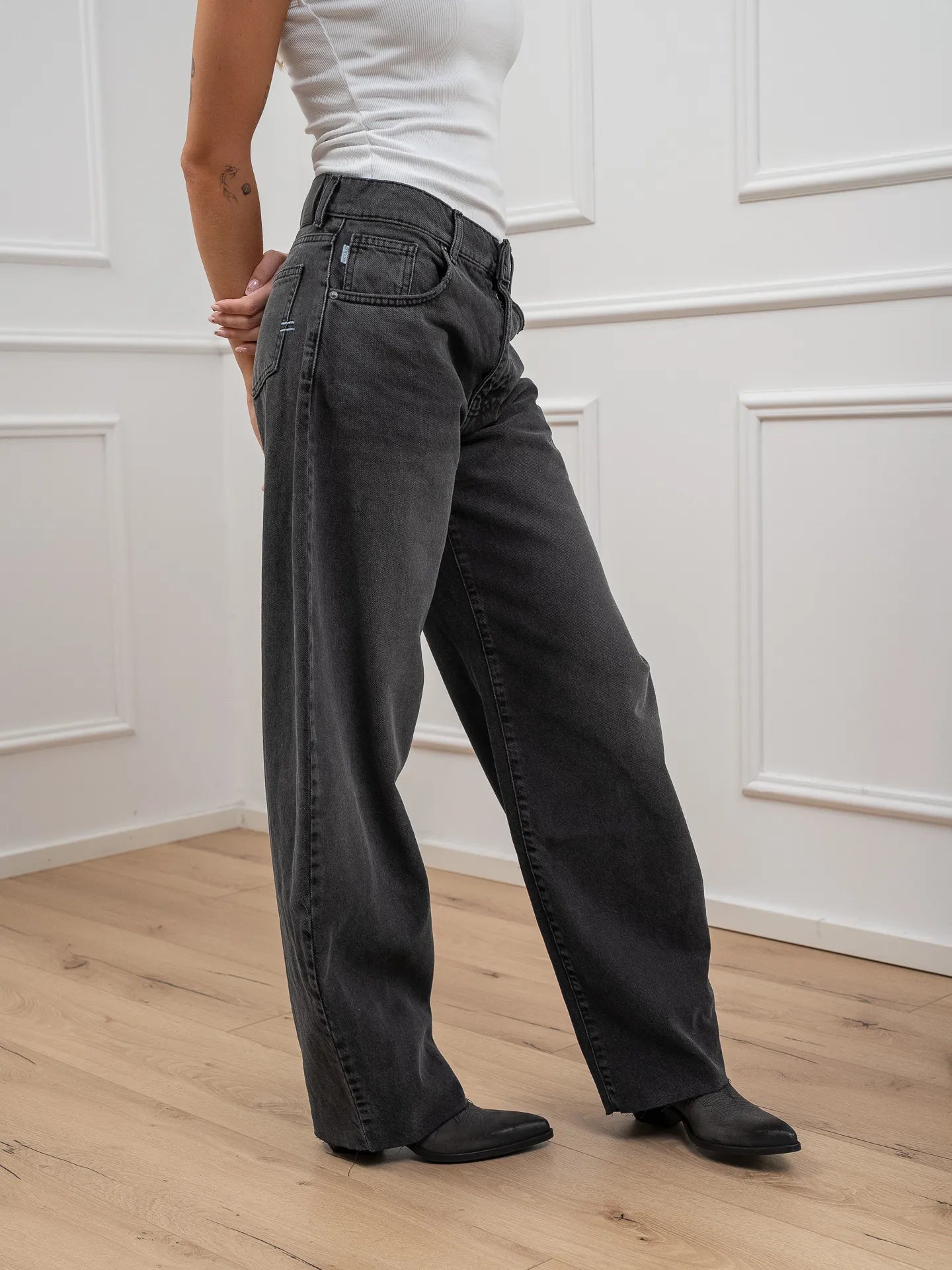 Jeans Denise denim color nero slavato Vicolo. Modello a ferro di cavallo effetto balloon, con vita alta e chiusura frontale zip e bottone.