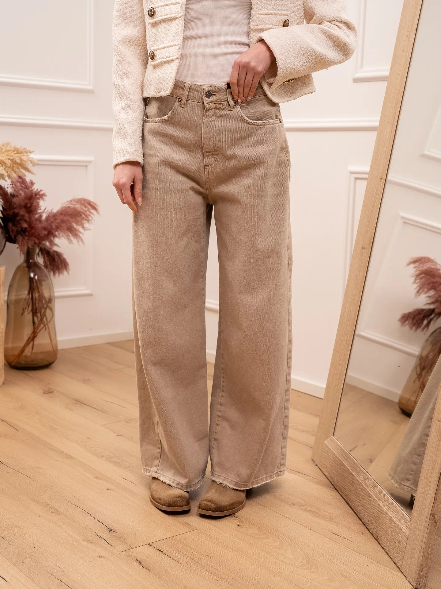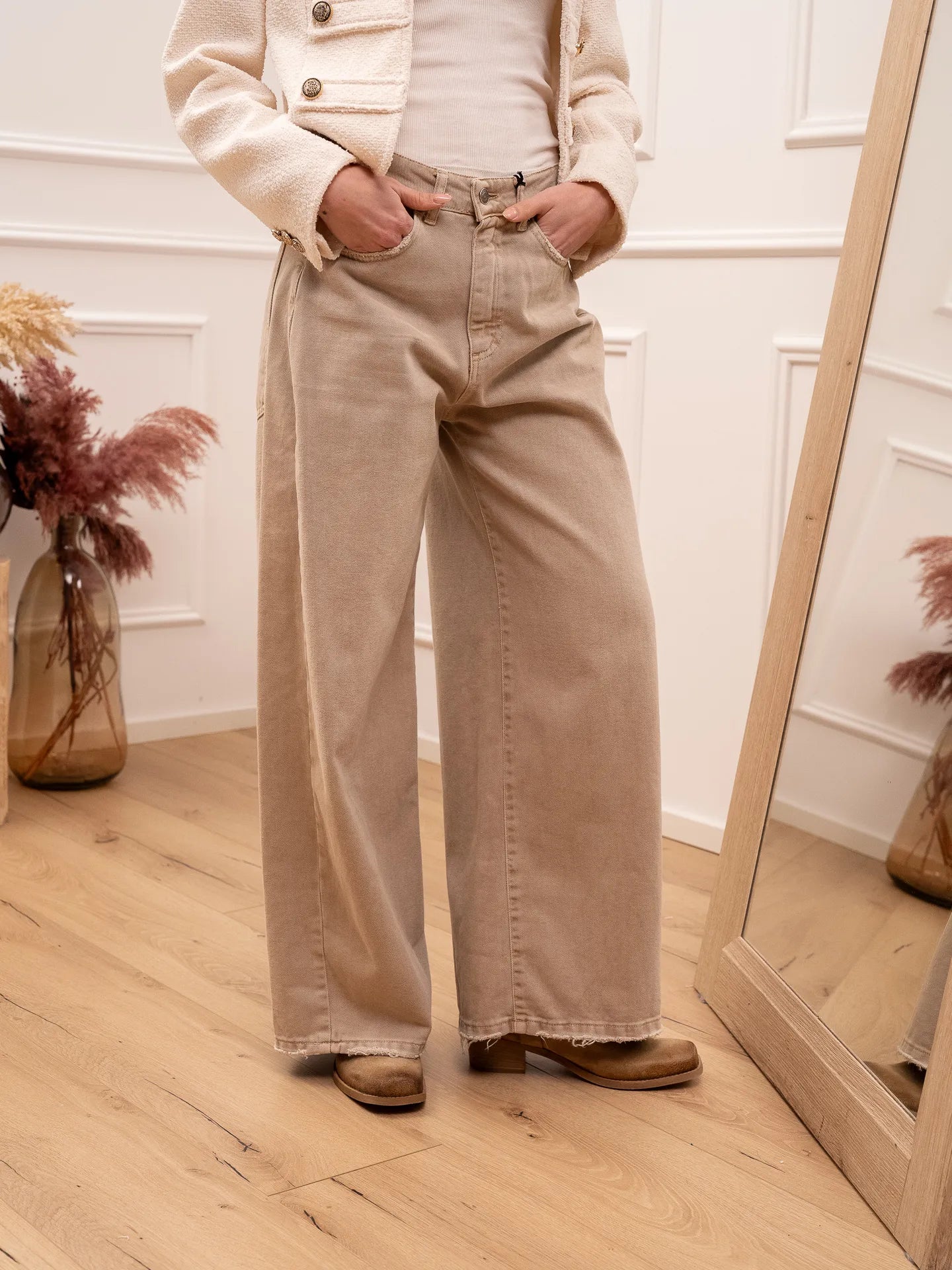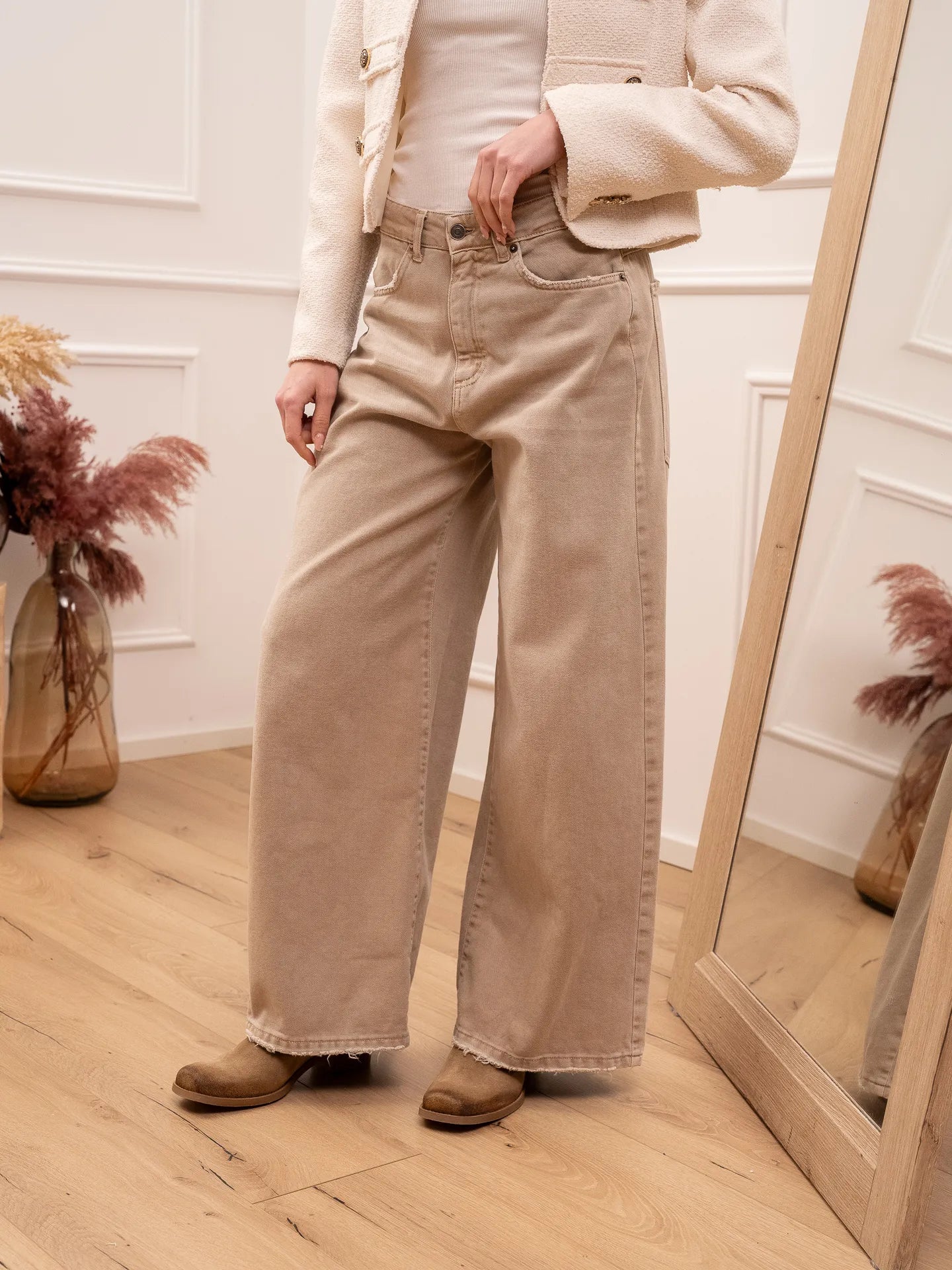Jeans Giusi in drill sabbia Tensione In. Modello gamba ampia e vita medio alta. Chiusura bottone e zip. Dettaglio di maxi tasche sul retro. Bordi sfrangiati.
