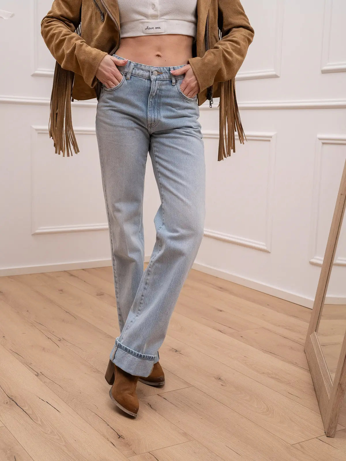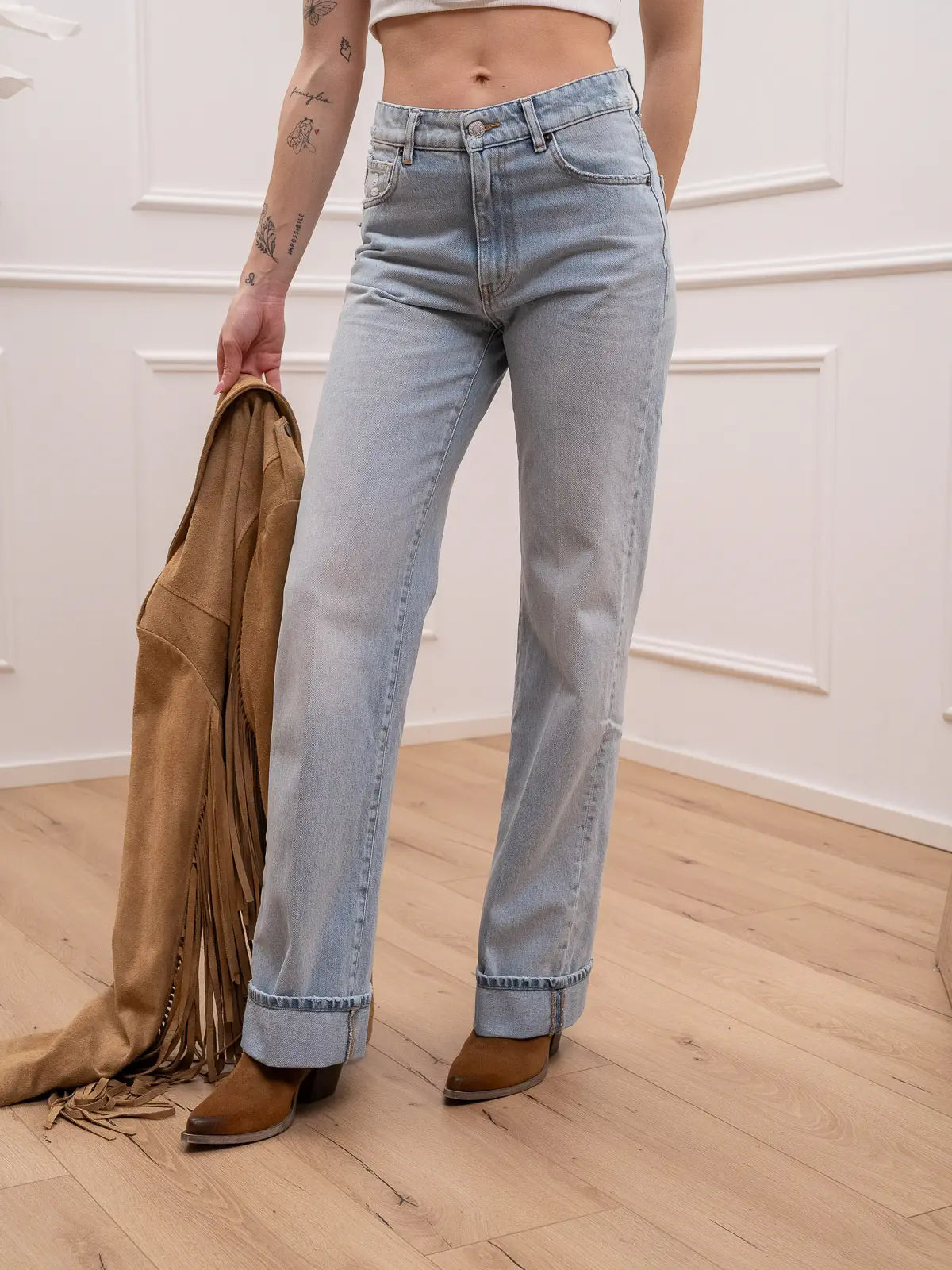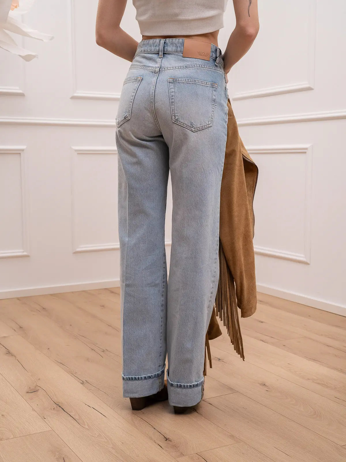 Jeans Jodie in denim lavaggio chiaro Vicolo. Modello straight fit a cinque tasche. Vita alta e chiusura con zip e bottone metallico. Risvolto sul fondo rimovibile.
