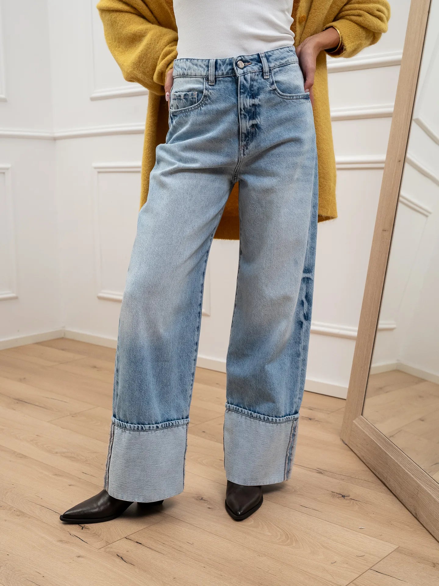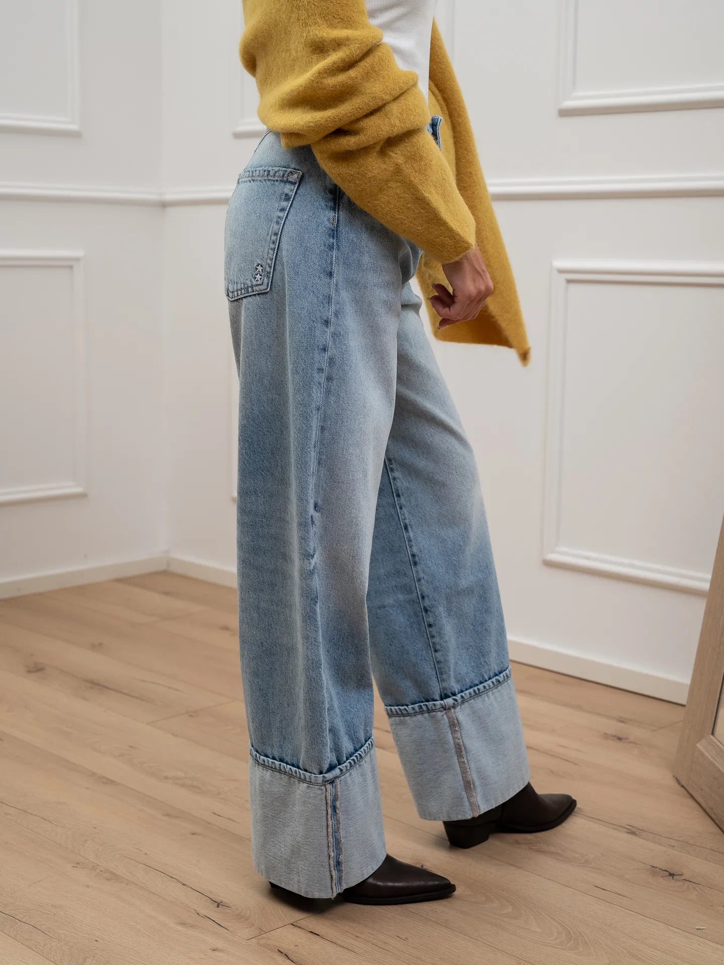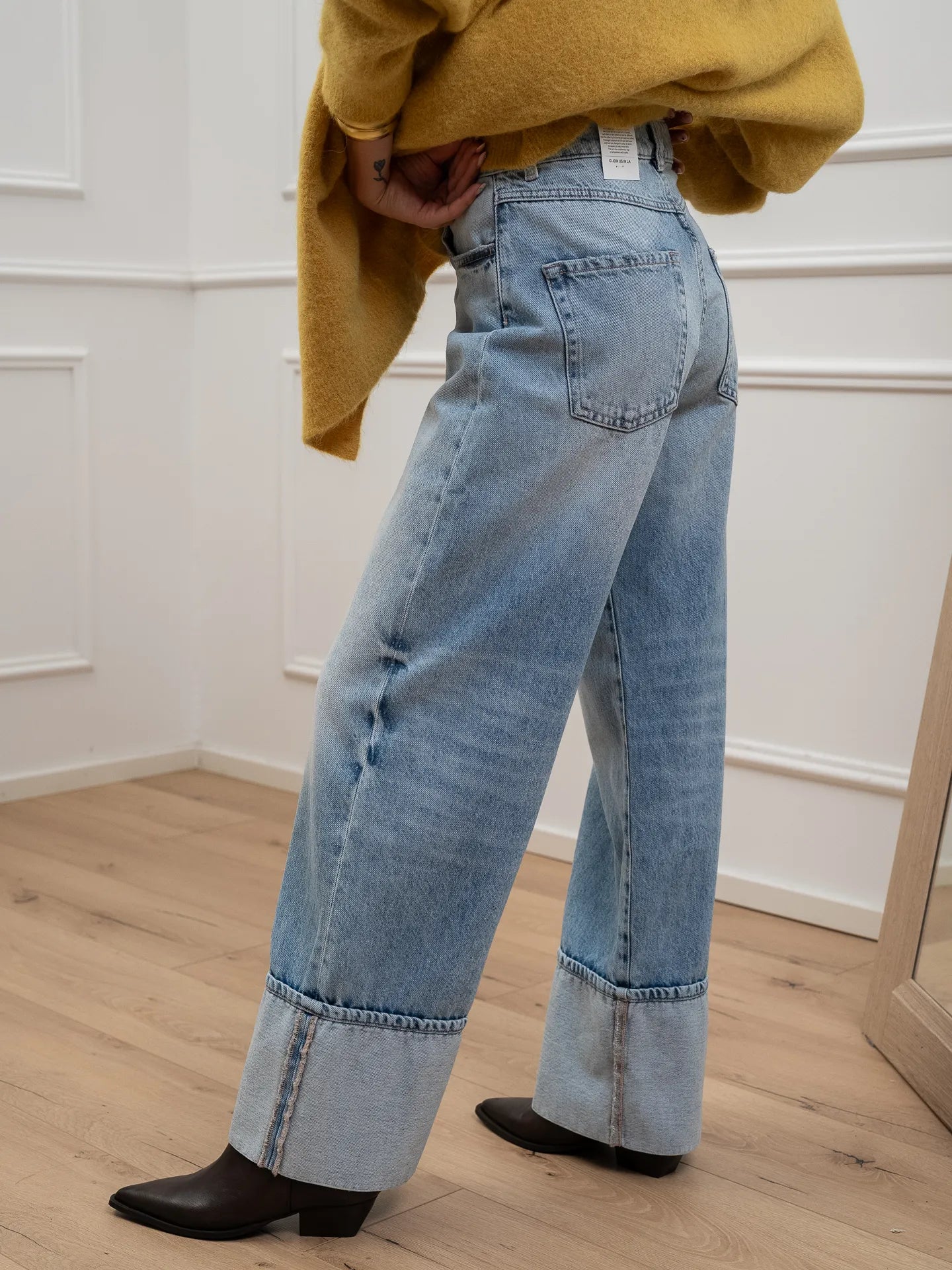 Jeans Kiki lavaggio chiaro in tela ferma Icon Denim. Modello wide leg fit gamba morbida a vita alta, maxi risvolto sul fondo.