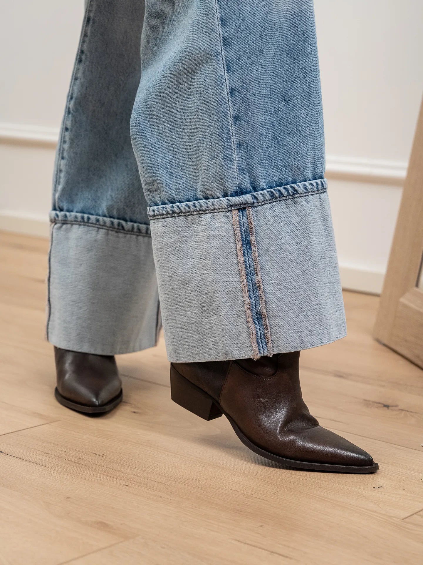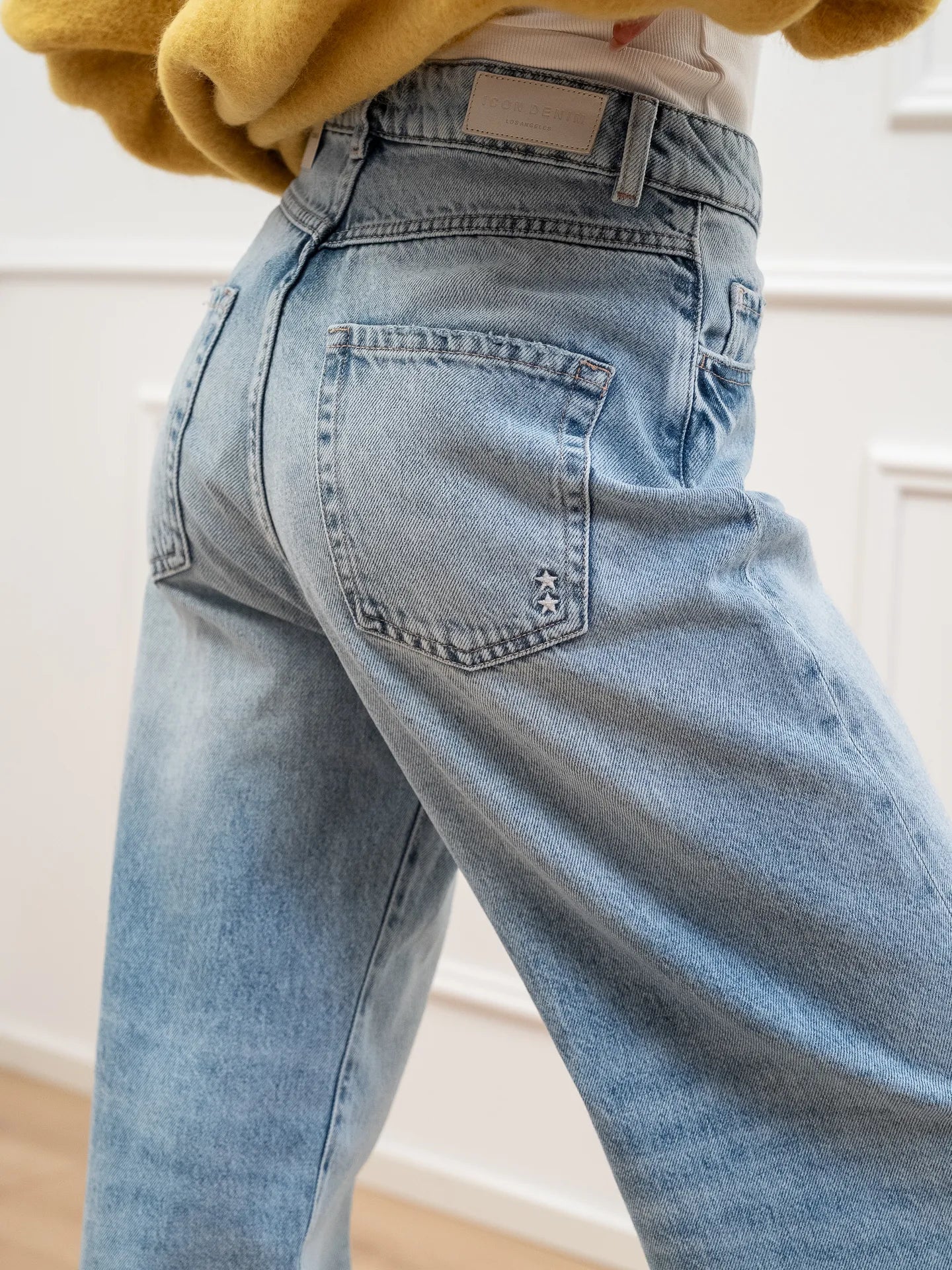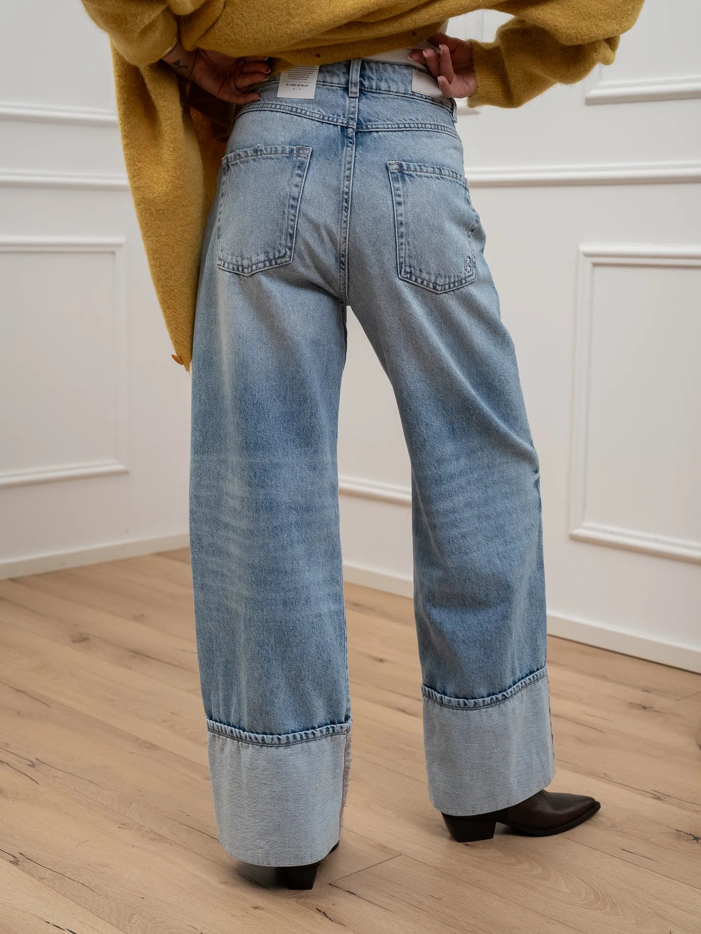 Jeans Kiki lavaggio chiaro in tela ferma Icon Denim. Modello wide leg fit gamba morbida a vita alta, maxi risvolto sul fondo.