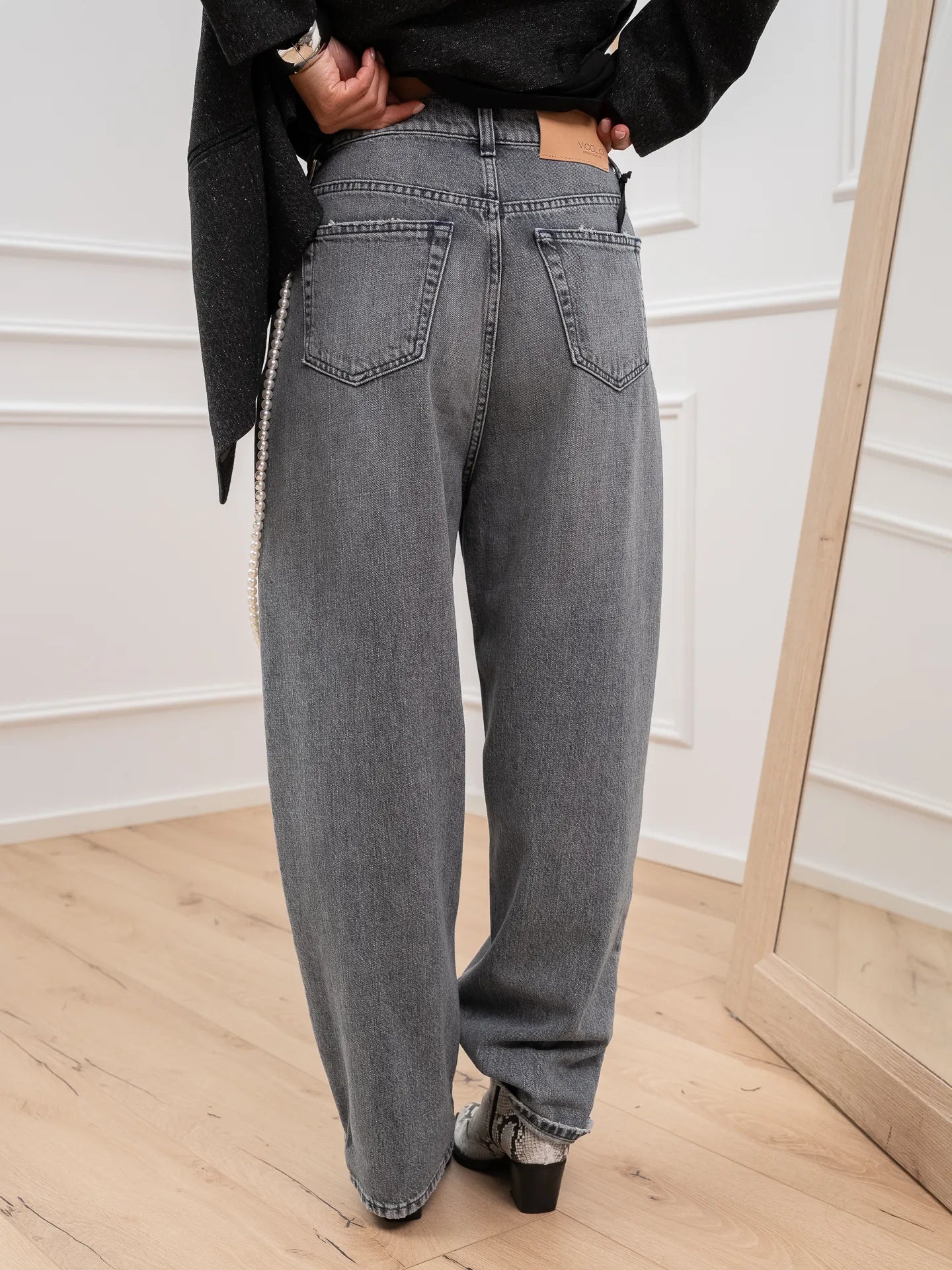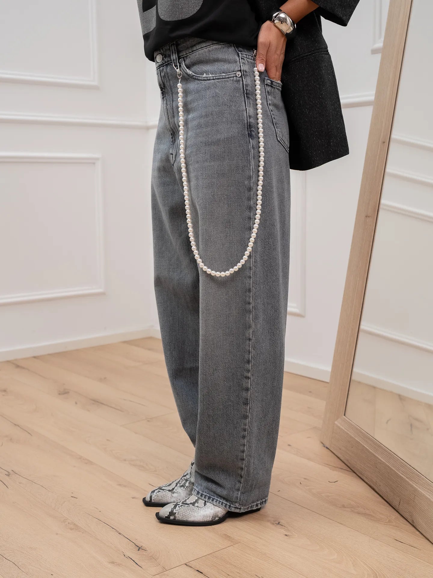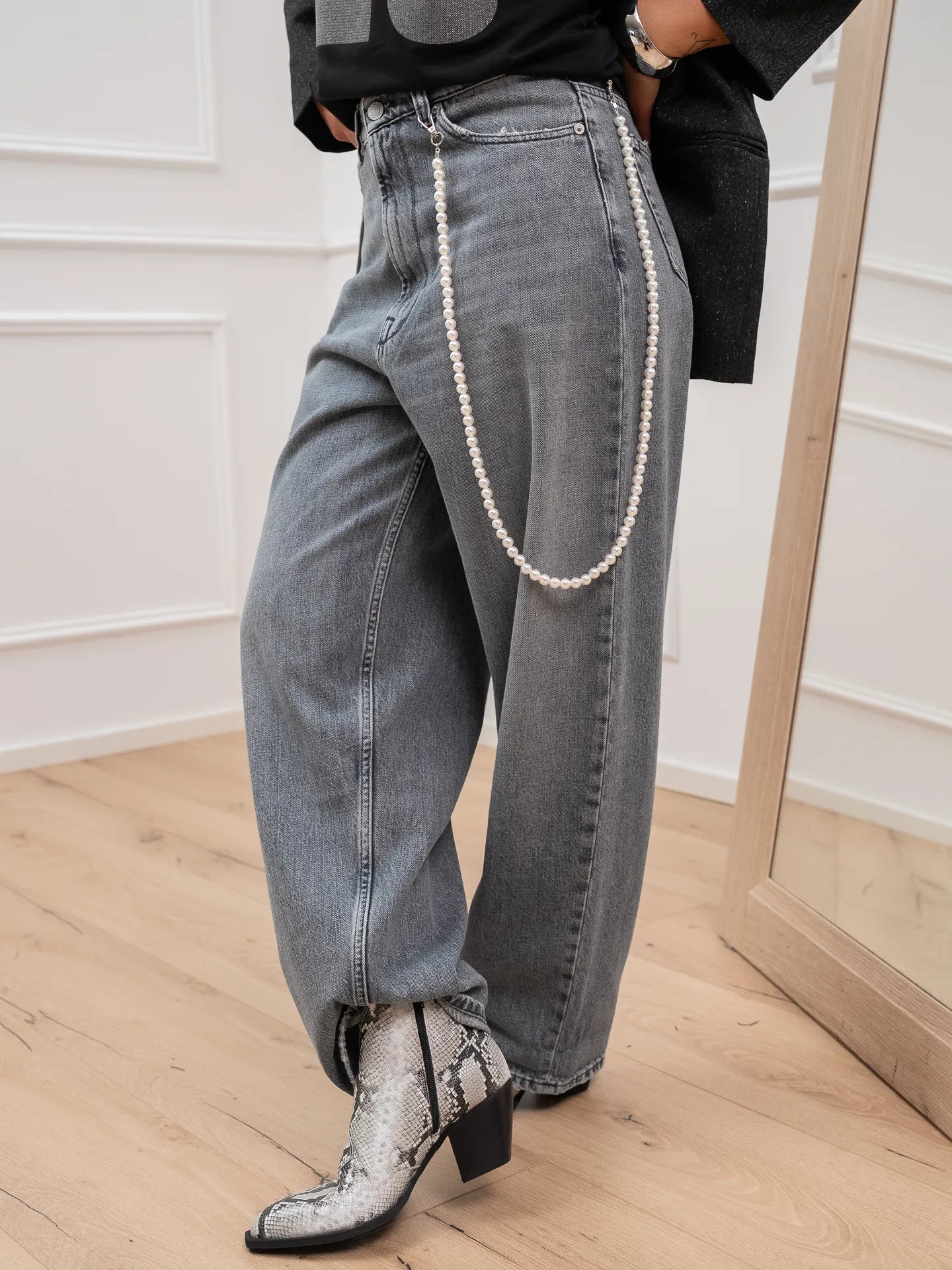 Jeans Laila in denim grigio Vicolo. Modello relaxed fit a cinque tasche. Chiusura con cerniera e bottone di metallo. Dettaglio catena con perle agganciata ai passanti.