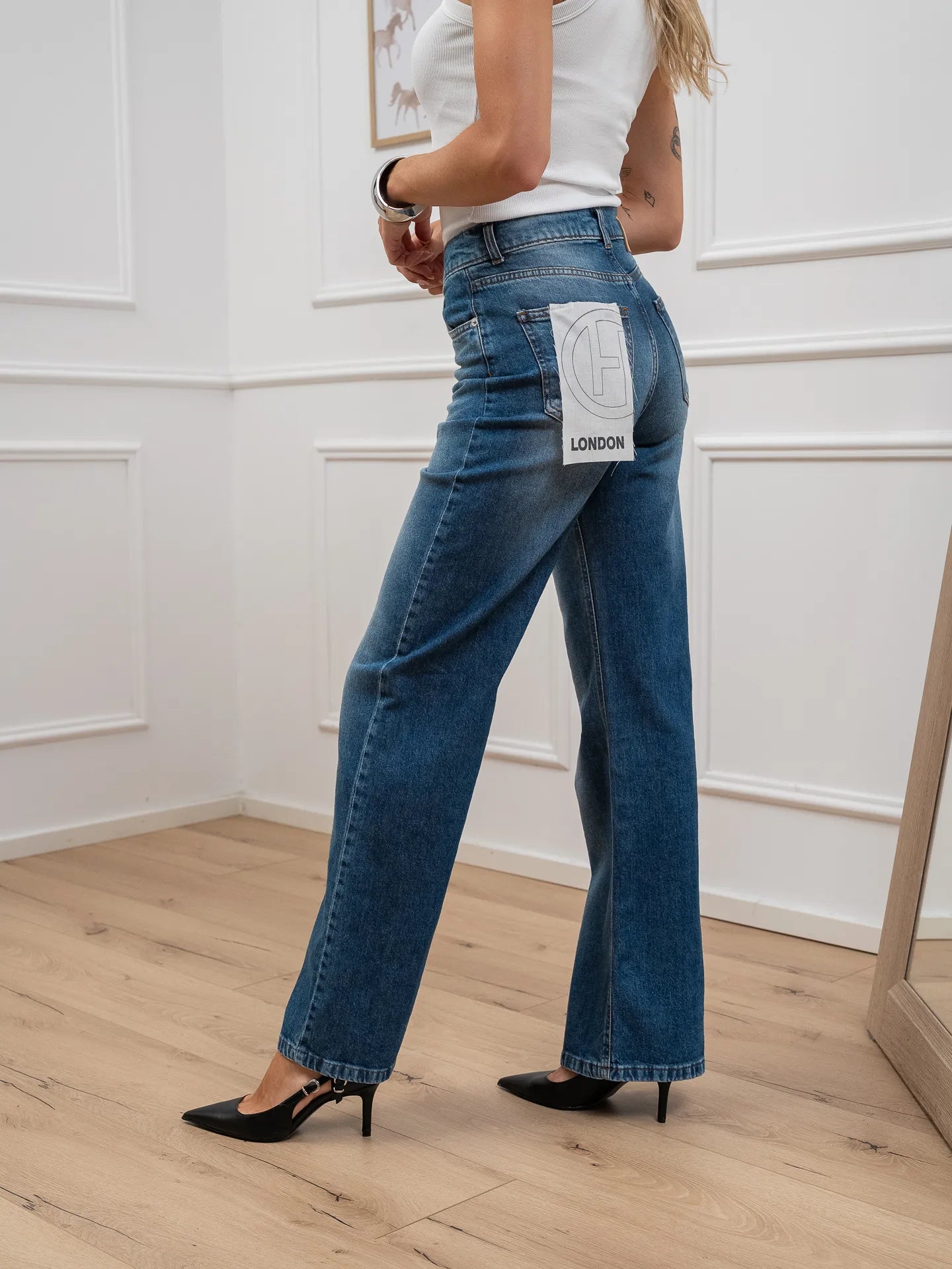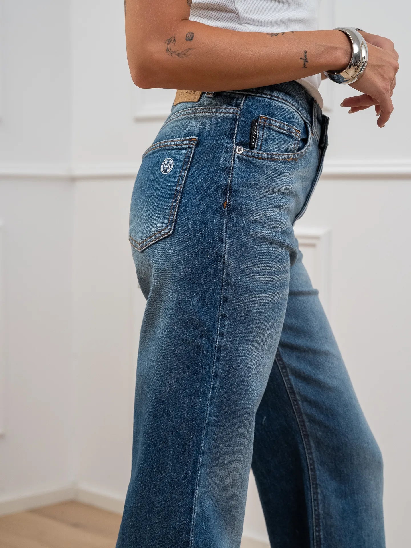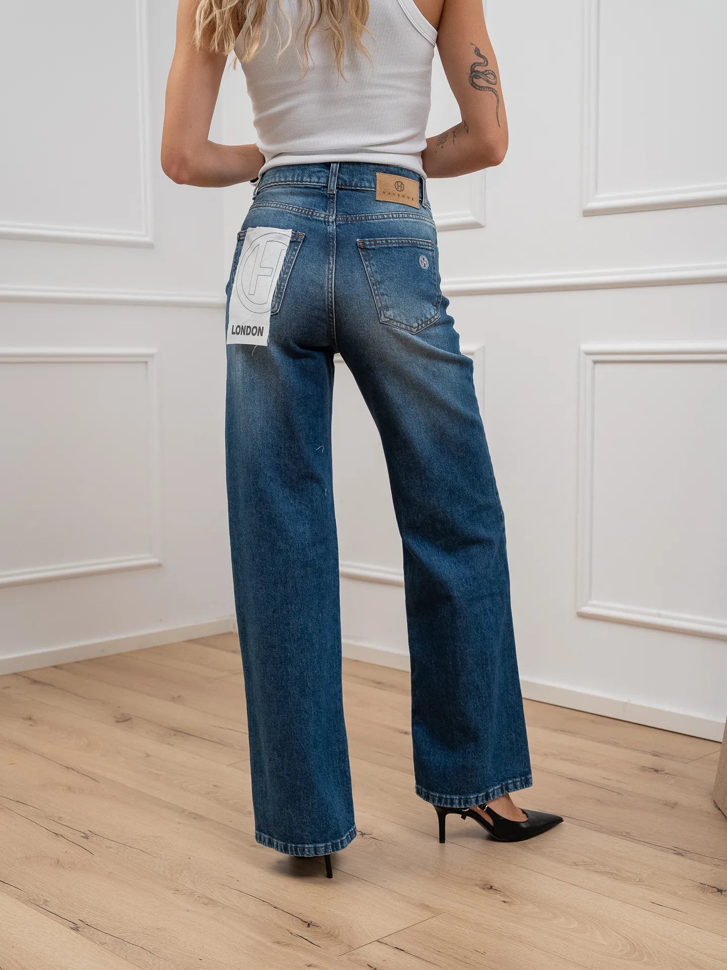 Jeans London blu denim HaveOne. Modello straight fit a vita alta. Chiusura frontale zip e bottone.