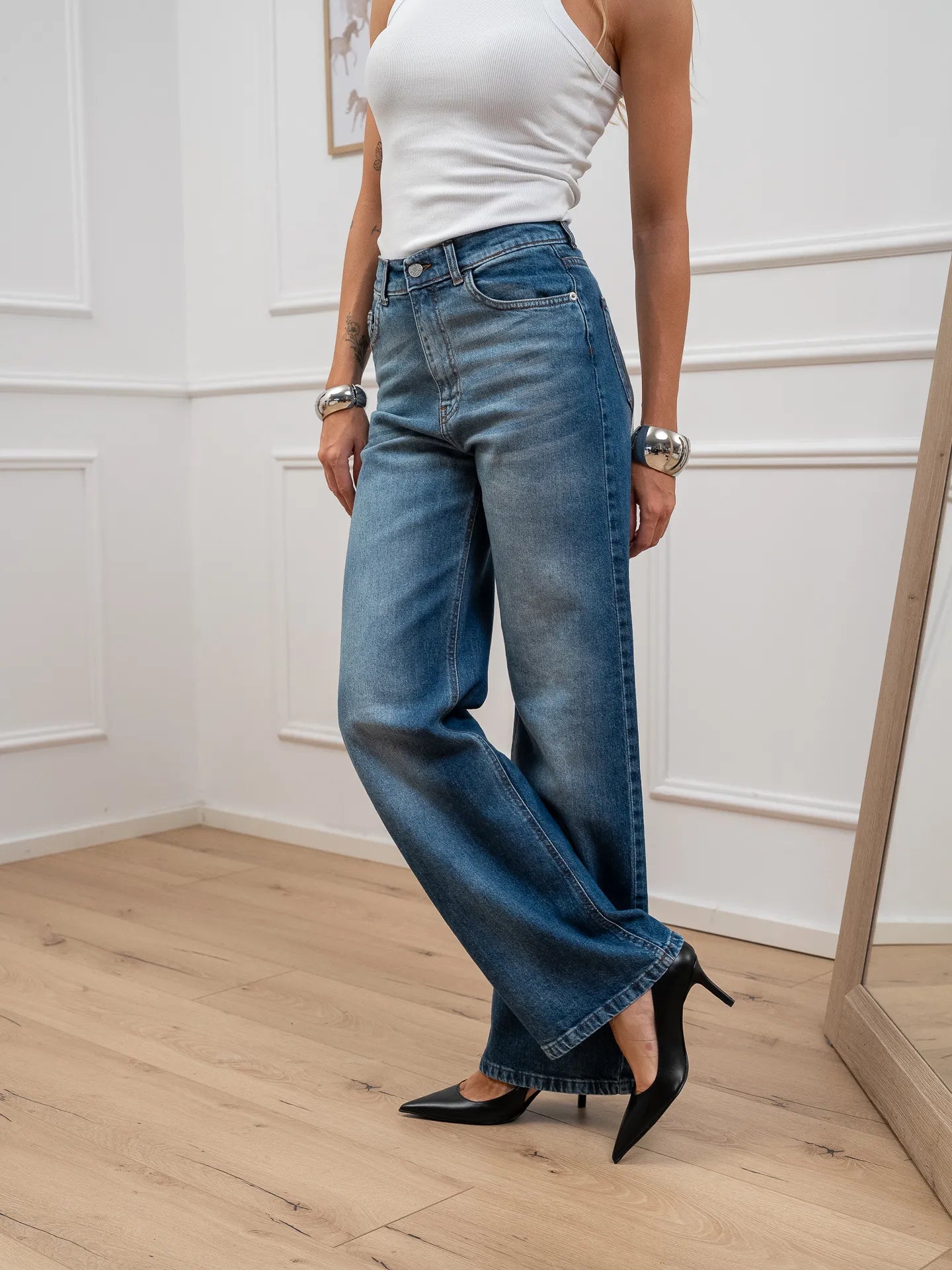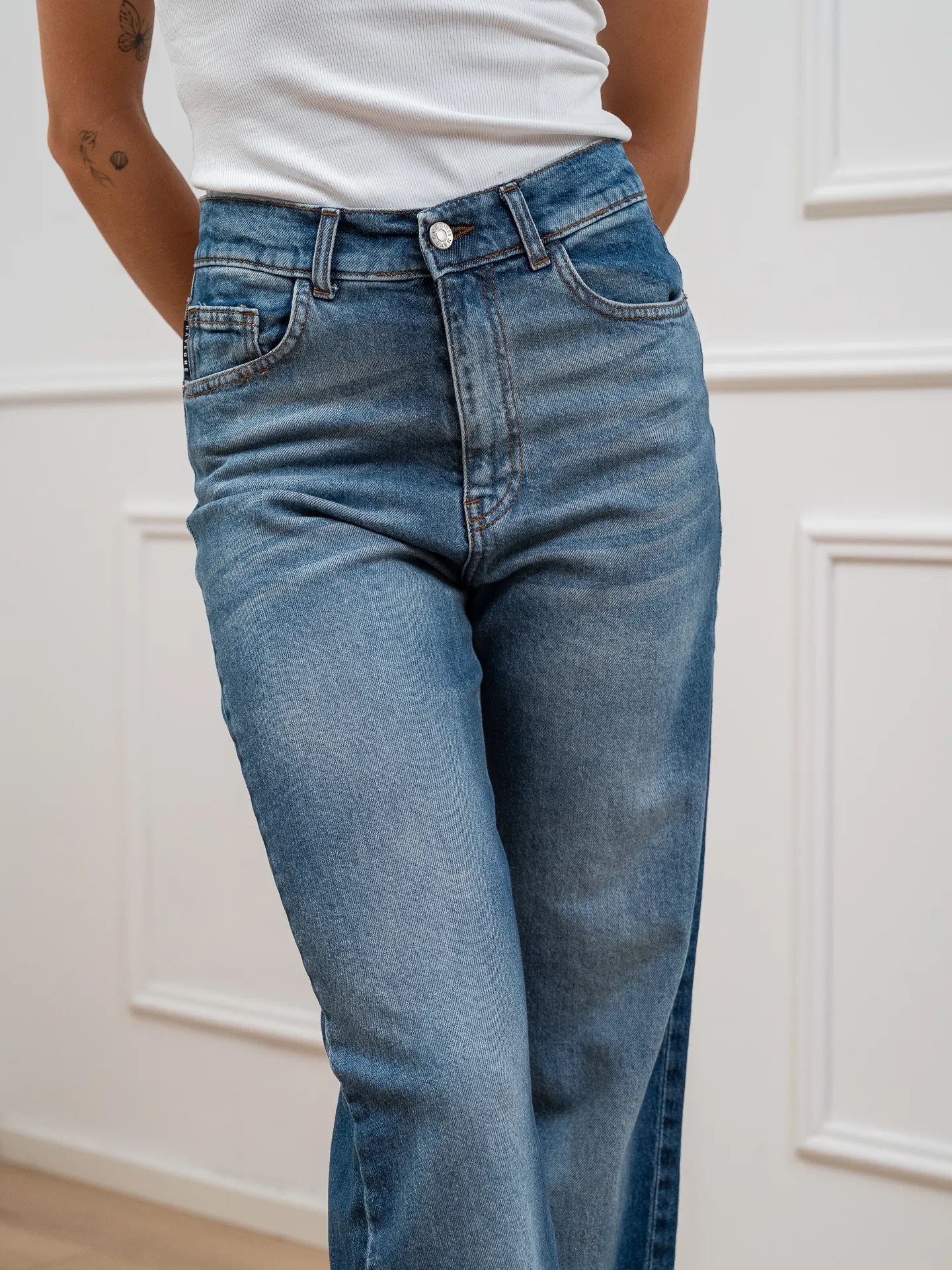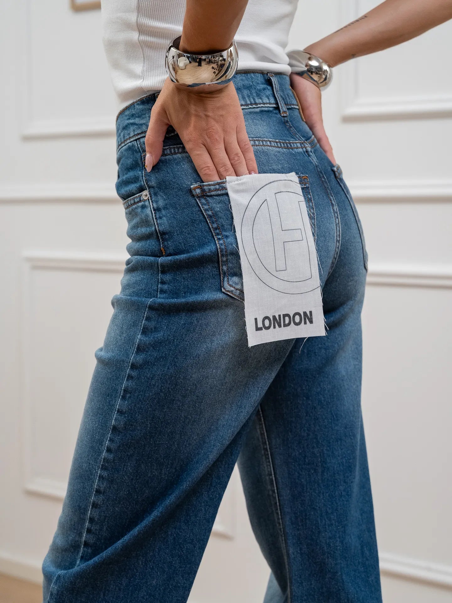 Jeans London blu denim HaveOne. Modello straight fit a vita alta. Chiusura frontale zip e bottone.