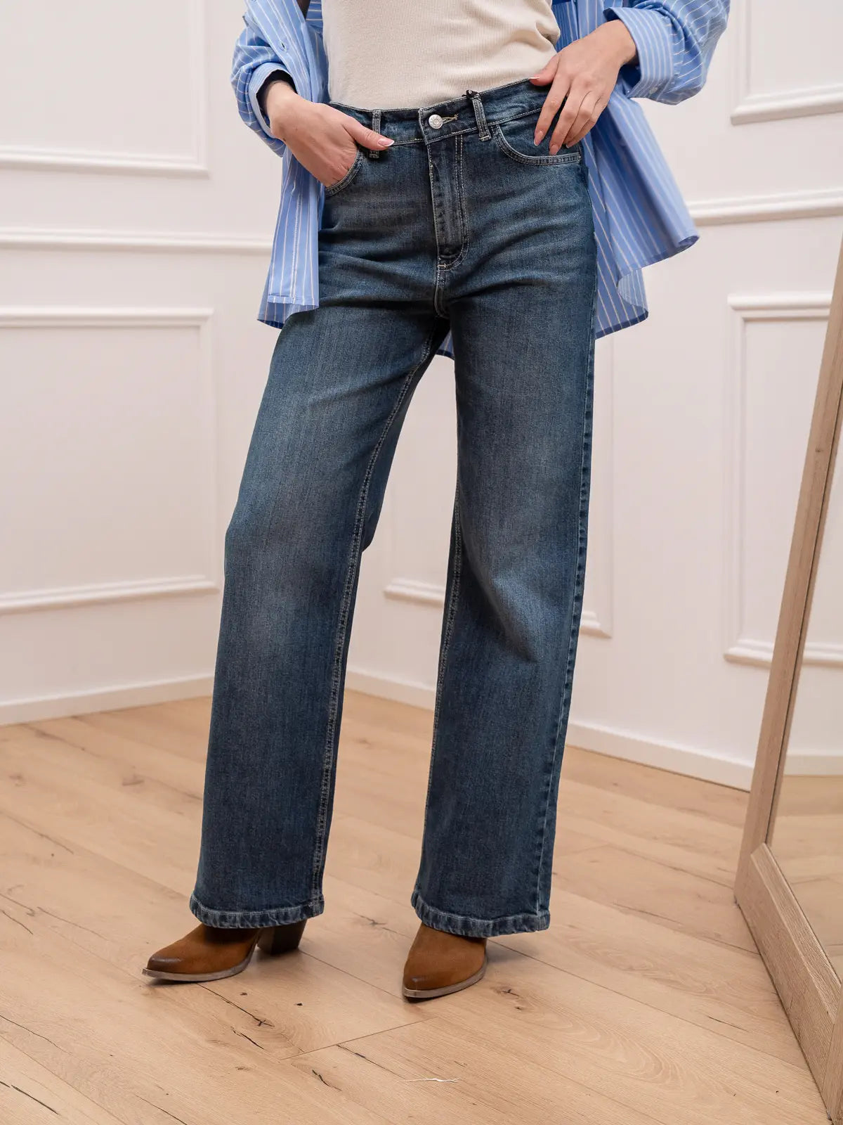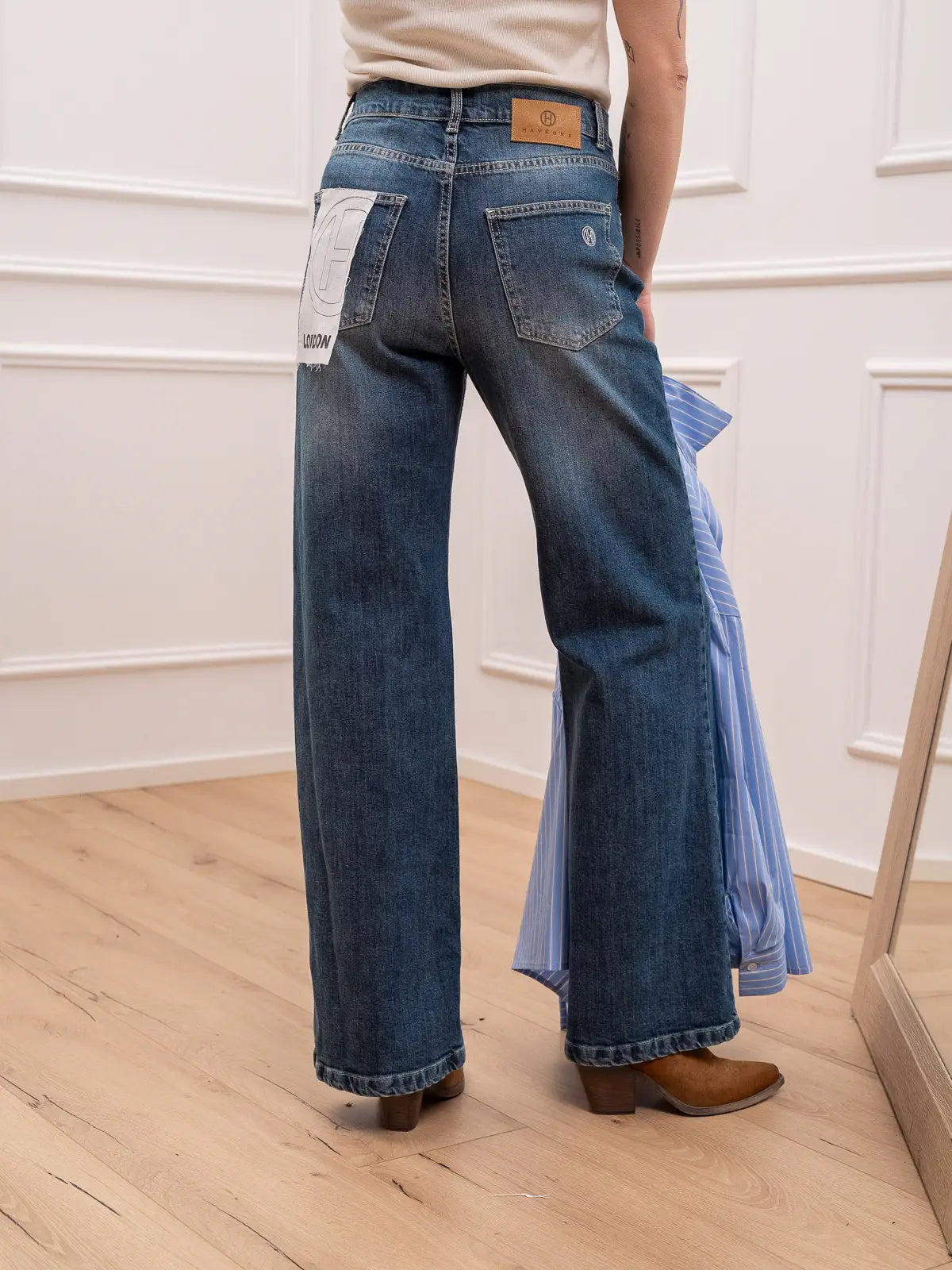 Jeans London color blu denim HaveOne. Modello straight fit a vita alta. Chiusura frontale zip e bottone.