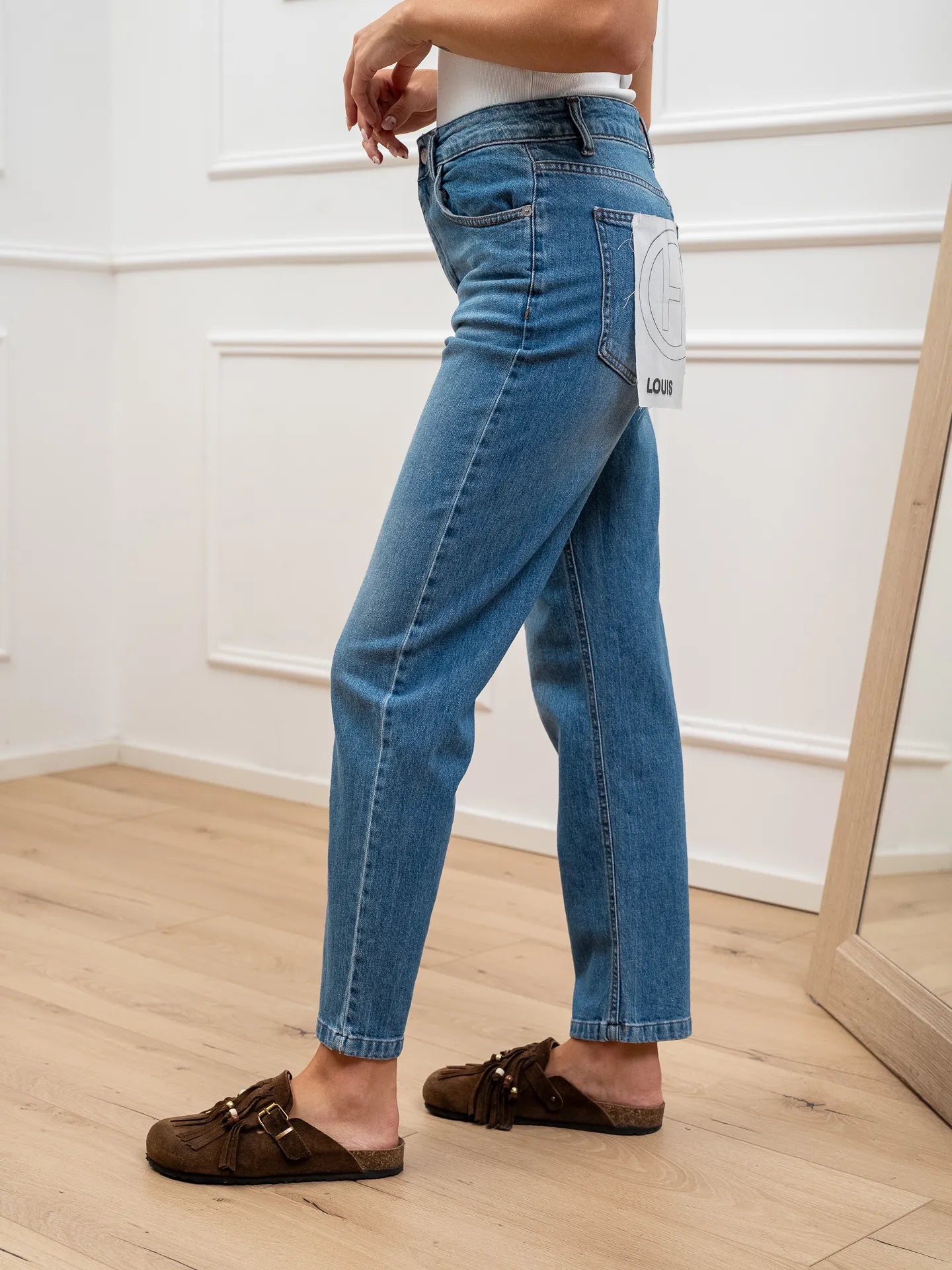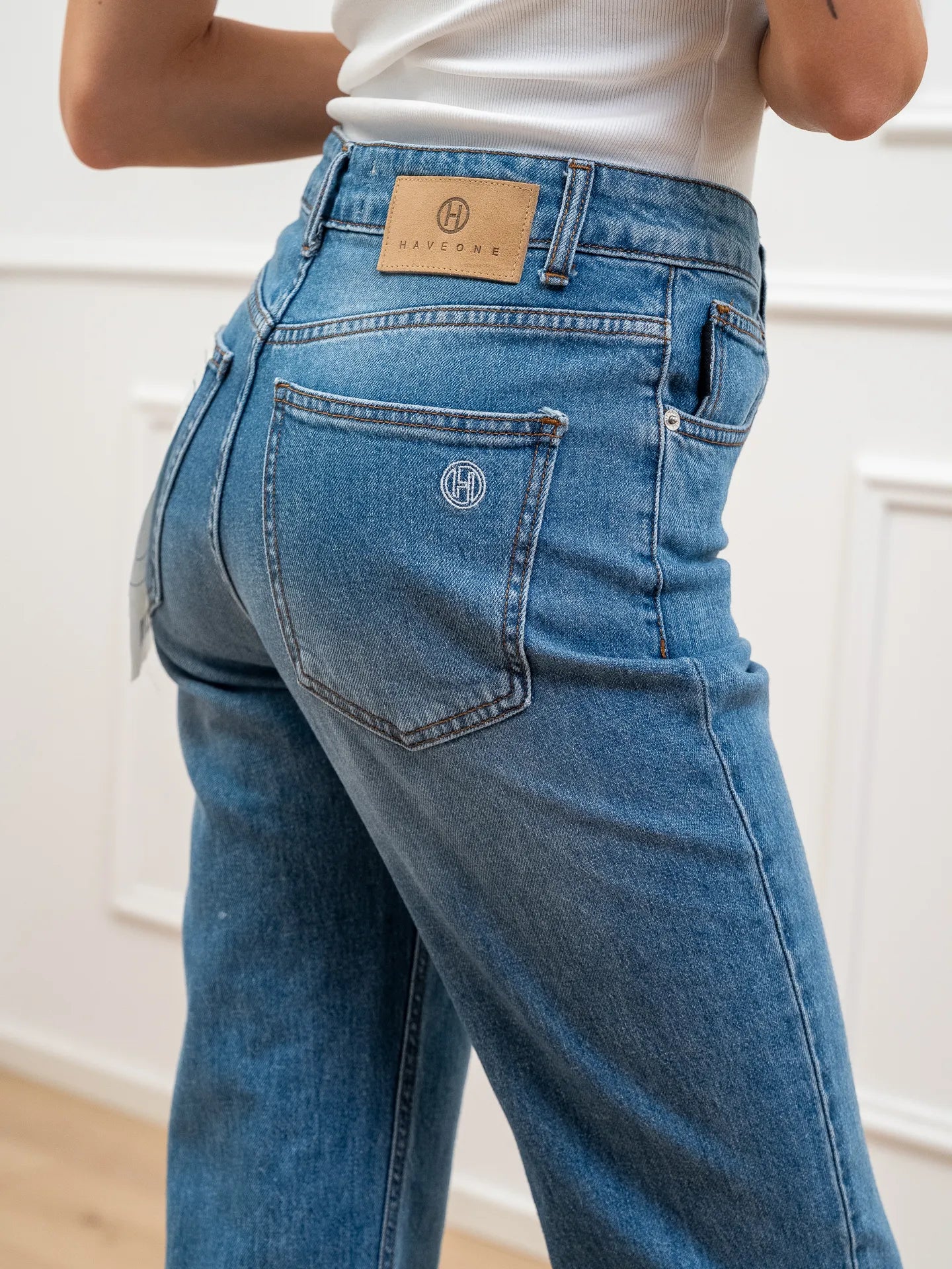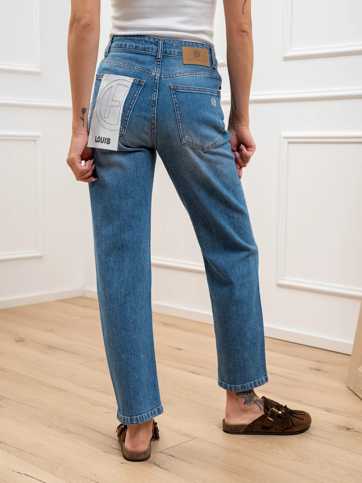 Jeans Louis denim lavaggio medio HaveOne. Modello a sigaretta morbido, vita medio alta, cinque tasche e chiusura con zip e bottone. Fit regolare.