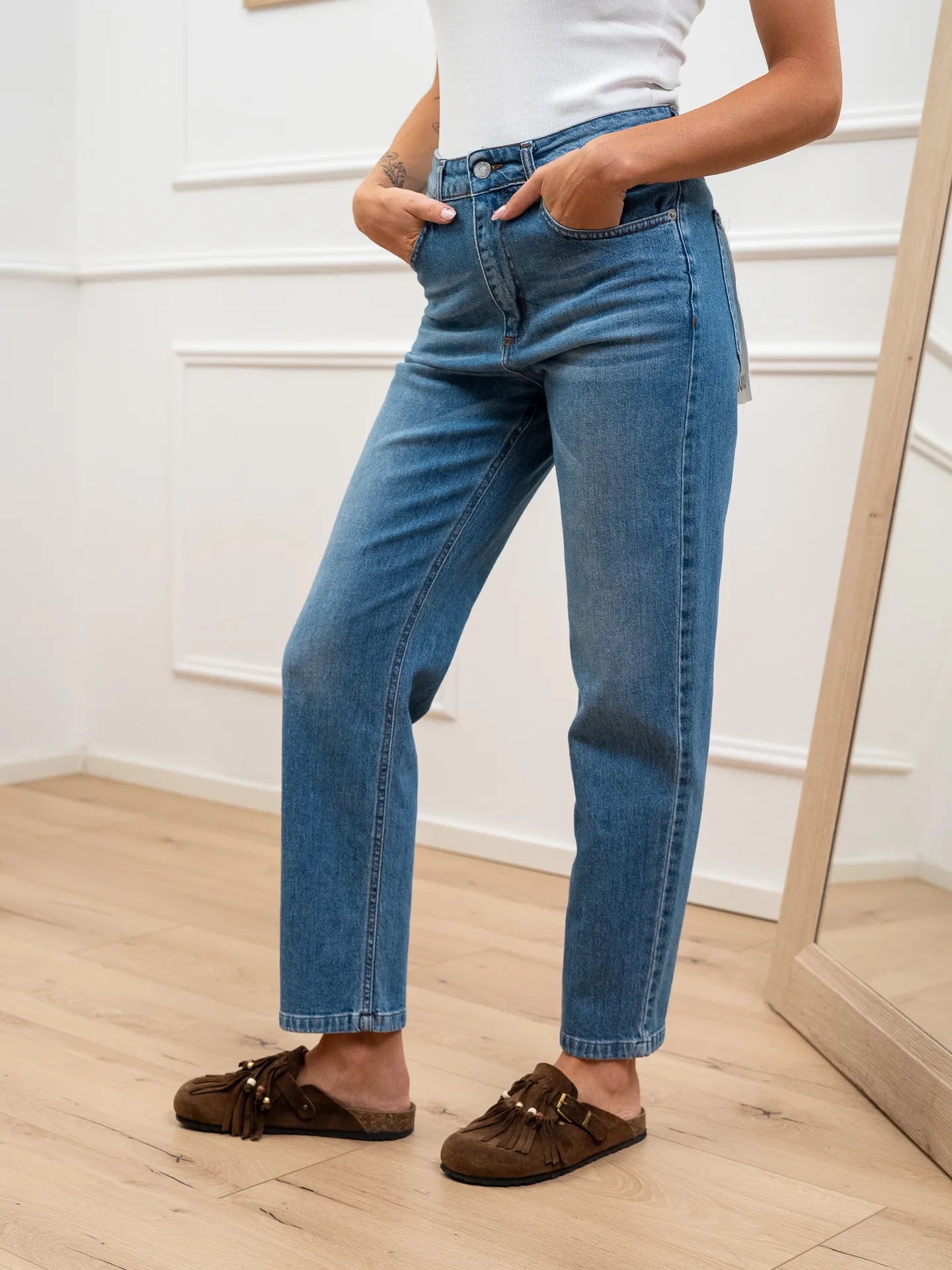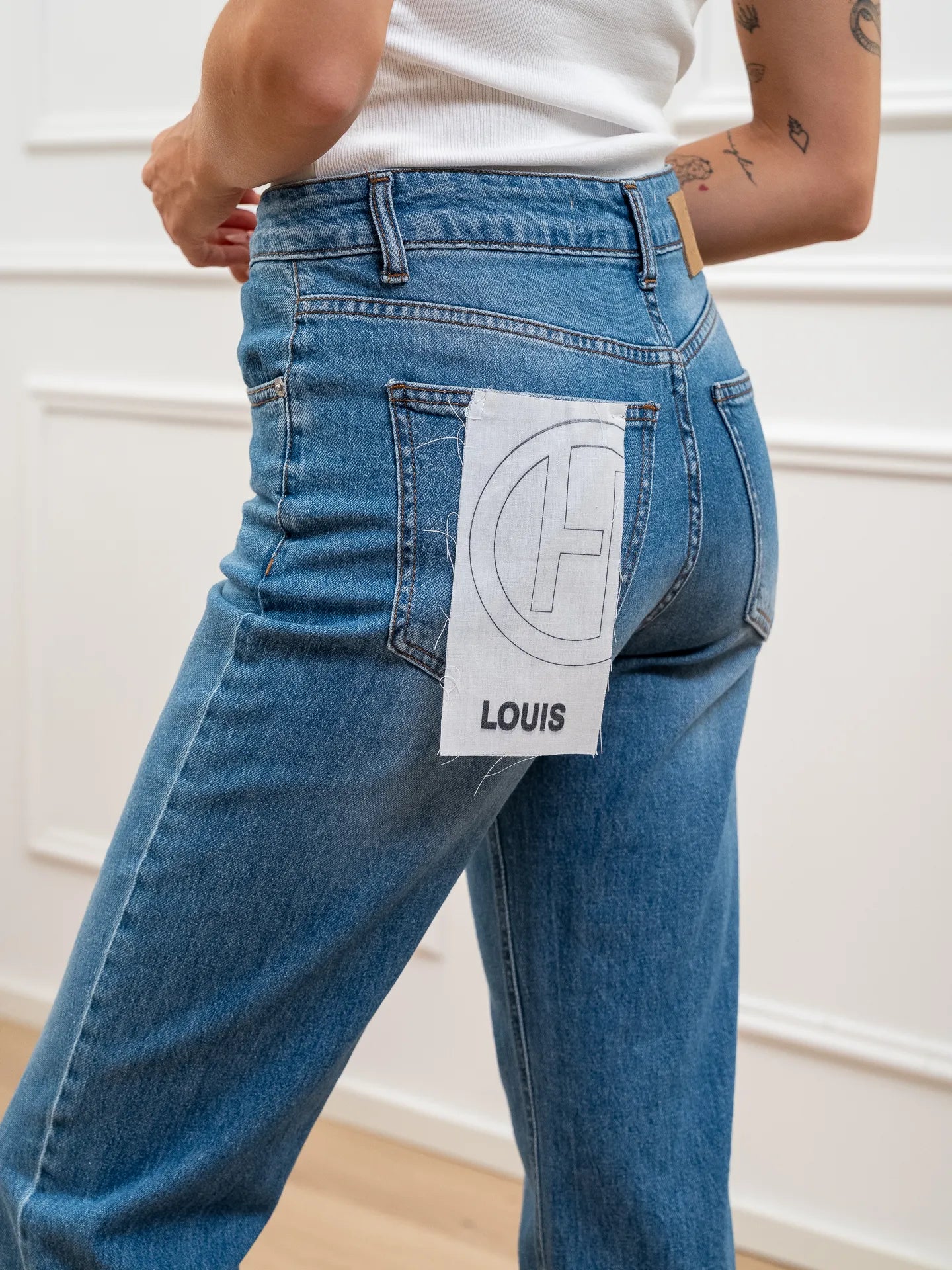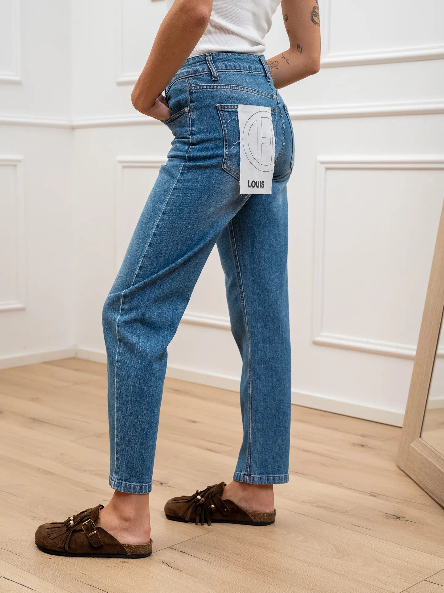 Jeans Louis denim lavaggio medio HaveOne. Modello a sigaretta morbido, vita medio alta, cinque tasche e chiusura con zip e bottone. Fit regolare.