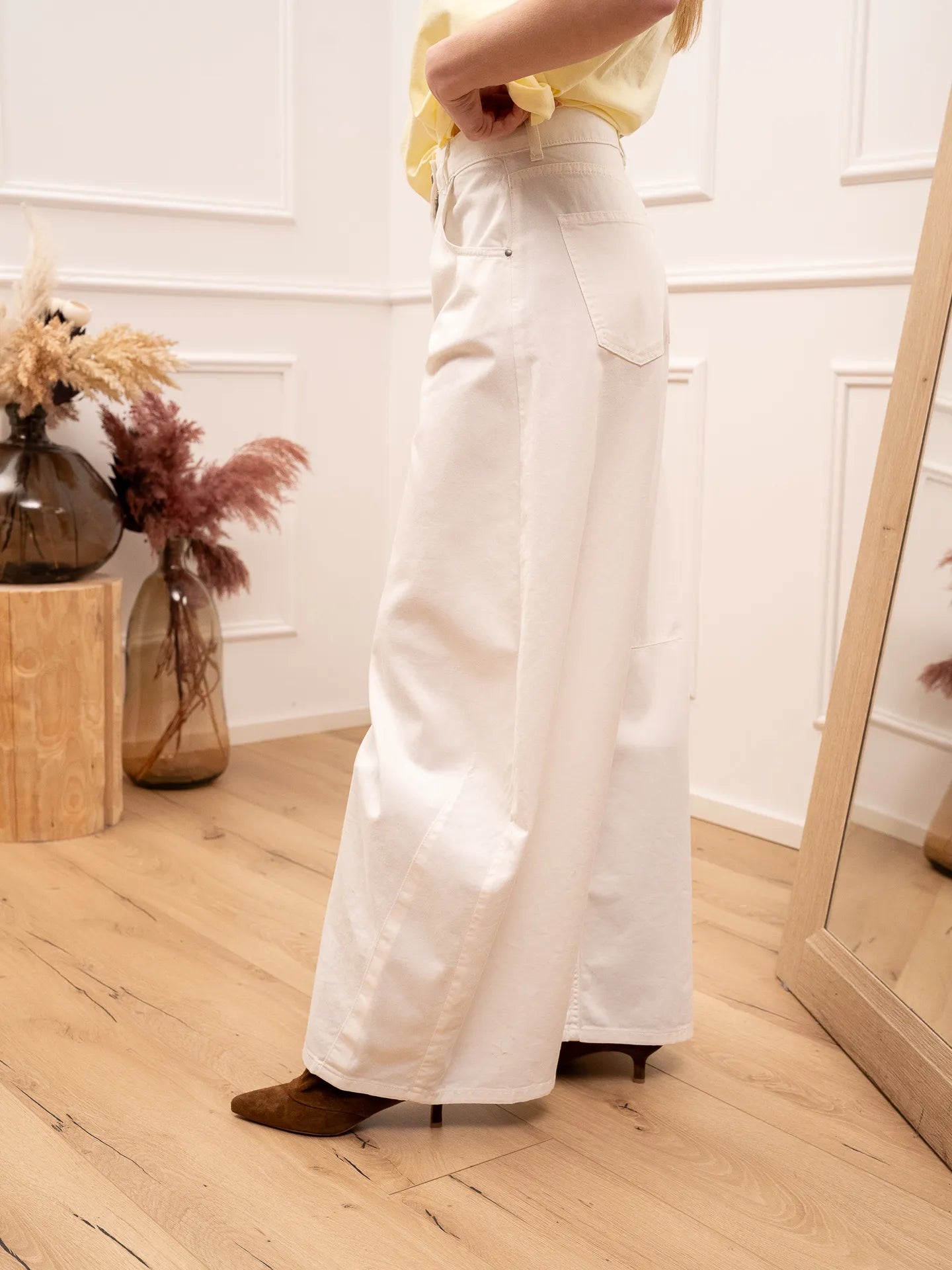 Jeans Louvre denim bianco Tensione In. Modello barrel fit a gamba ampia con vita medio alta, pinces sul ginocchio e cuciture oblique.