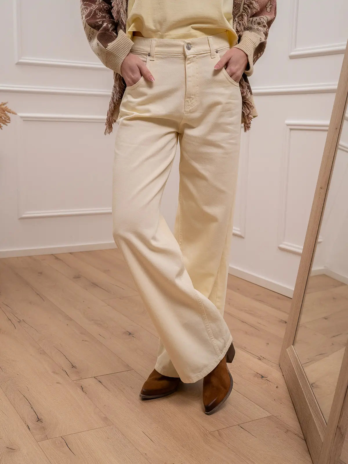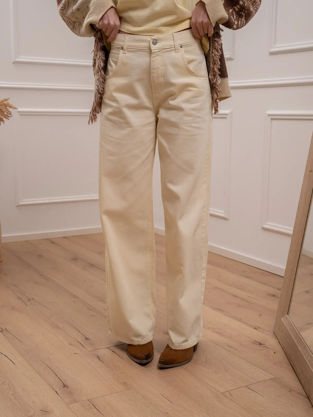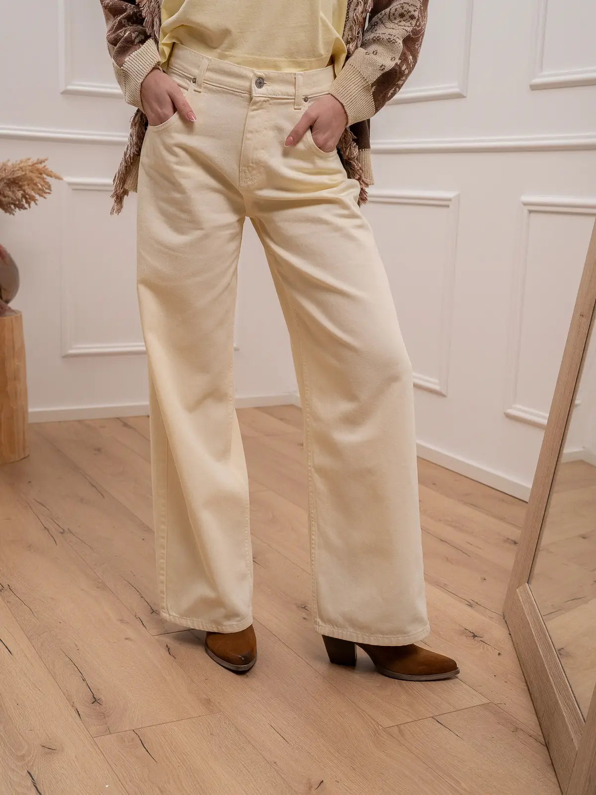 Jeans Mia in denim color giallo burro Vicolo. Modello baggy fit con gamba ampia. Vita medio alta e chiusura con bottone e zip.