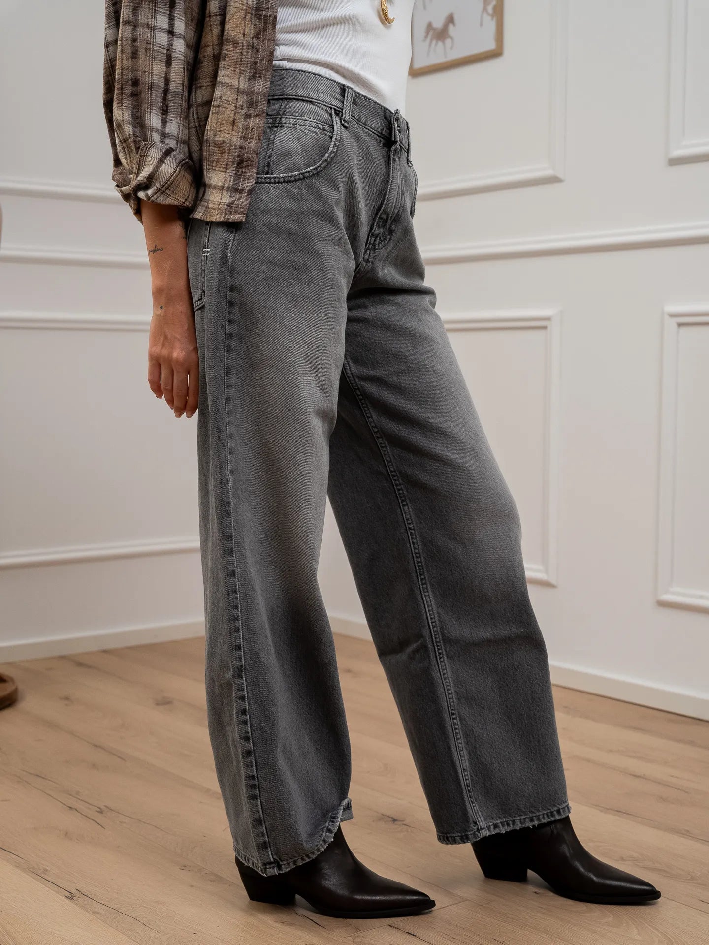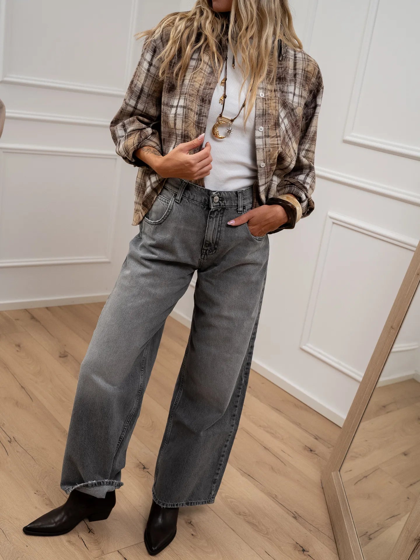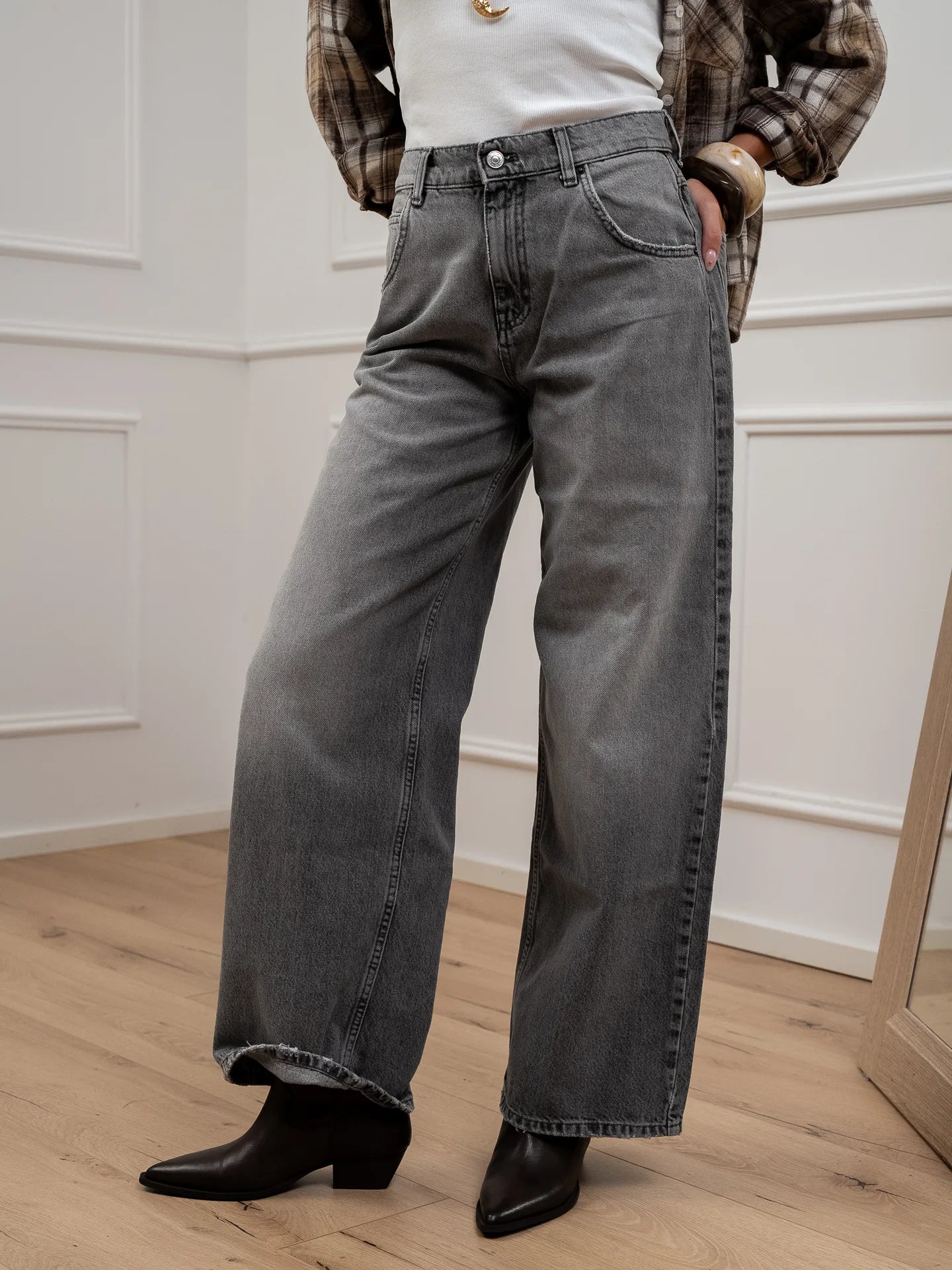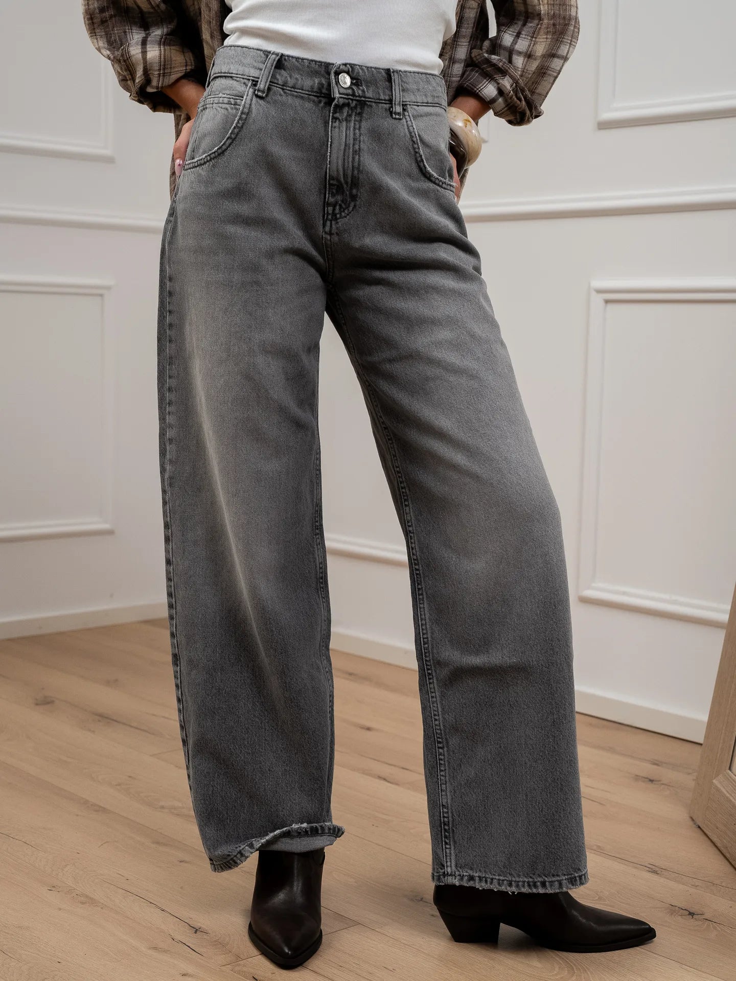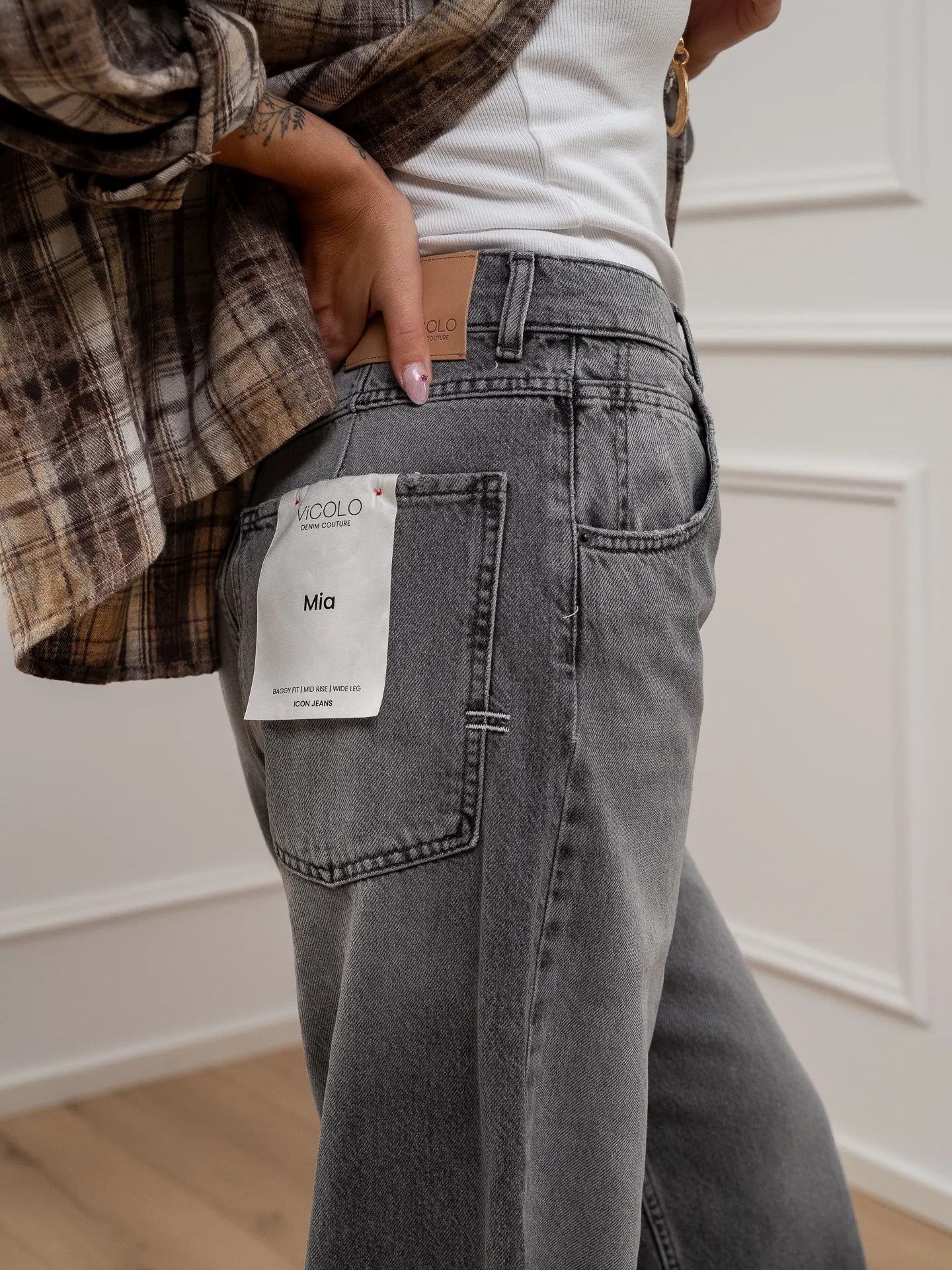 Jeans Mia in tinto capo color grigio Vicolo. Modello wide leg fit baggy gamba morbida a vita alta, chiusura con zip e bottone in metallo.
