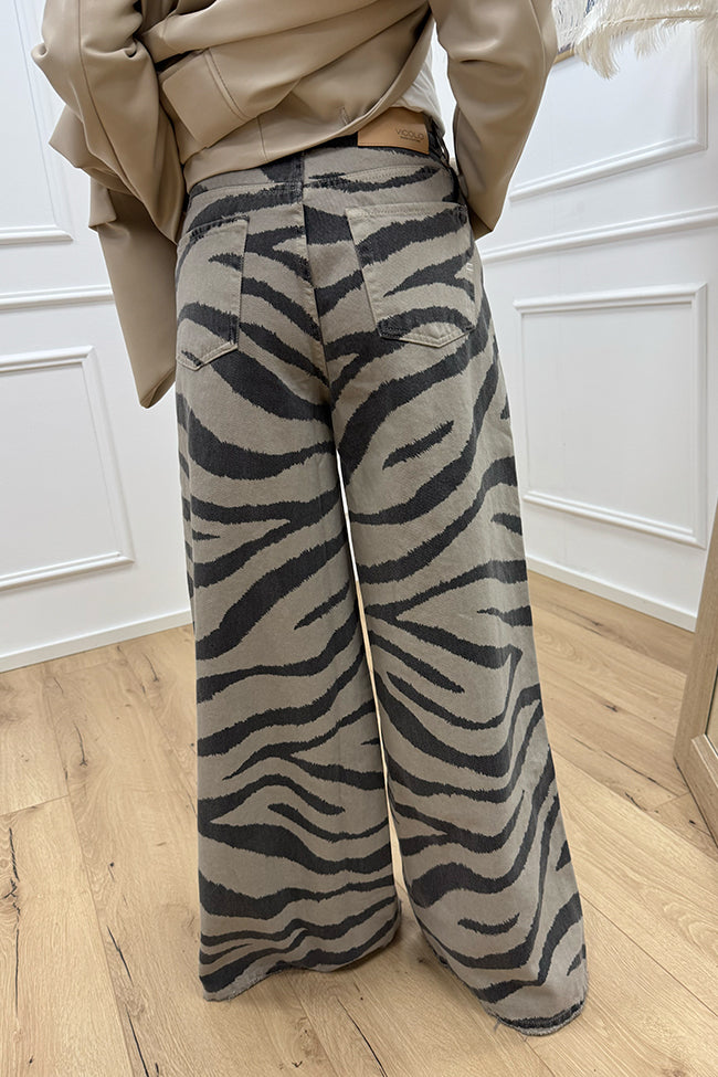 Jeans Myrna fantasia zebrato sui toni del pietra Vicolo. Modello wide leg a gamba ampia e vita alta. Chiusura zip e bottone.