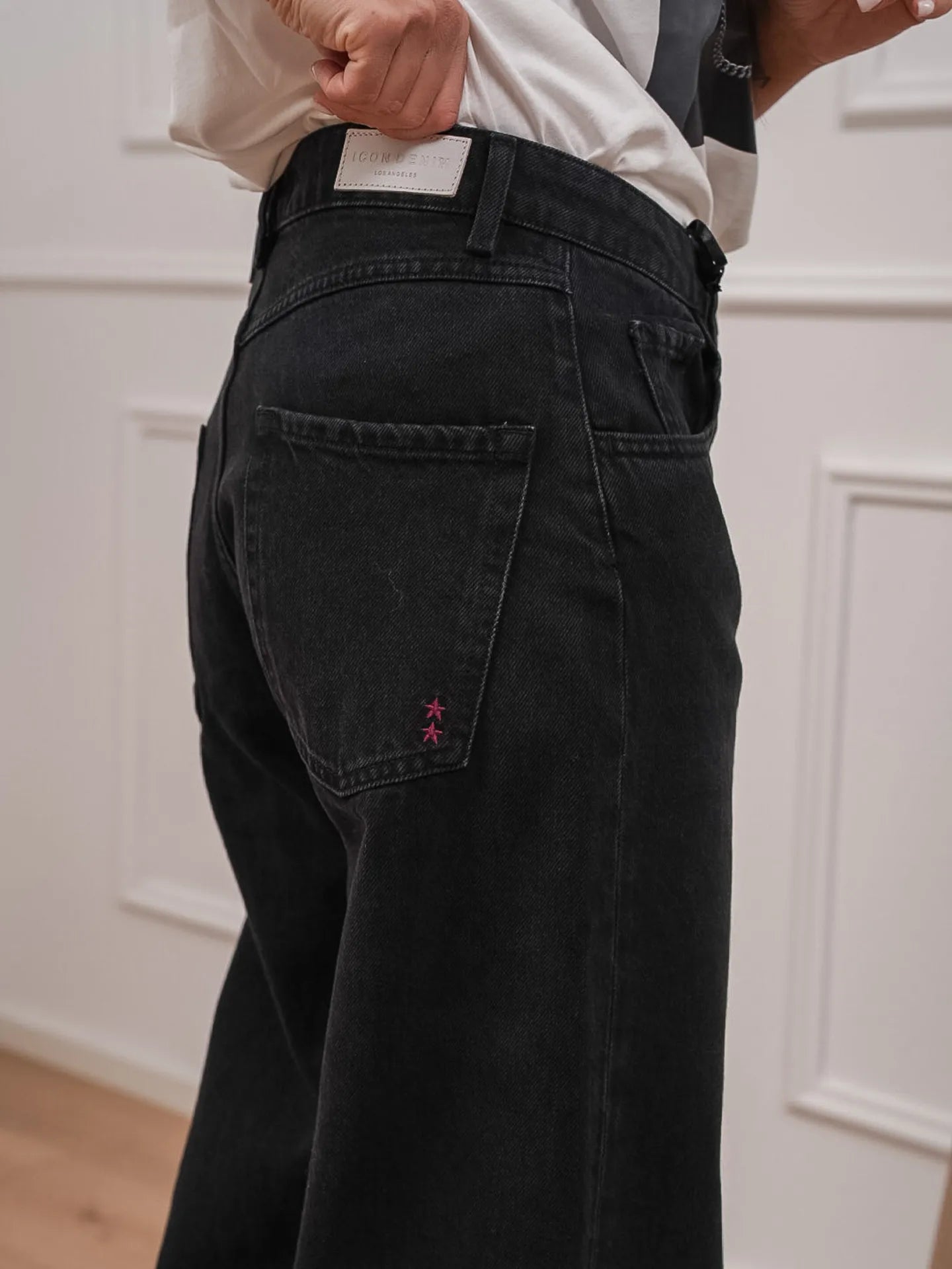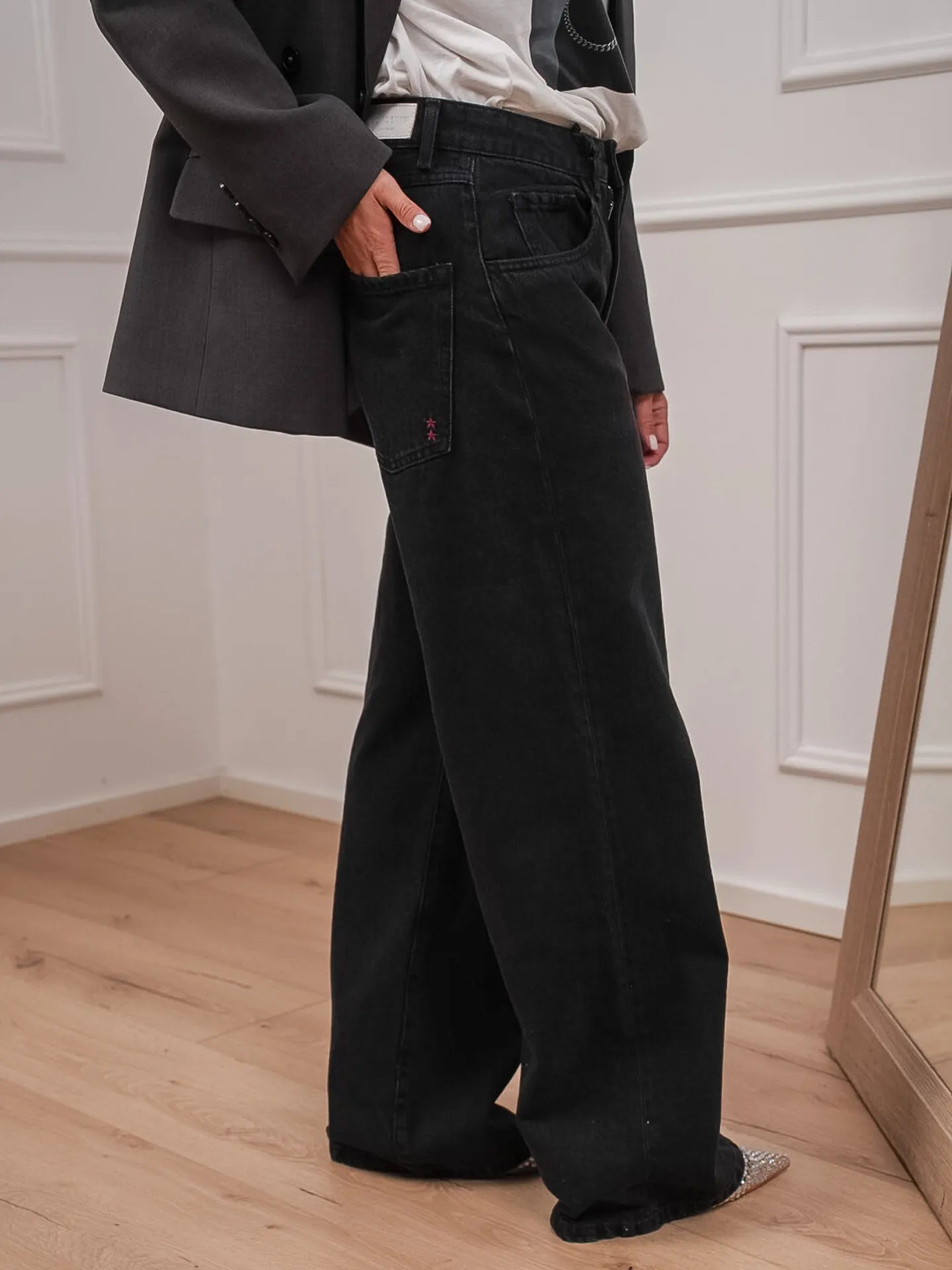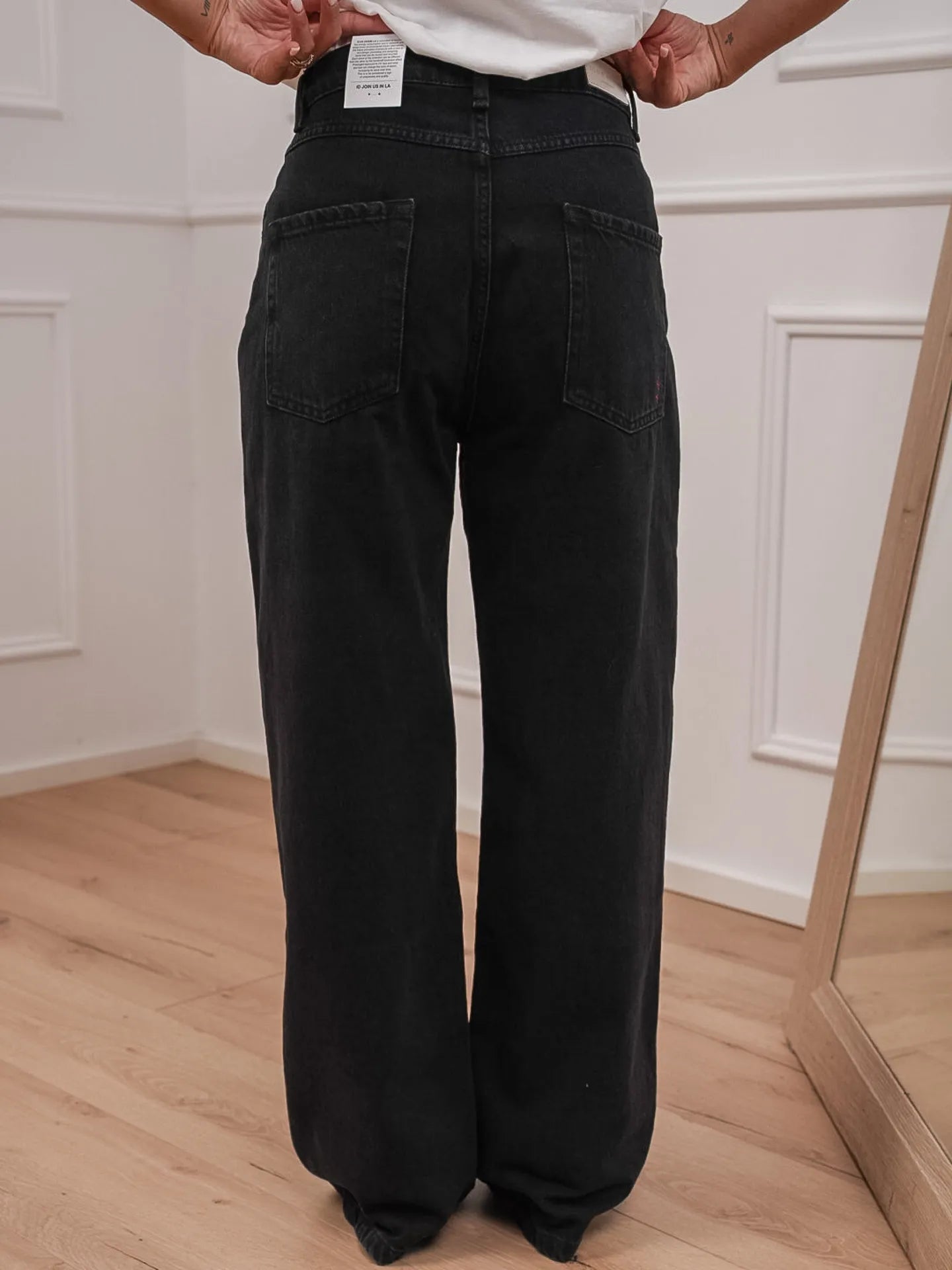 Jeans Poppy color nero tela ferma Icon Denim. Modello senza rotture wide leg gamba morbida a vita medio alta e chiusura con zip e bottone.