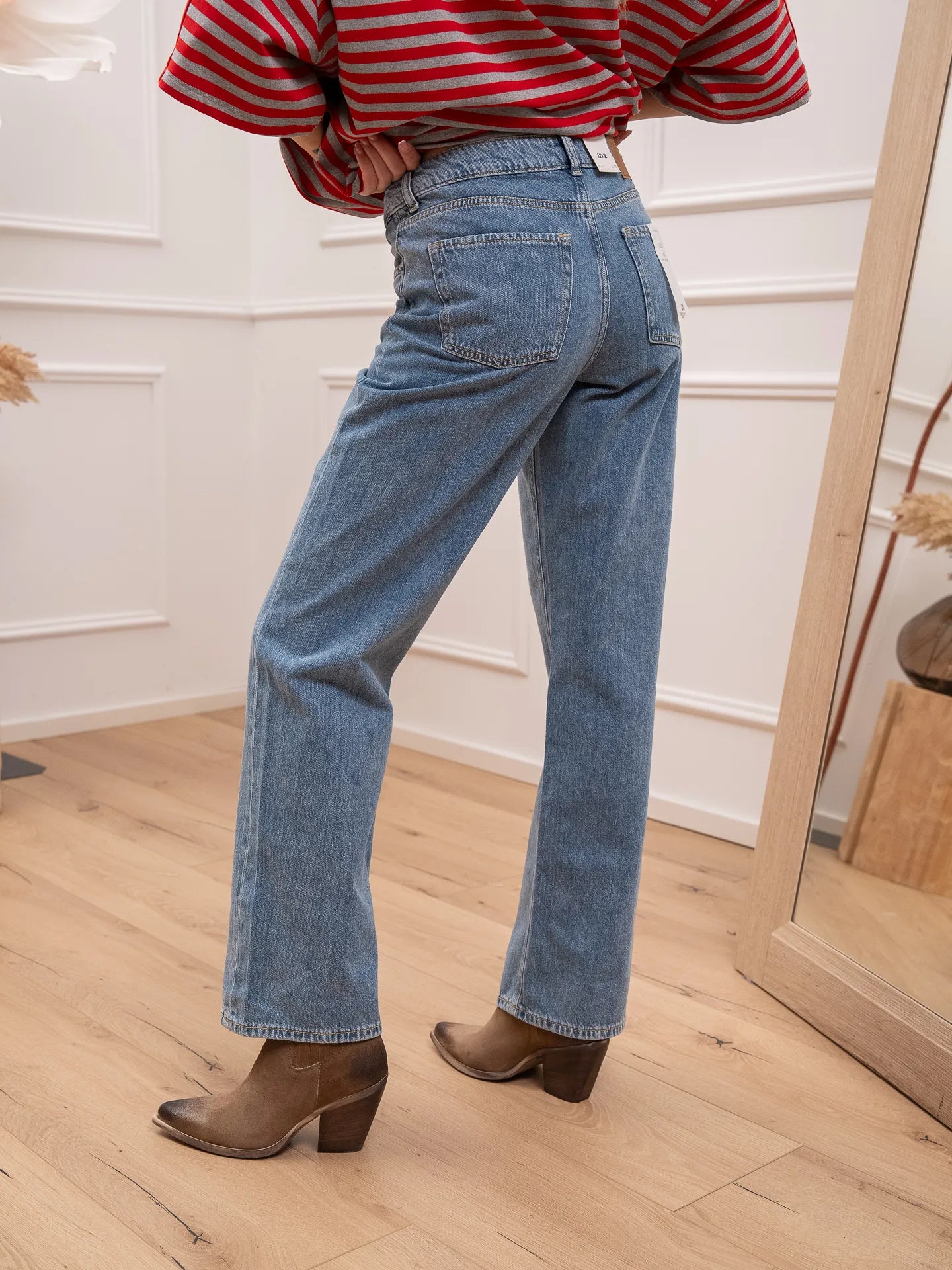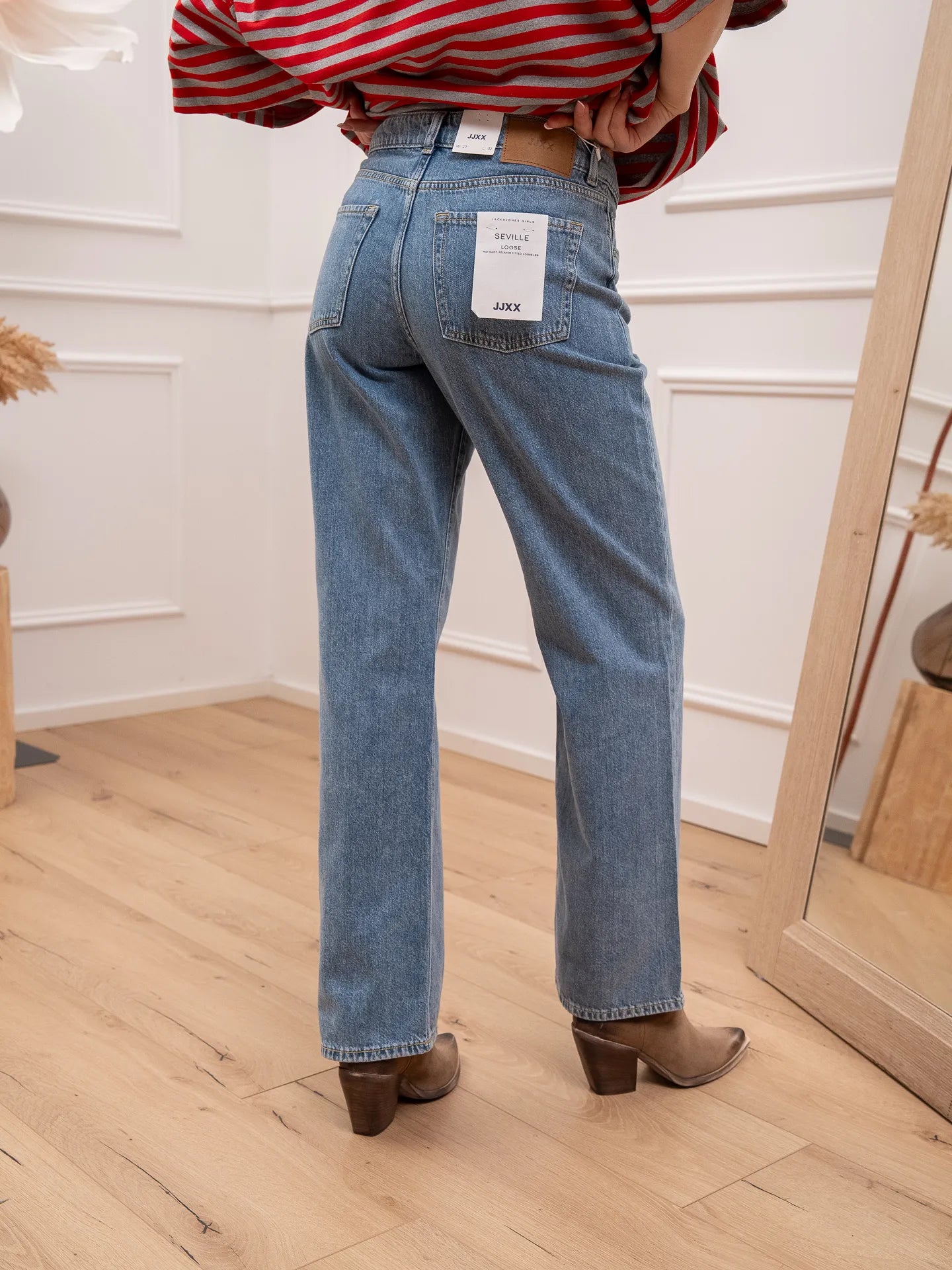 Jeans Seville blu denim JJXX. Modello a vita media, loose fit con gamba morbida. Chiusura bottone e zip.