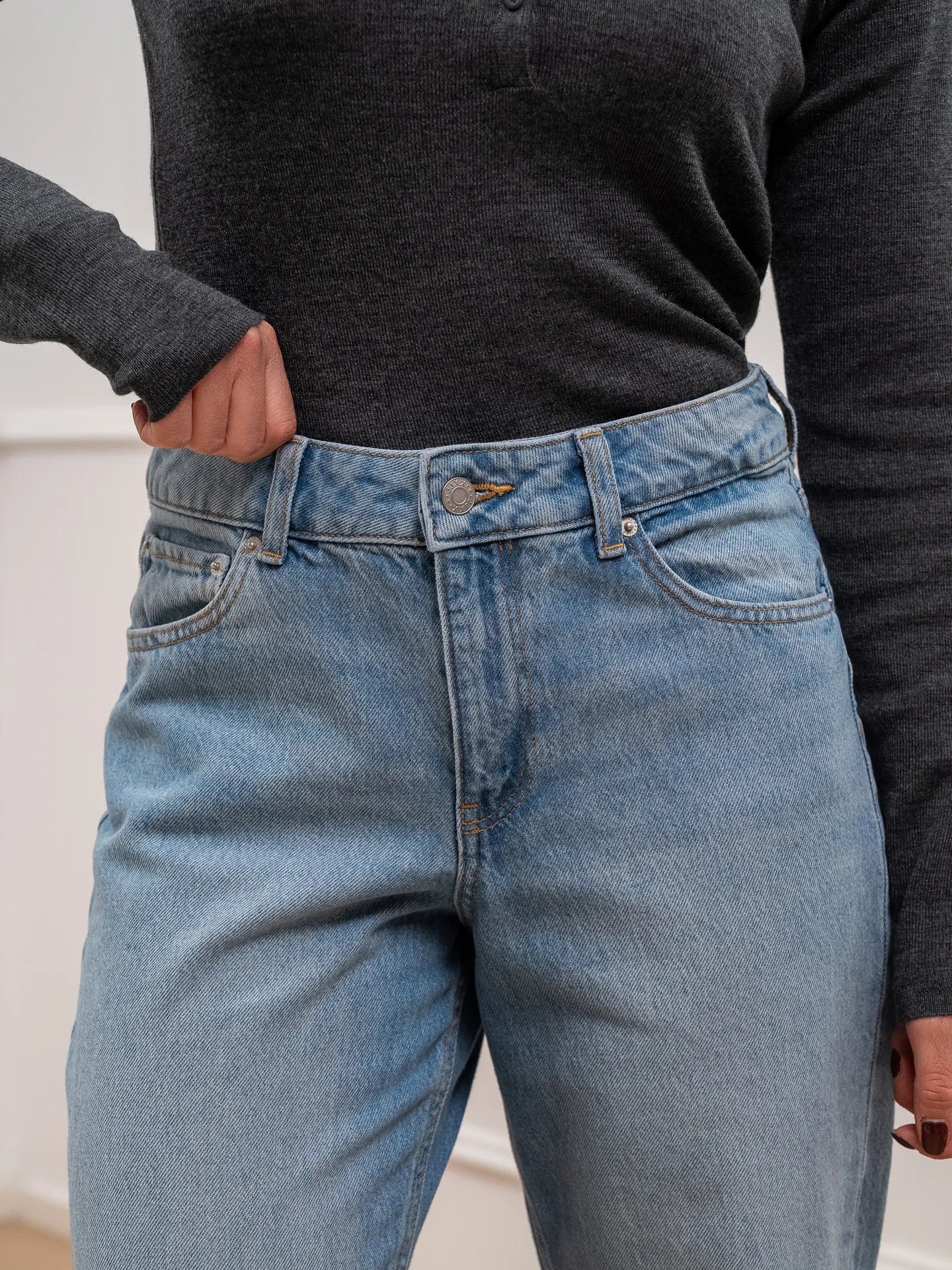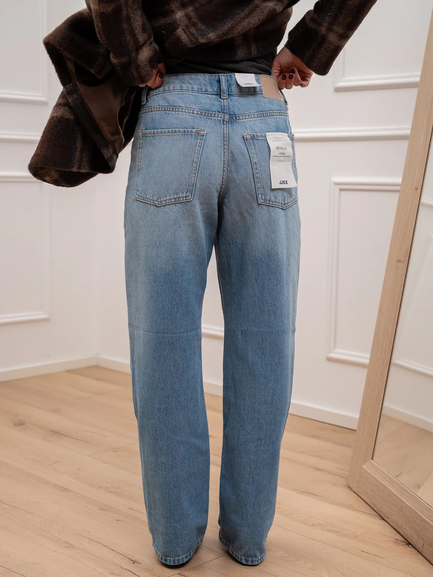 Jeans Seville lavaggio chiaro JJXX. Modello a vita media, relaxed fit con gamba morbida. Chiusura bottone e zip.