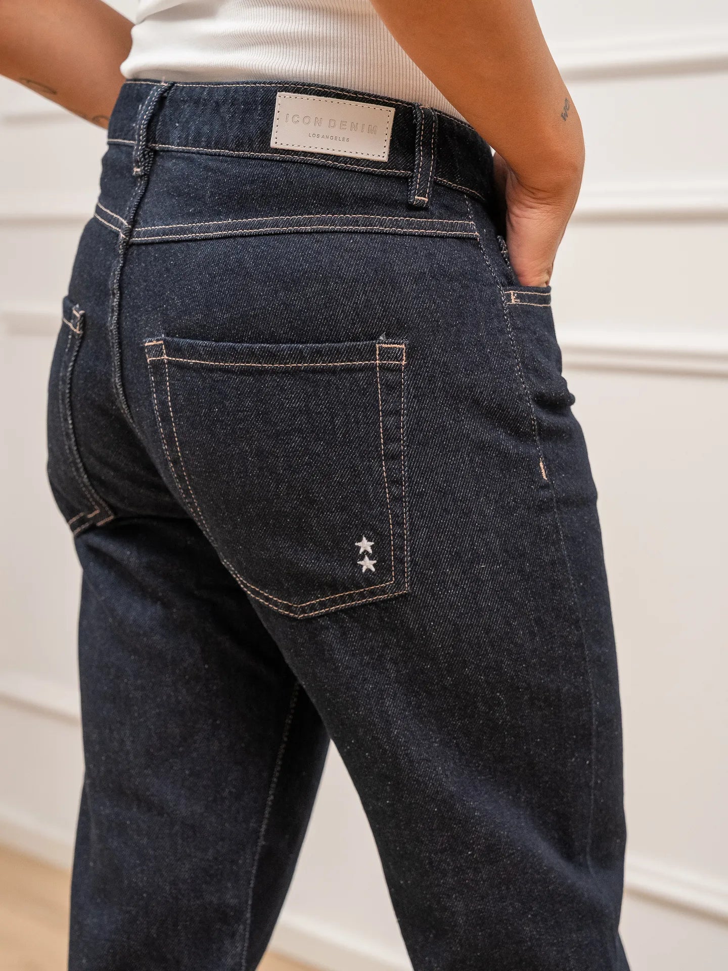 Jeans Tiny in denim blu scuro Icon Denim. Modello media scesa con chiusura bottone e zip. Gamba dritta e dettaglio di risvolto sul fondo.