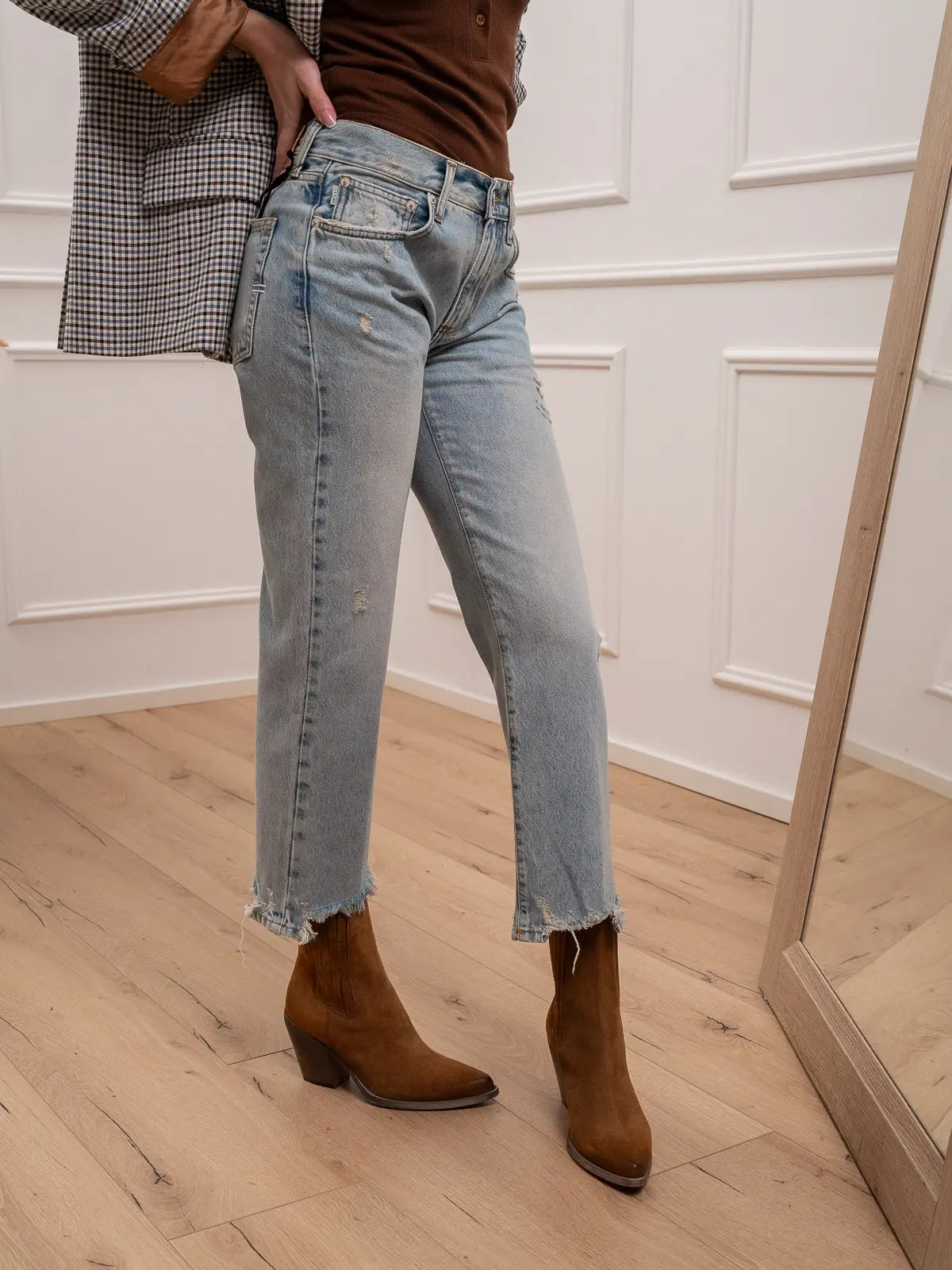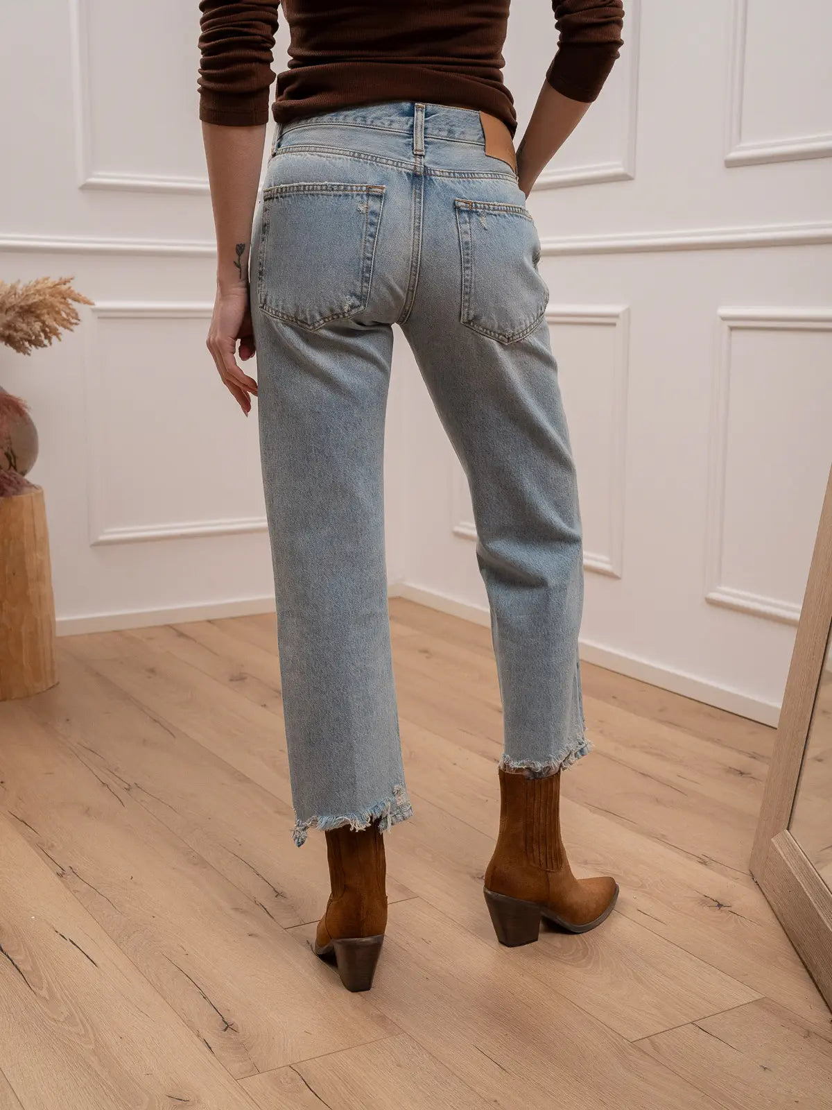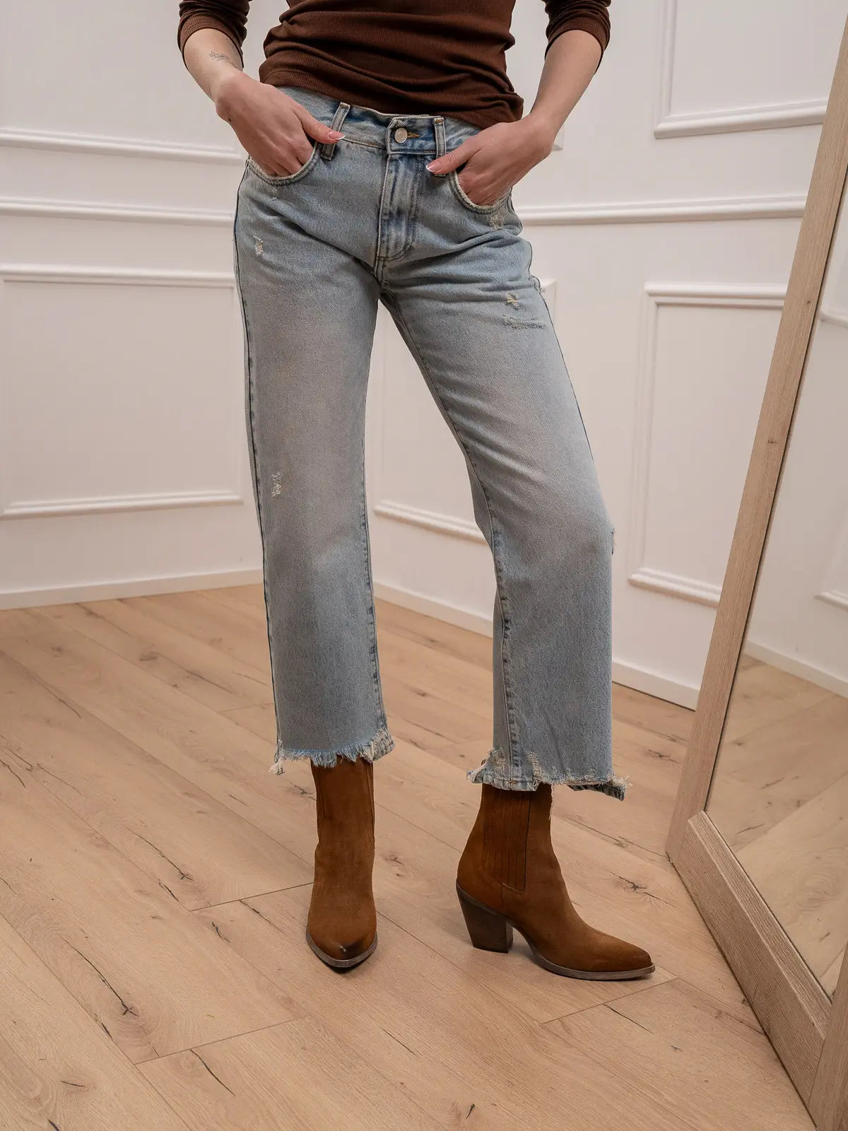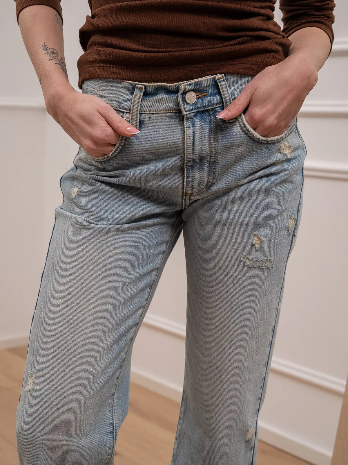 Jeans Zeke denim vintage Vicolo. Modello slim fit leggermente crop con dettaglio di rotture e vita medio bassa. Chiusura bottone e zip.