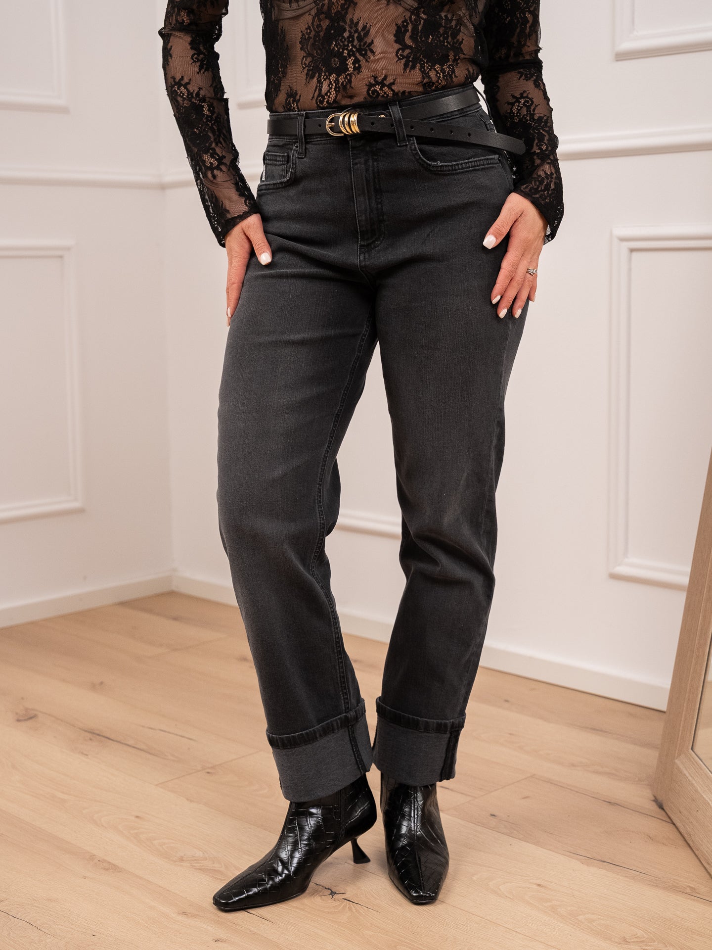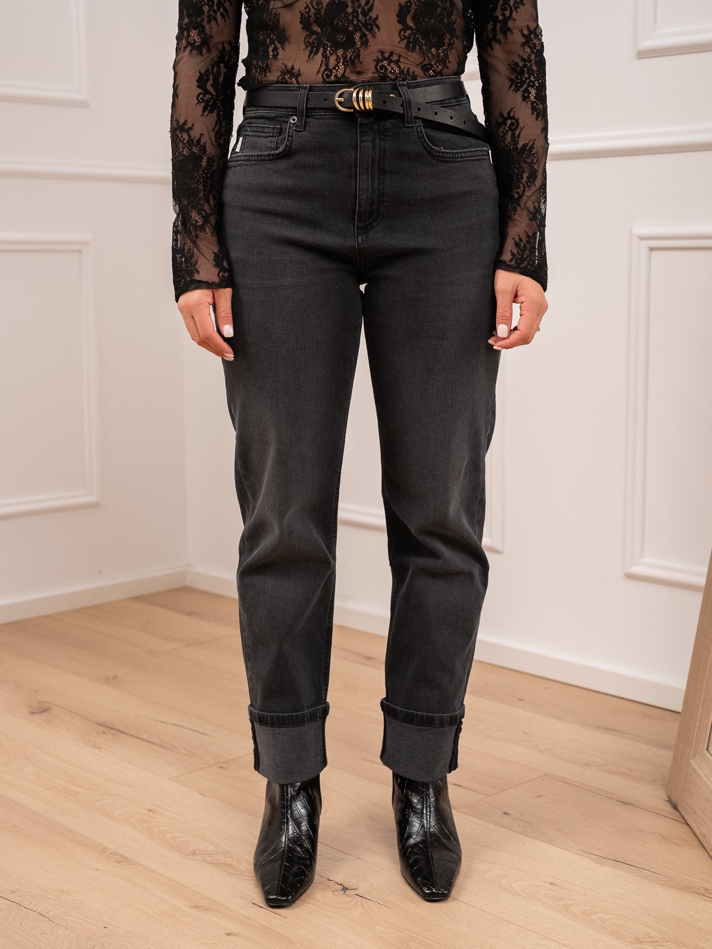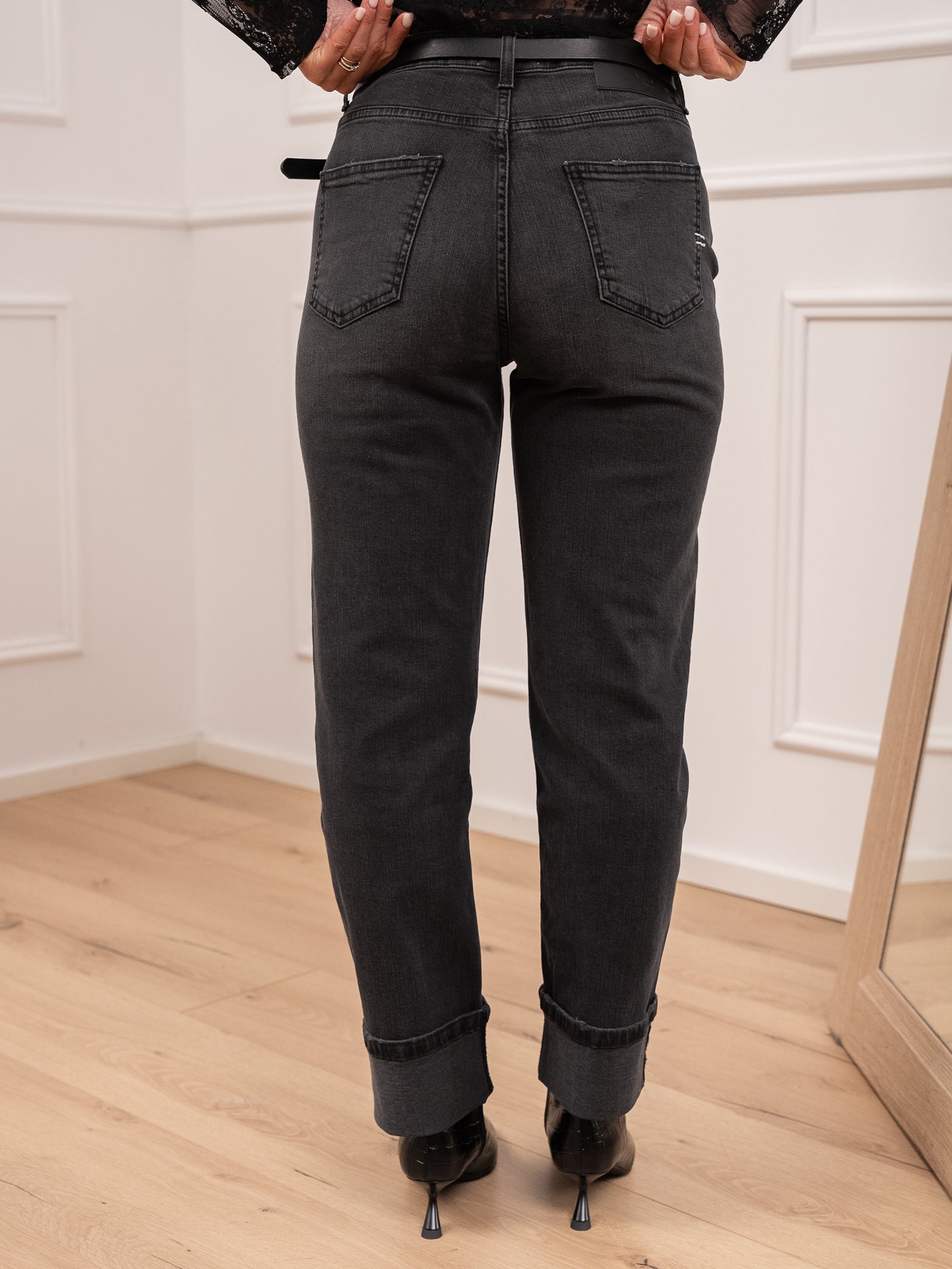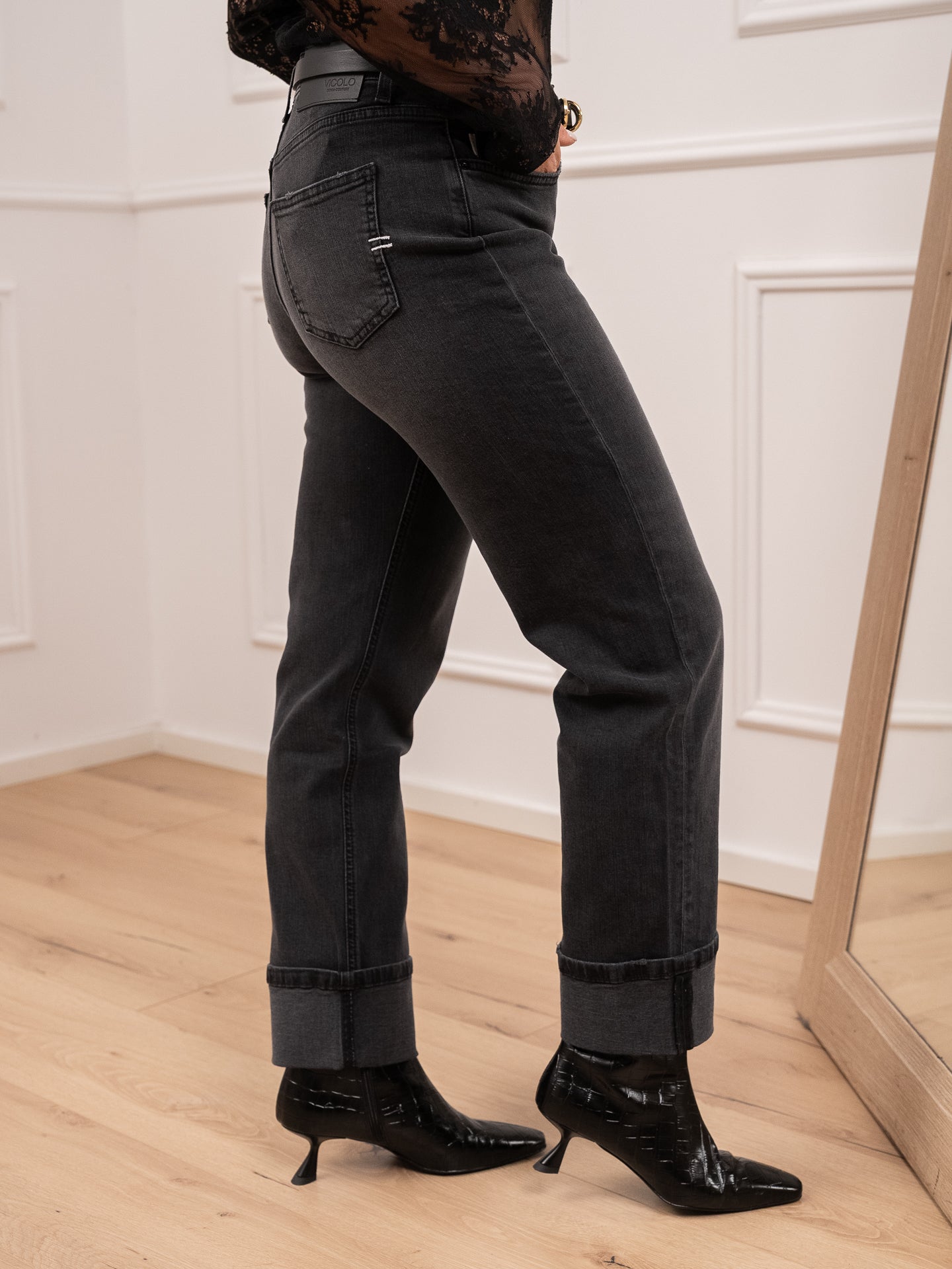 Jenas Maggie color nero con risvolto Vicolo. Modello mom fit a vita alta, chiusura bottone e zip. Dettaglio di risvolto sul fondo.