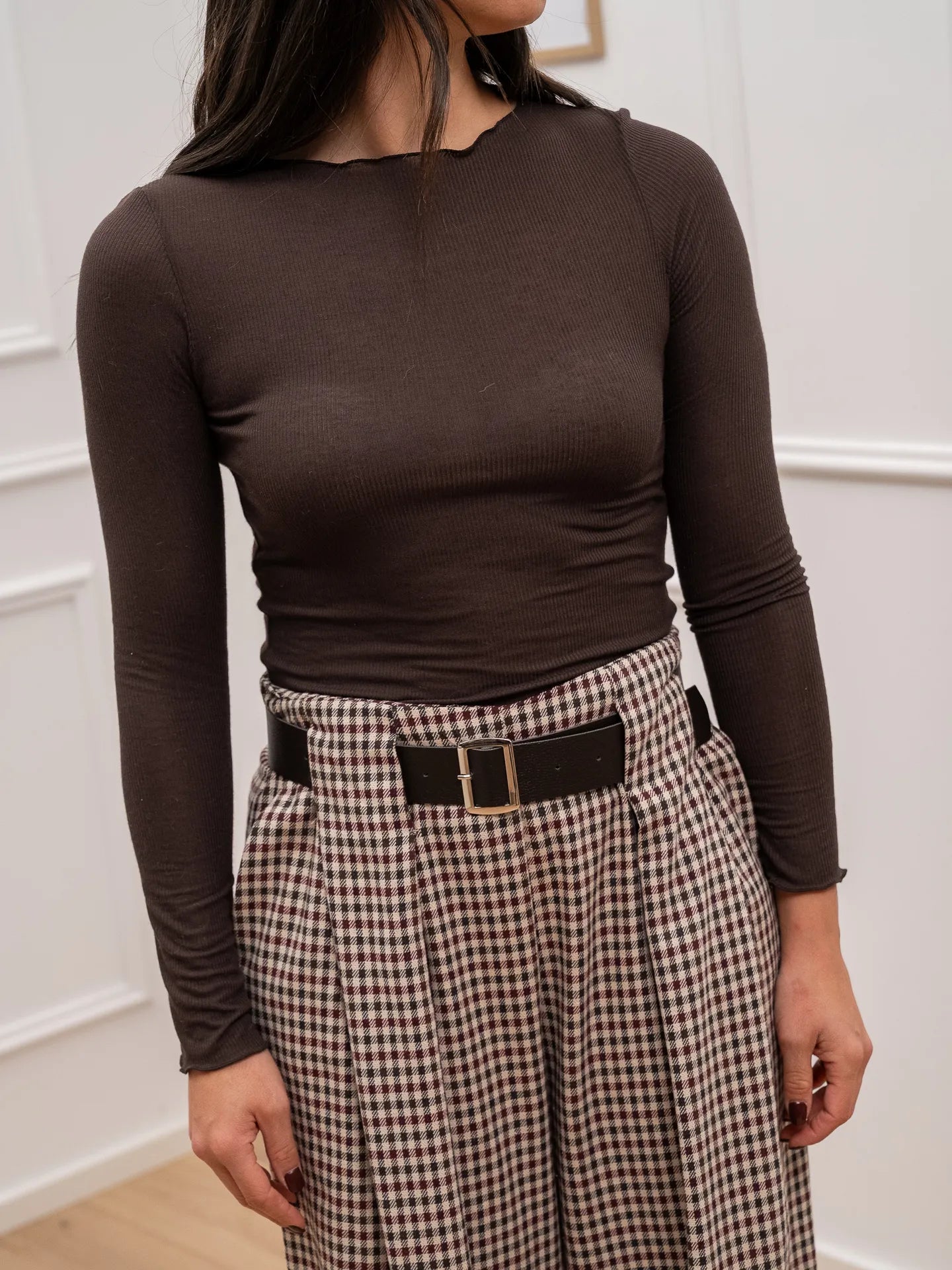 Maglia a costine color moro in cashmere, Modello girocollo a manica lunga. Ricciolo sui bordi. Fit regolare.