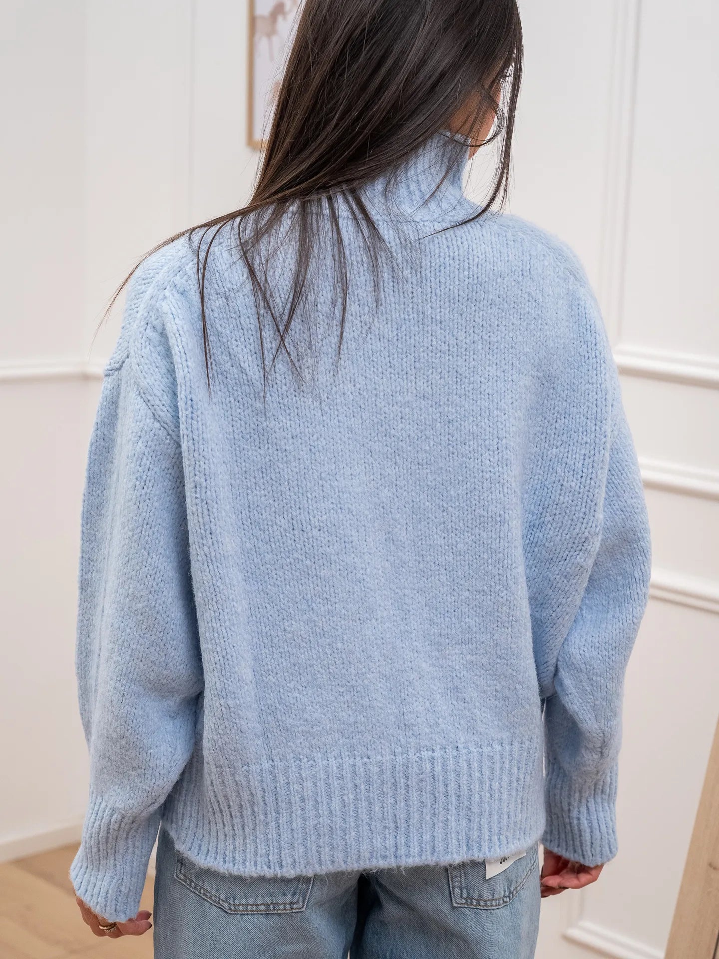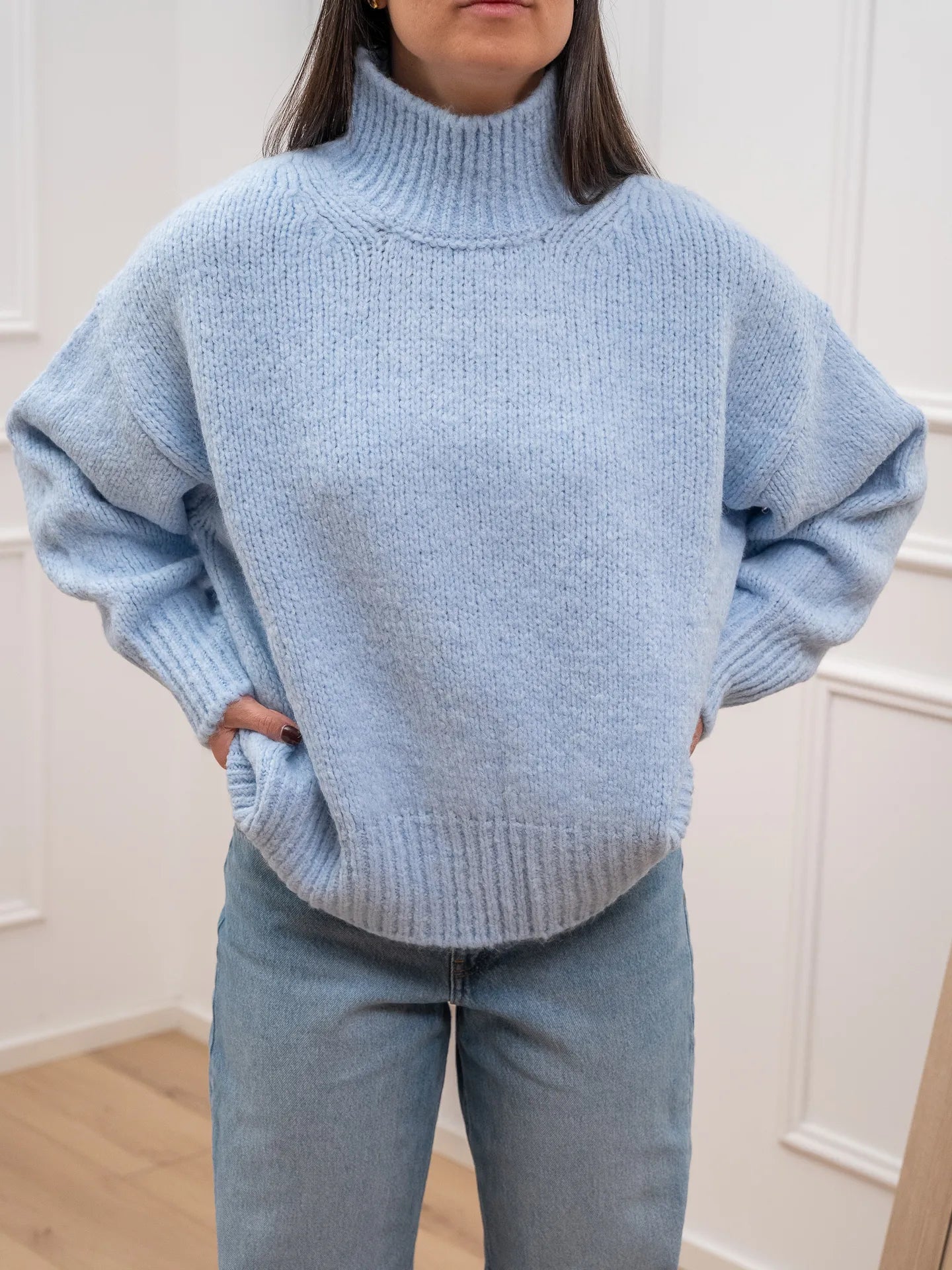 Maglia color azzurro soffice Vicolo. Modello collo alto a cratere, fit morbido con manica lunga a palloncino e spalla scesa. Finiture a coste.