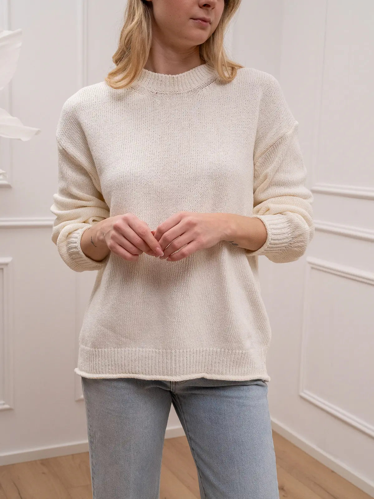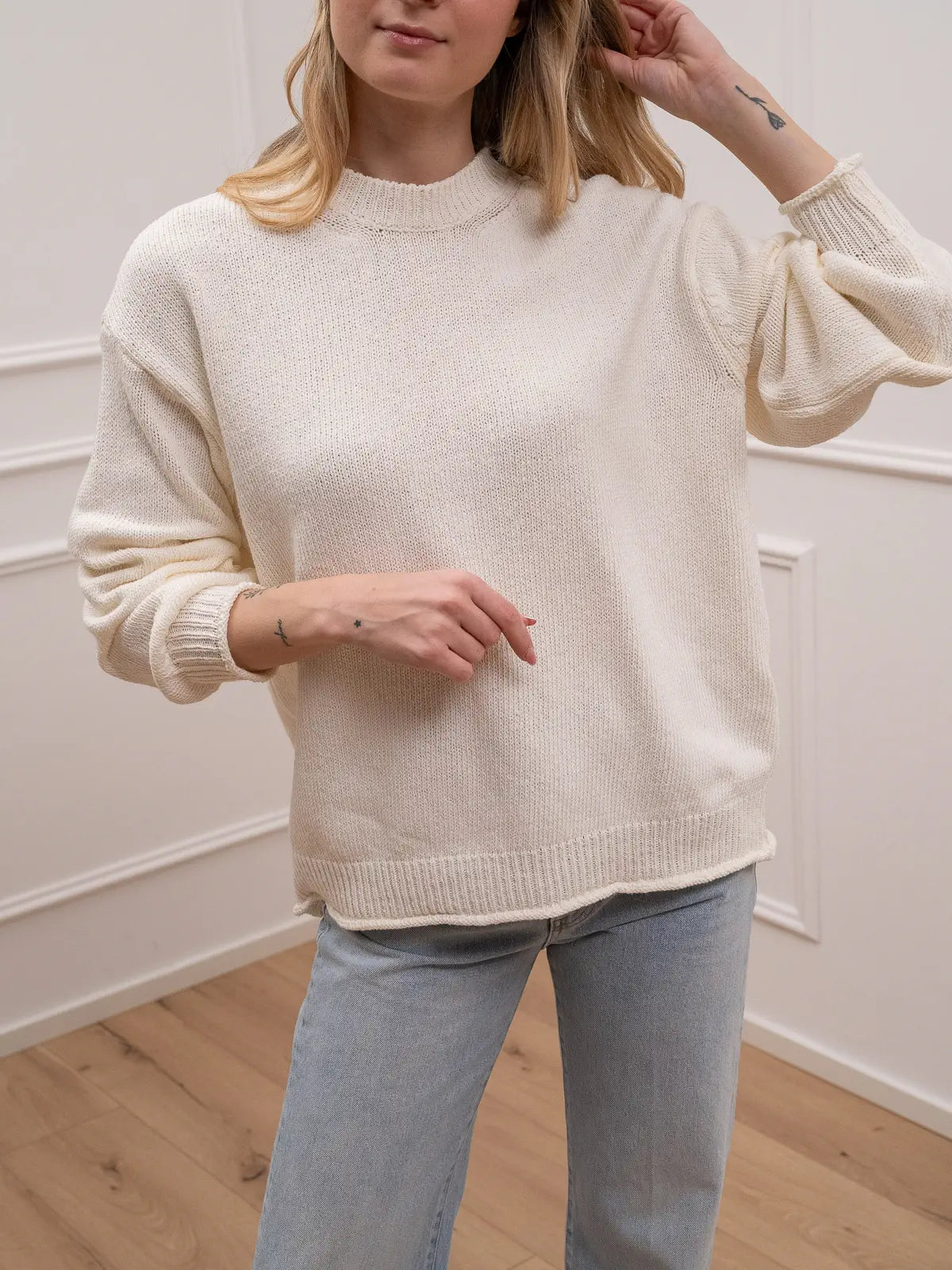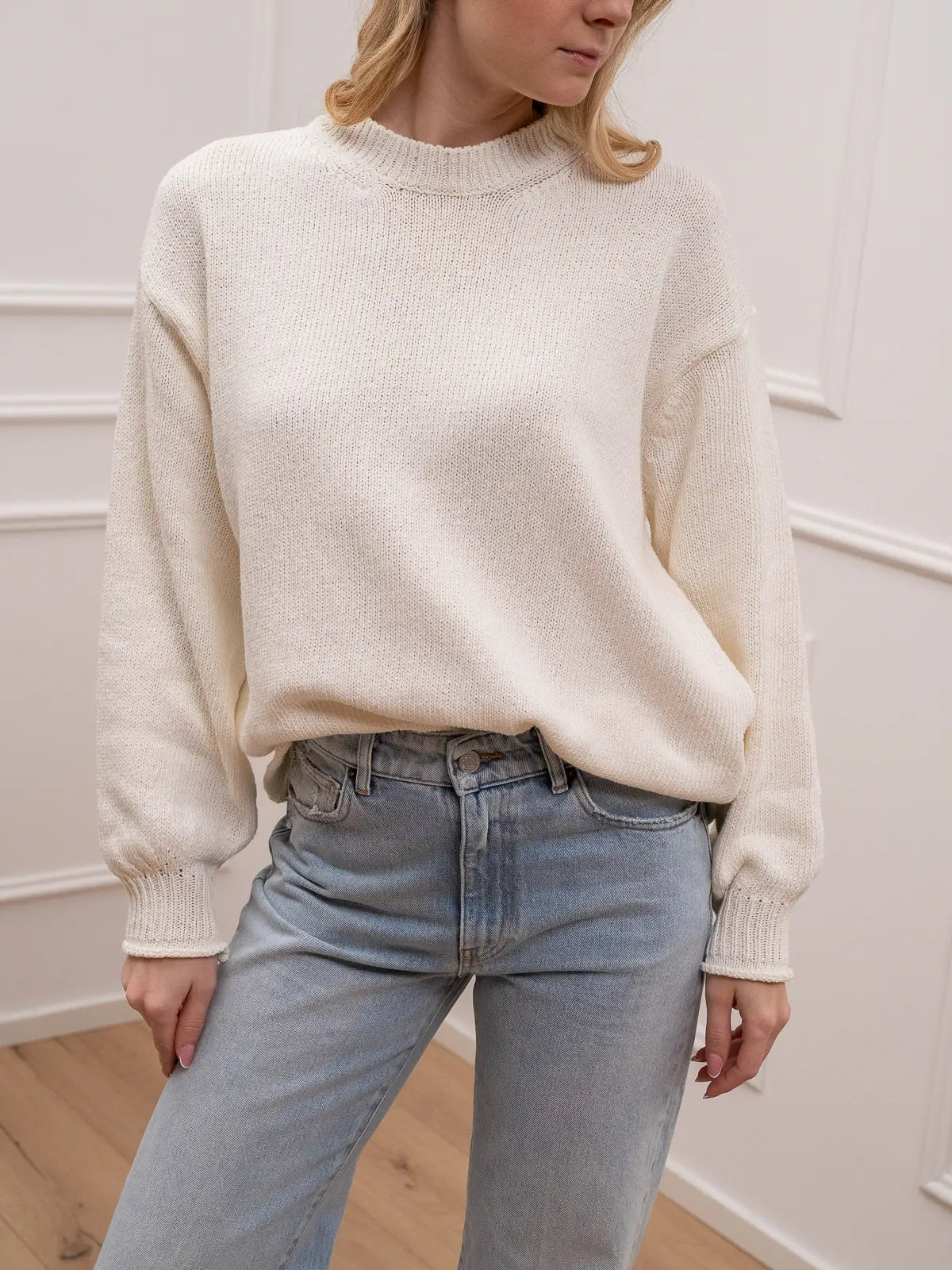 Maglia color burro in cotone riciclato Vicolo. Modello girocollo fit over con manica a palloncino e polsino sul fondo. Dettaglio di bordi con ricciolo.