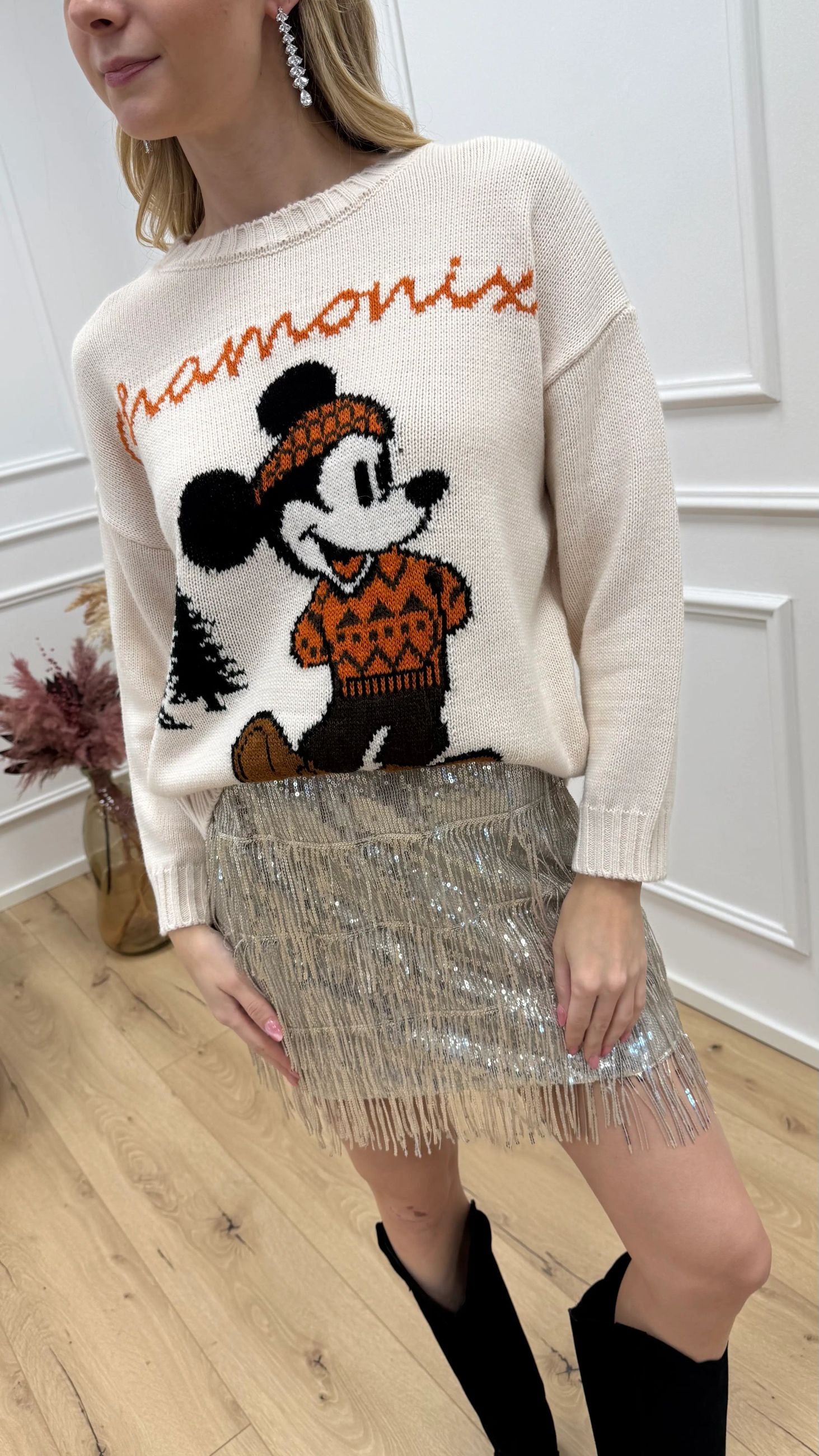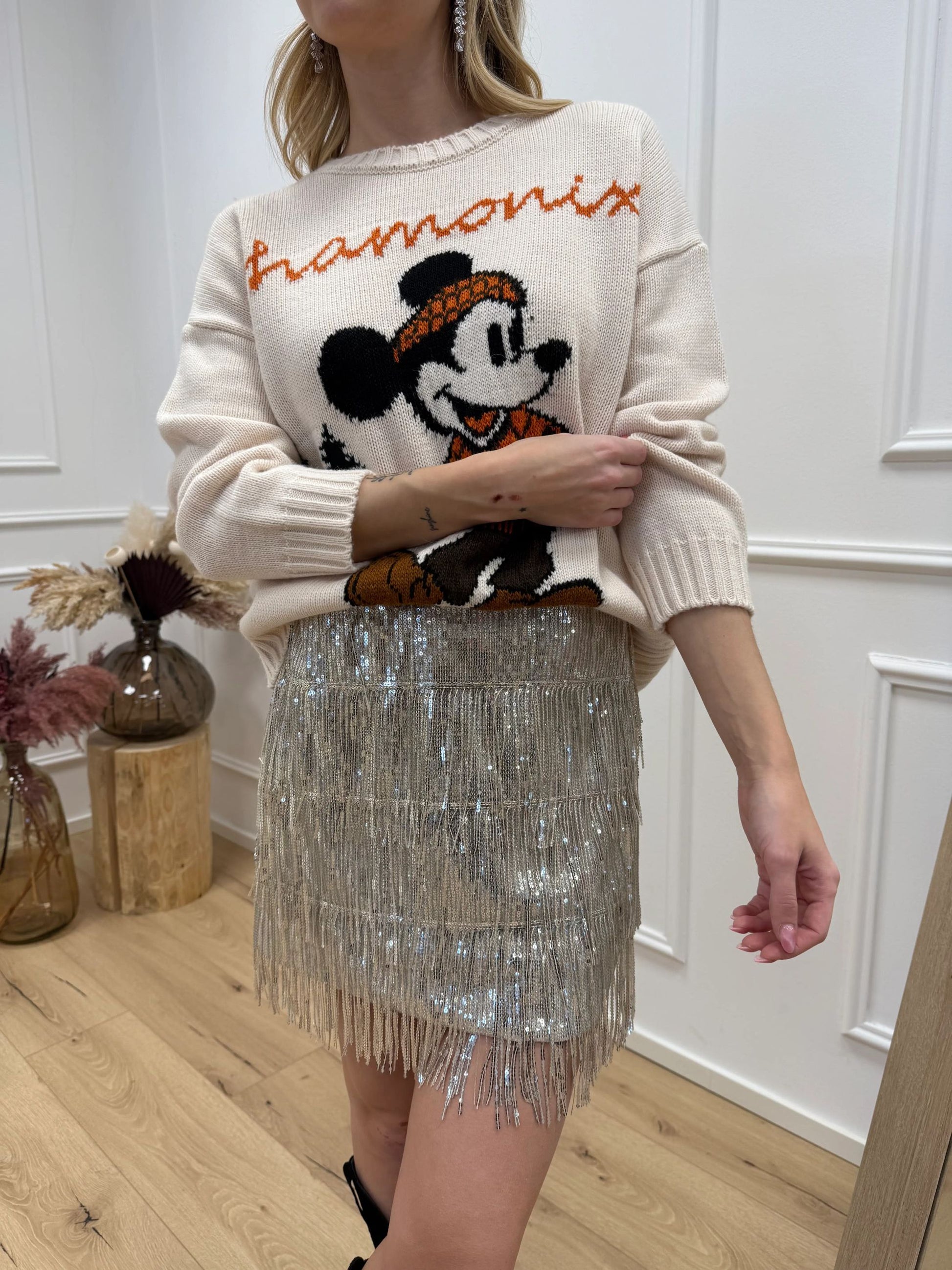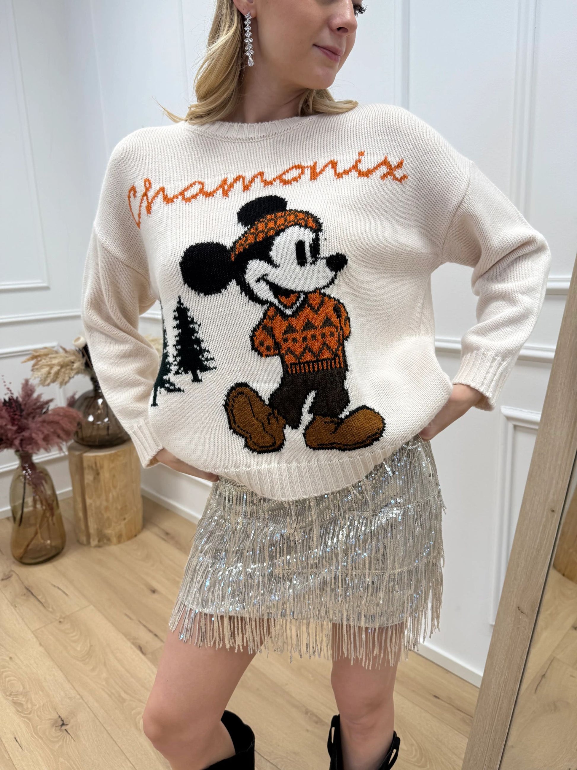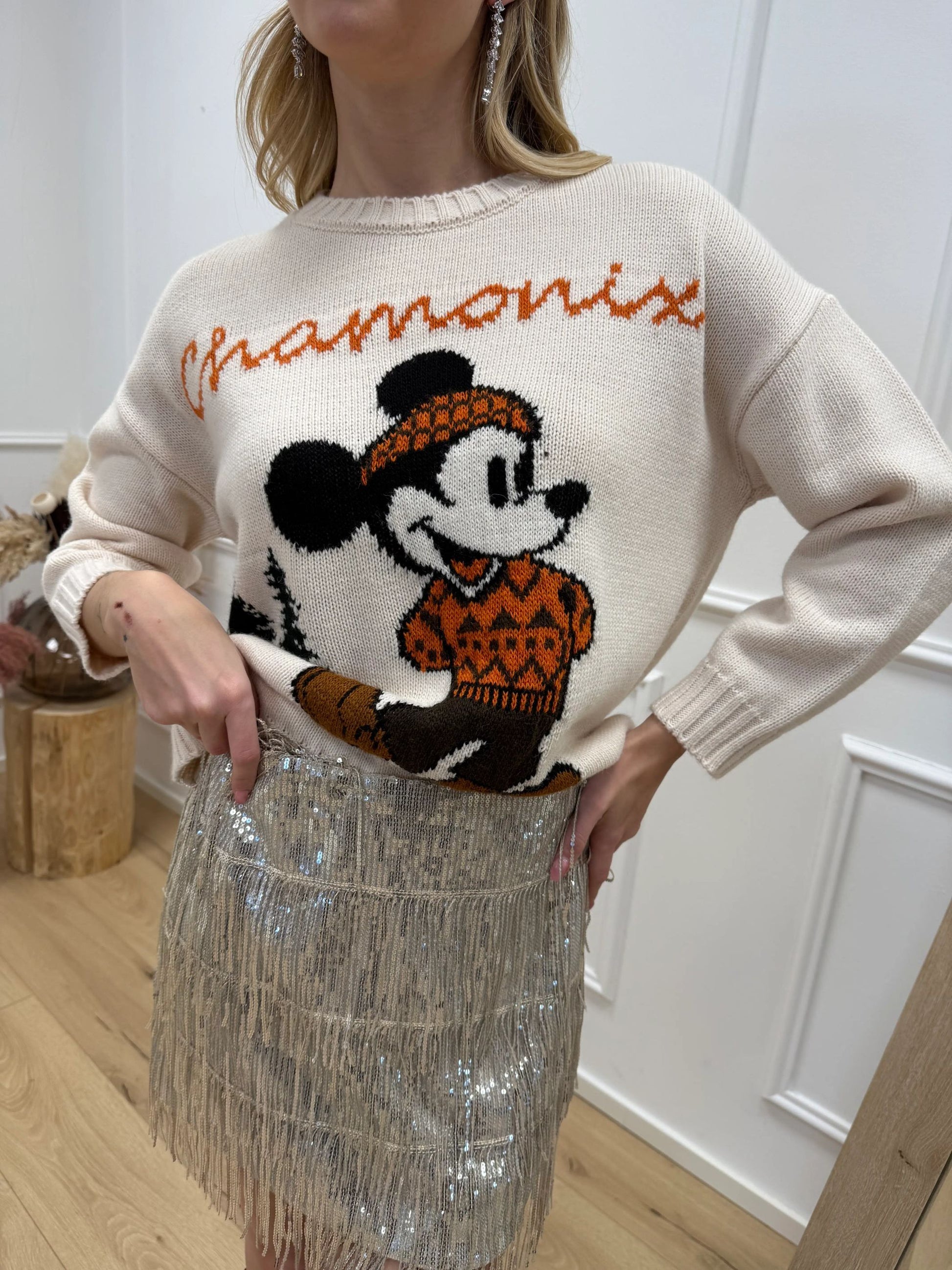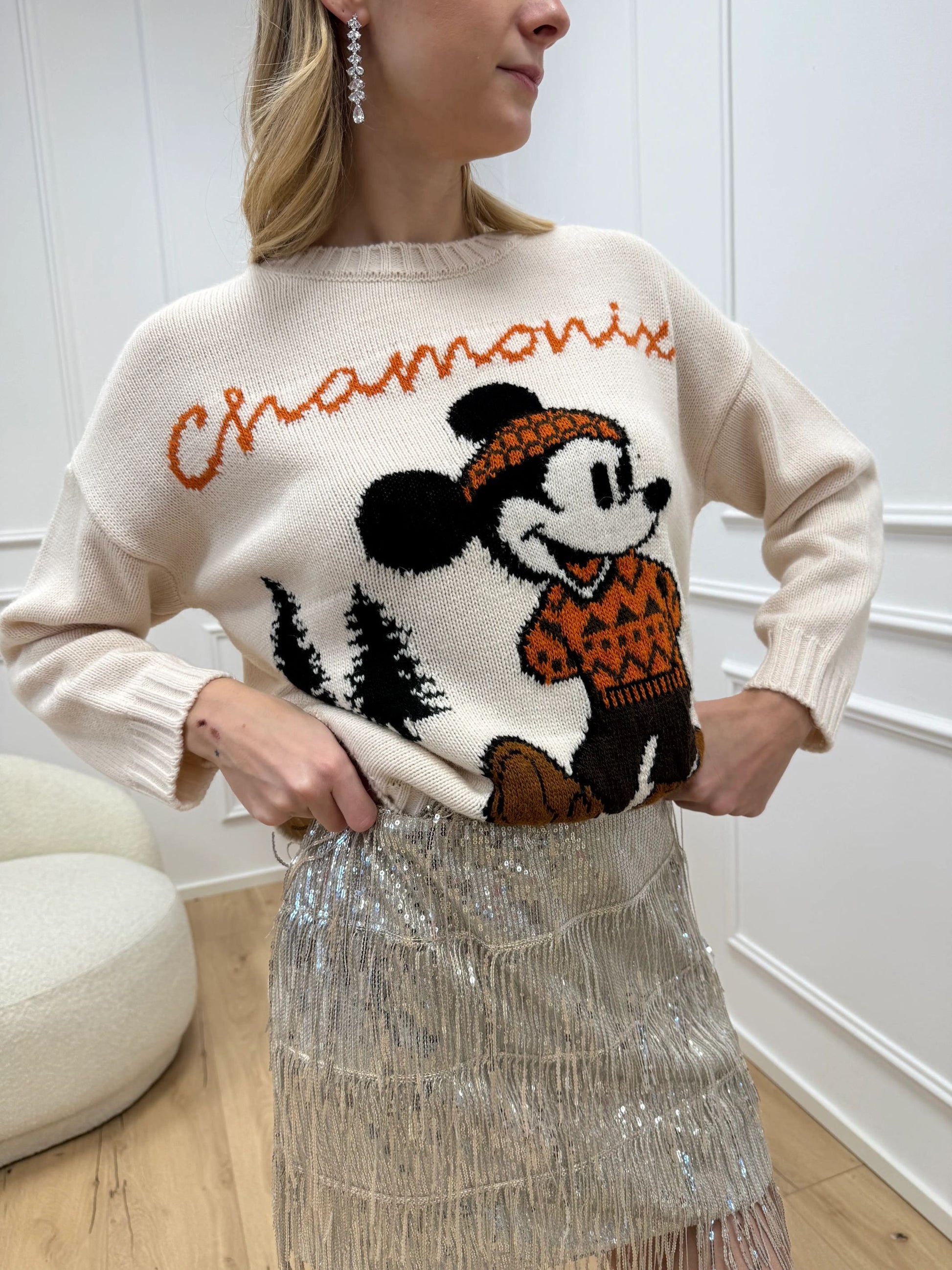 Maglia color burro HaveOne. Modello girocollo a manica lunga. Finiture a coste. Dettaglio di ricamo Topolino a contrasto sui toni del nero, coccio, verde.
