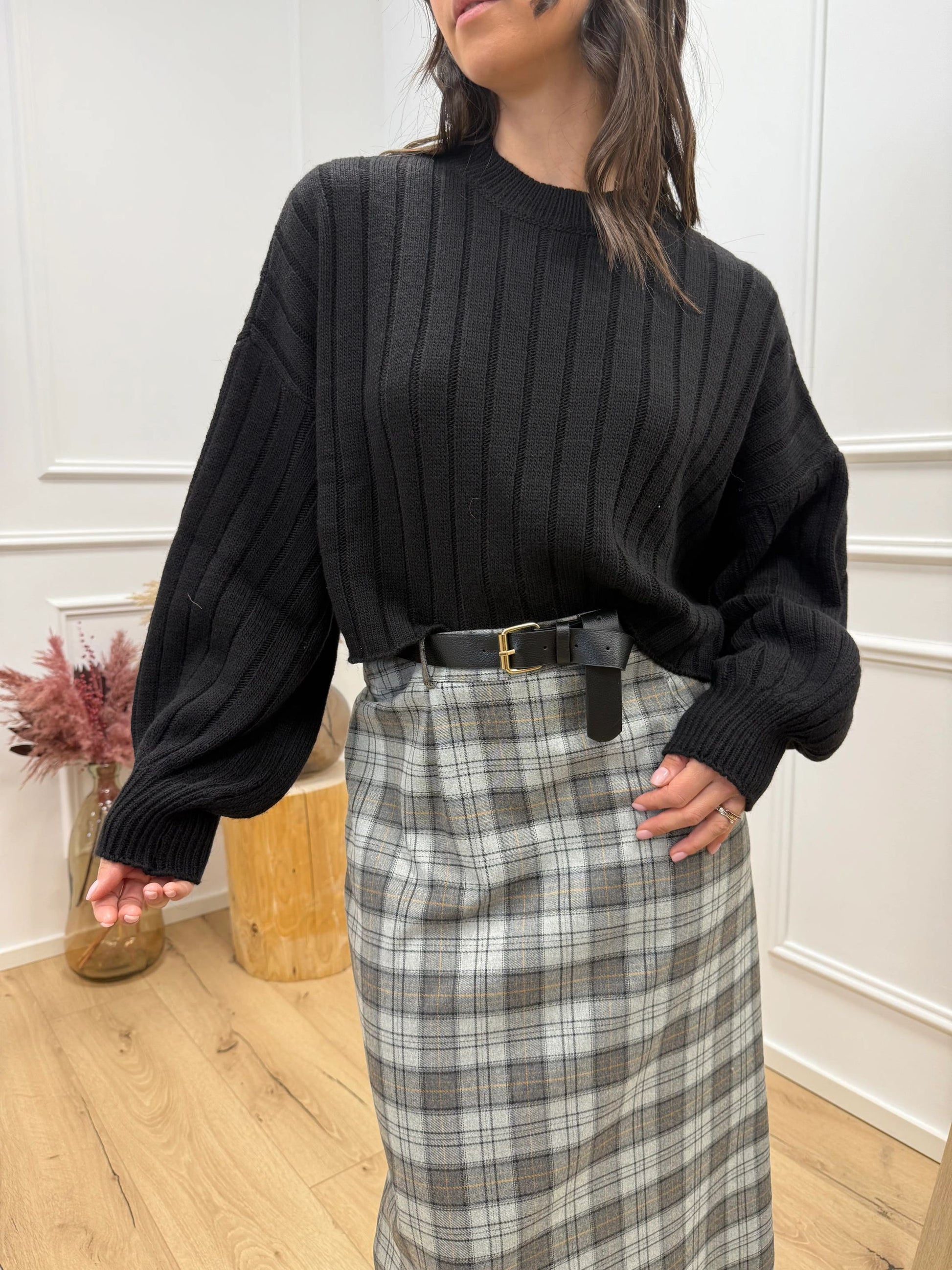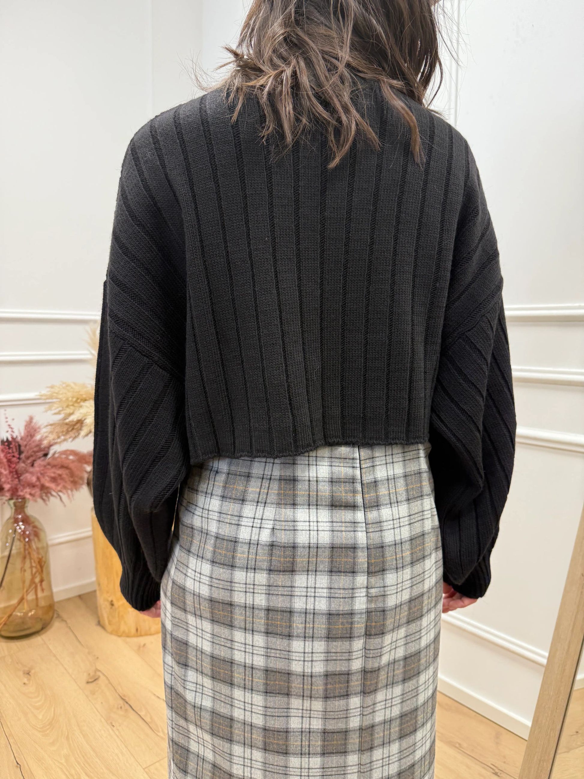 Maglia a coste color nero HaveOne. Modello fit cropped girocollo con dettaglio di maxi manica balloon e polsino stretto sul fondo.