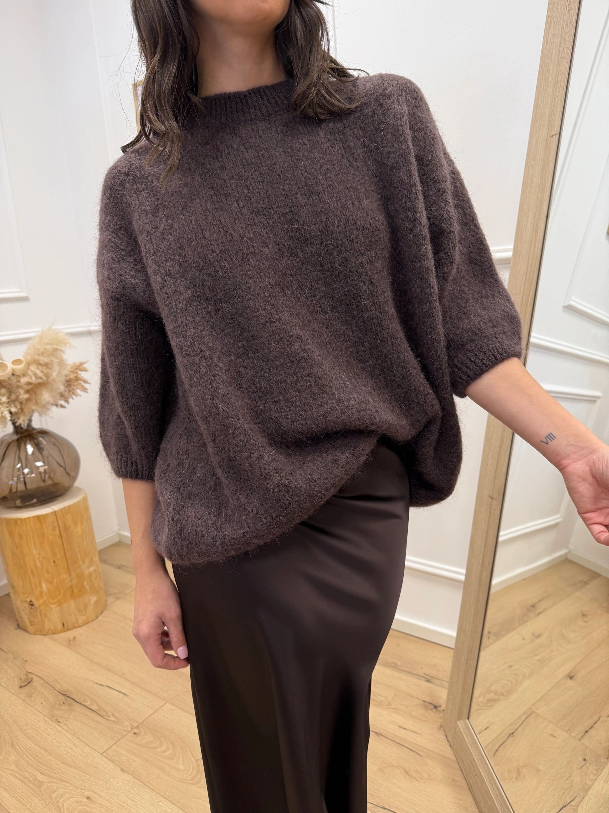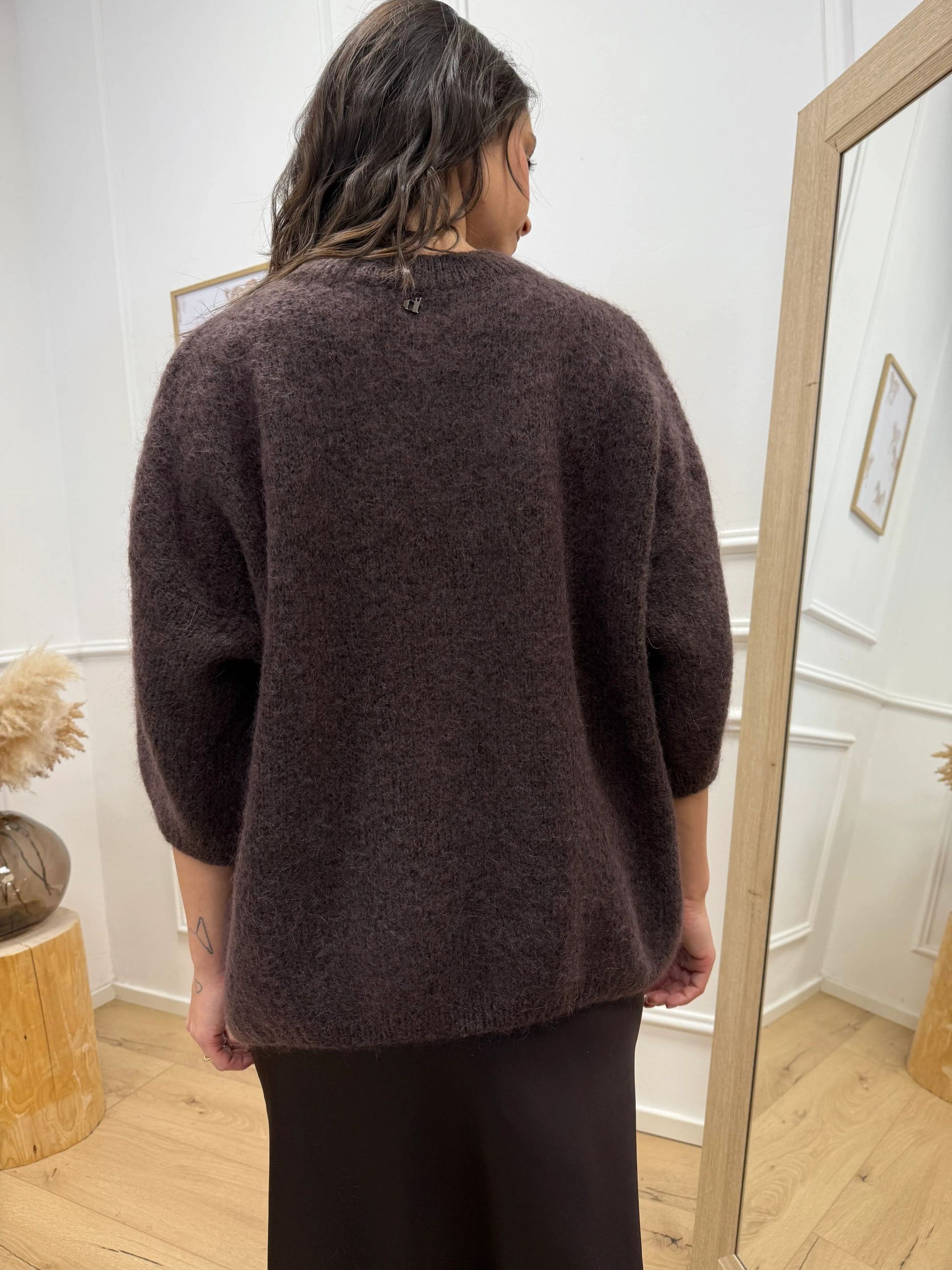 Maglia Gaia color moro in mohair Dixie. Modello fit morbido girocollo, mezza manica balloon. Finiture a costine.