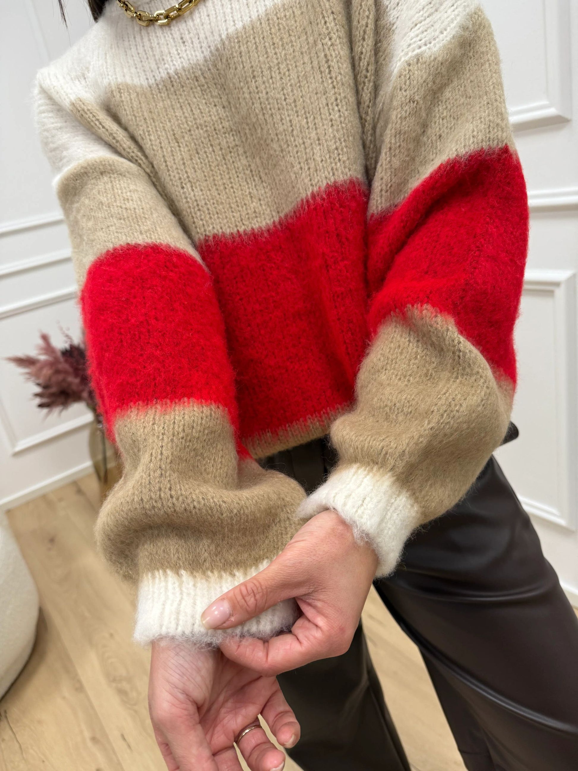 Maglia garzata a righe cammello, panna, mastice e rosso - HaveOne