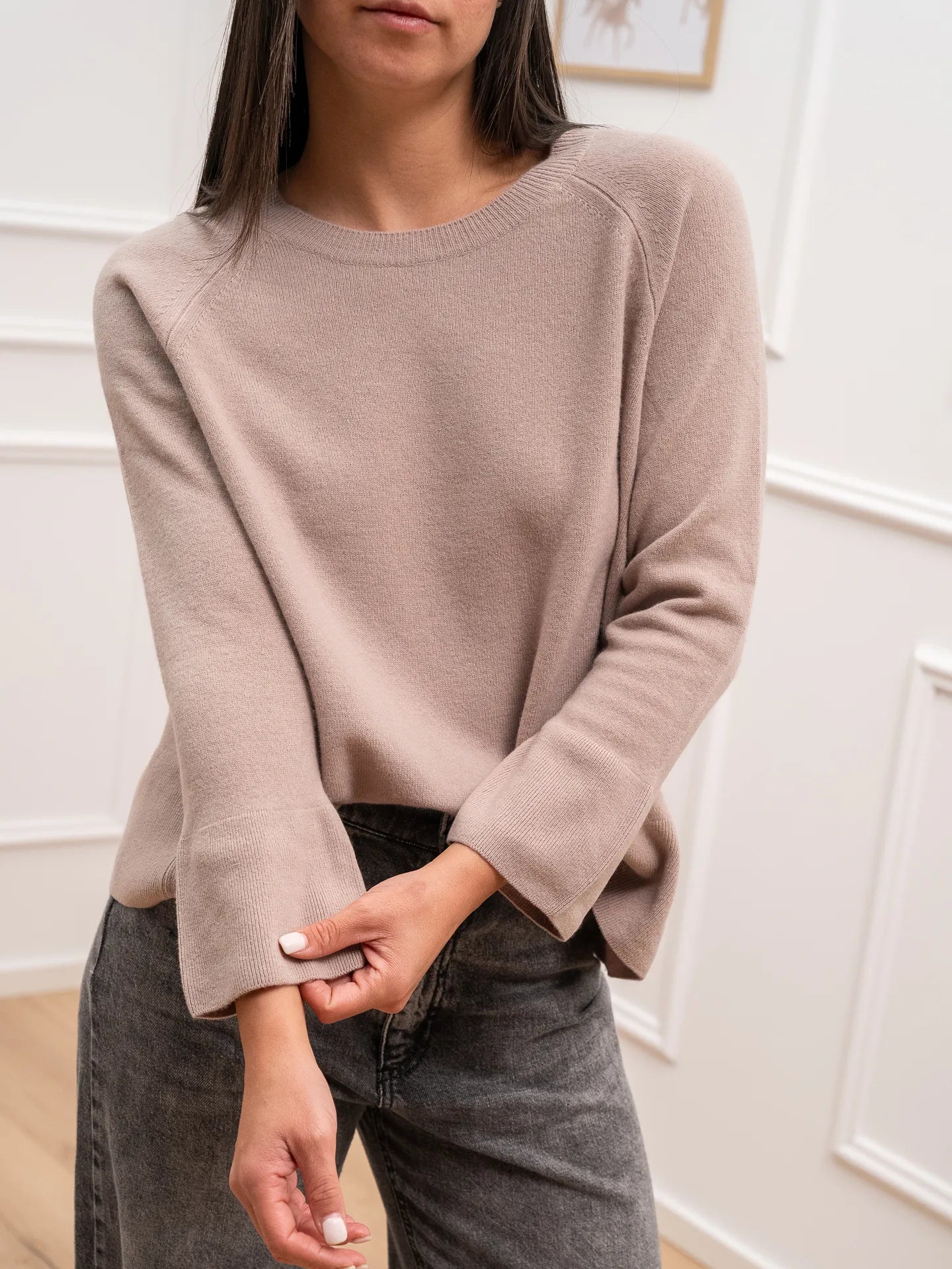 Maglia color beige 100% lana HaveOne. Modello girocollo fit morbido con maniche lunghe e polsino scampanato. Finiture a costine.